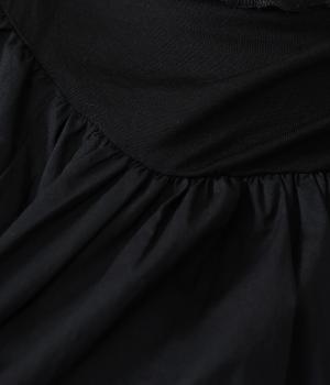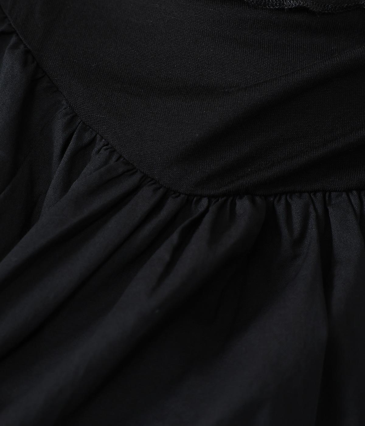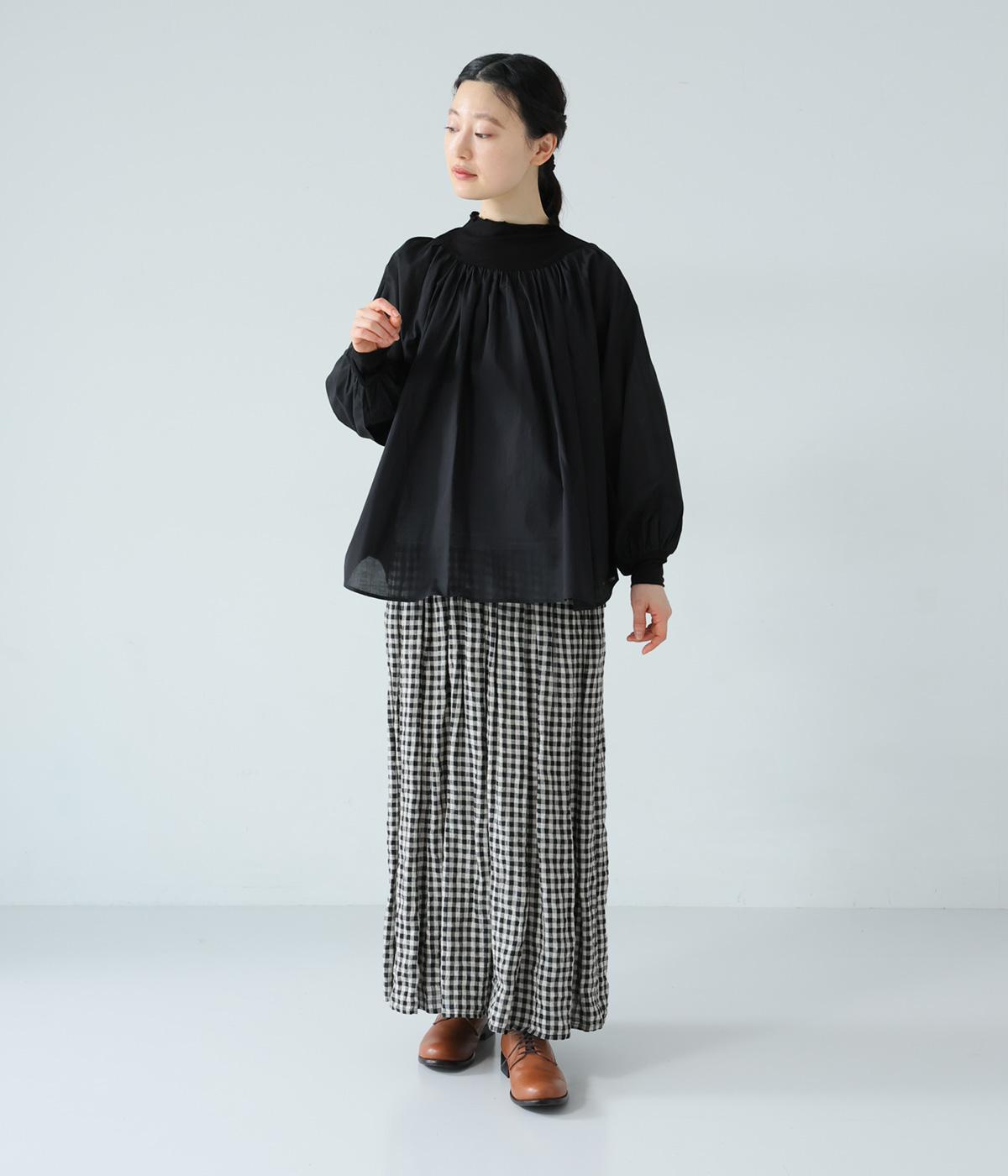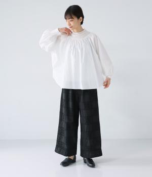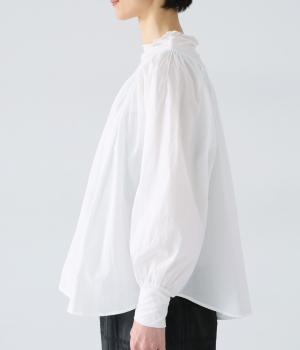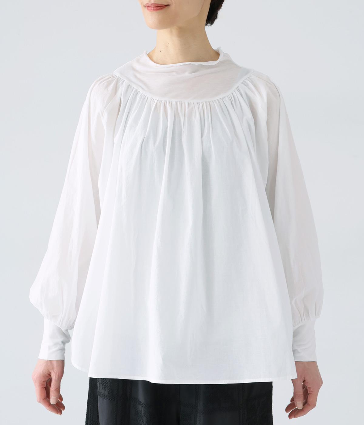 それぞれの生地の風合いをいかした異素材ミックスのブラウス。襟ぐりと袖口の切り替えにギャザーを入れて、ふんわりとした女性らしいシルエットに仕上げました。一枚でもインナーとしても着まわしのきく便利なアイテムです。