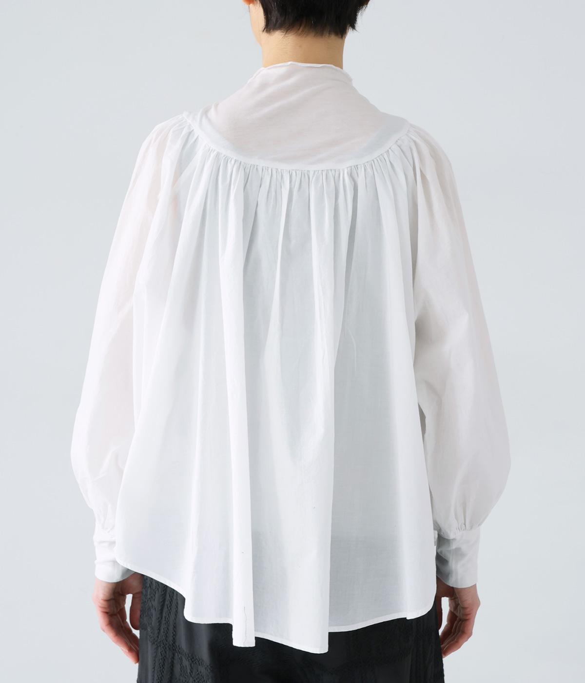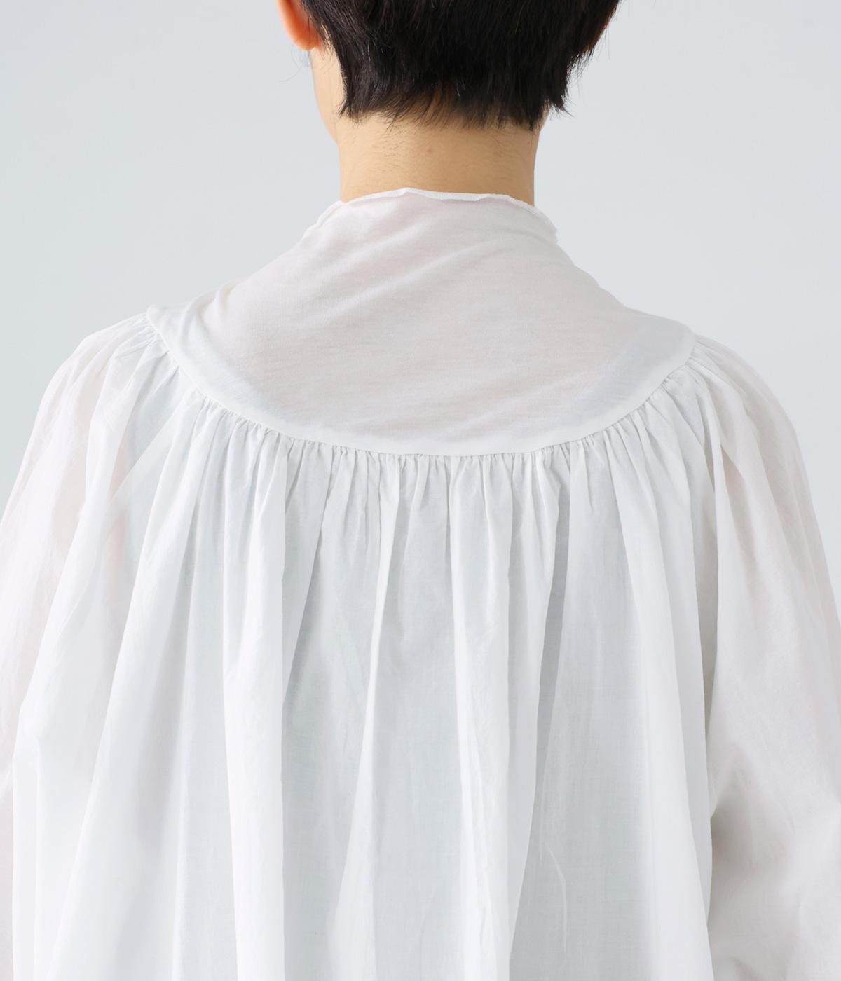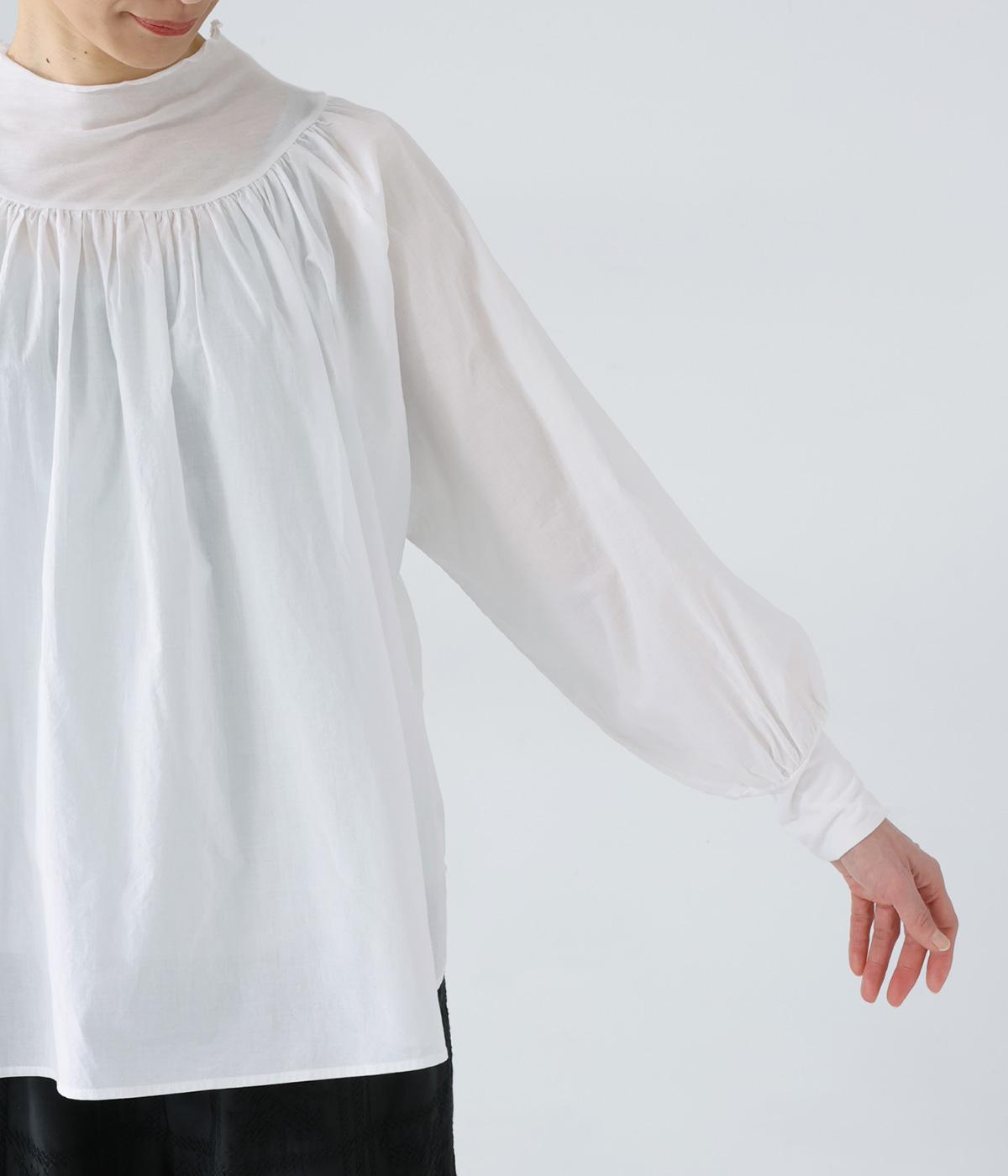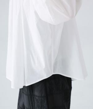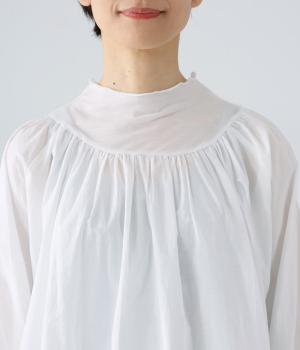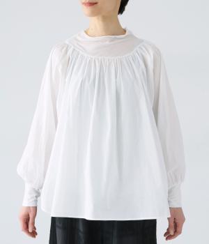 伸びがよく透け感があり、肌あたりのよいテンセル天竺をネックからヨークにかけてと袖口に使用。薄くて軽く、ハリ感のあるコットンキャンブリックボイルを身頃と袖に使用しています。