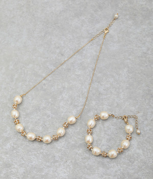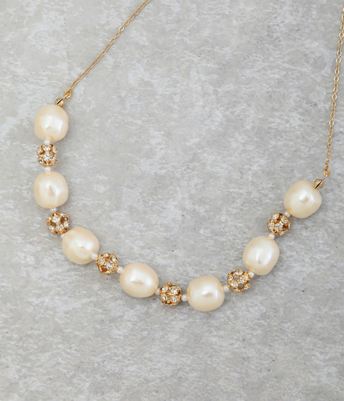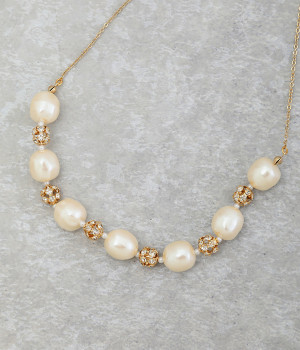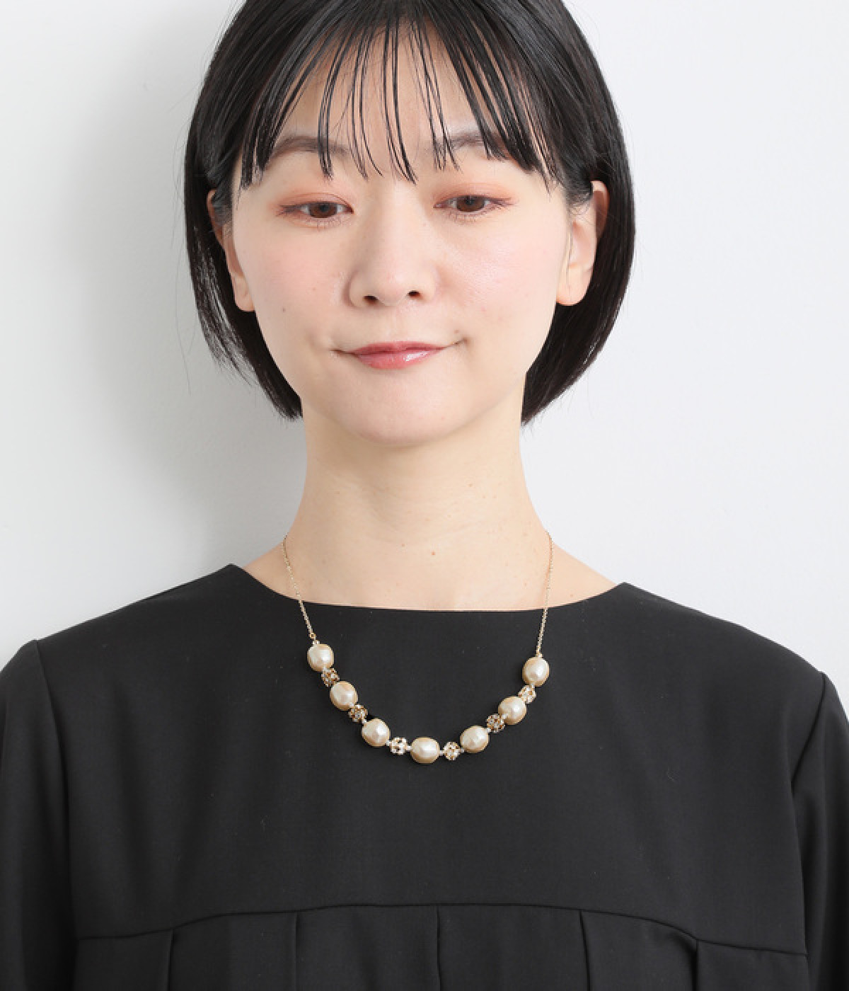 ナチュラルな輝きが美しい淡水パールと上品なきらめきの丸いロンデルビーズを贅沢に使ったネックレスです。結婚式やパーティなどのお呼ばれシーンにもピッタリな華やかなアイテム。シンプルなワンピースにプラスするだけで優雅な印象に。同シリーズのイヤーアクセサリーやブレスレットと一緒に使うのもオススメです。