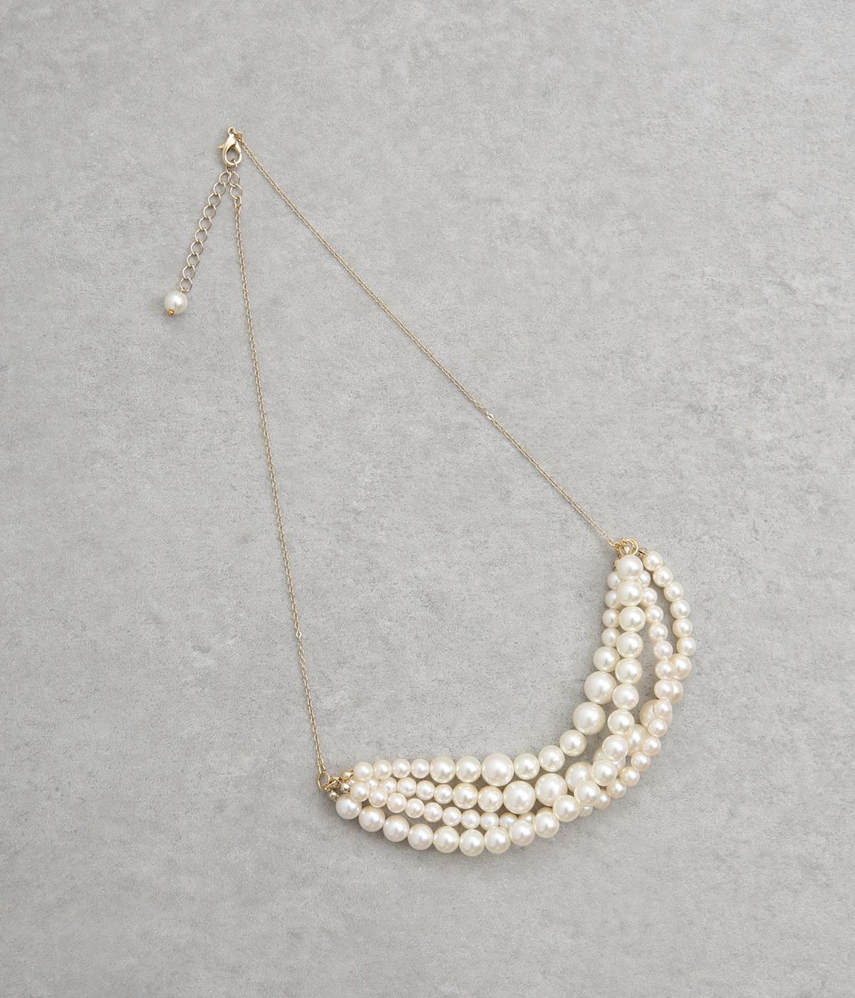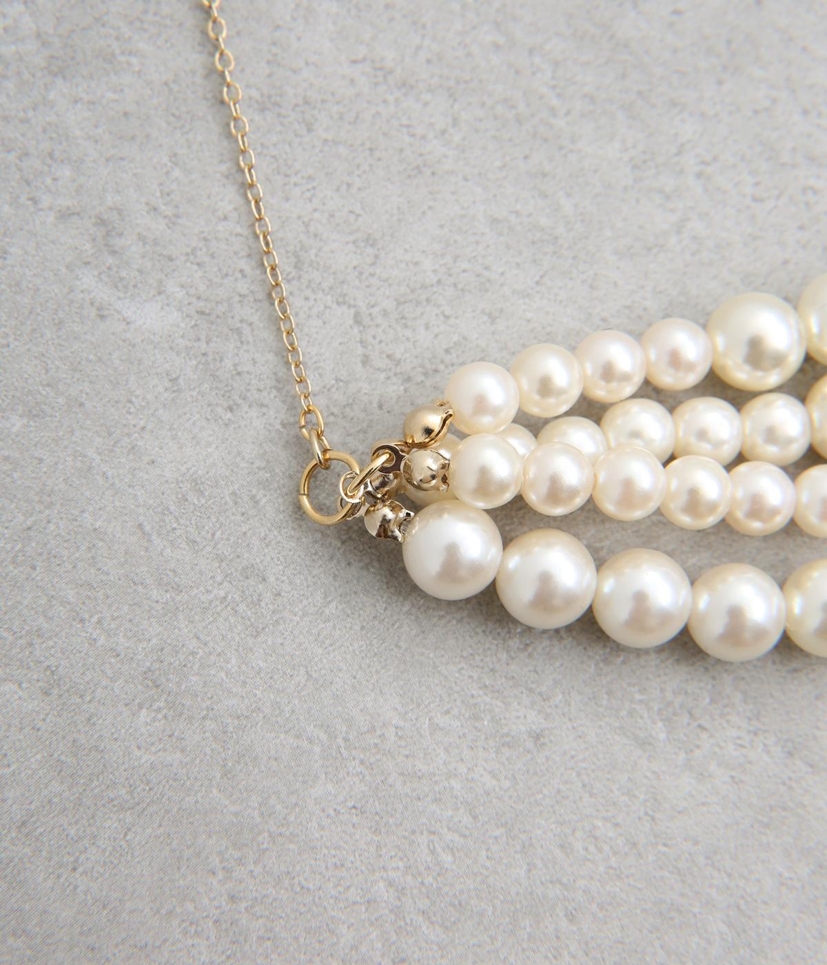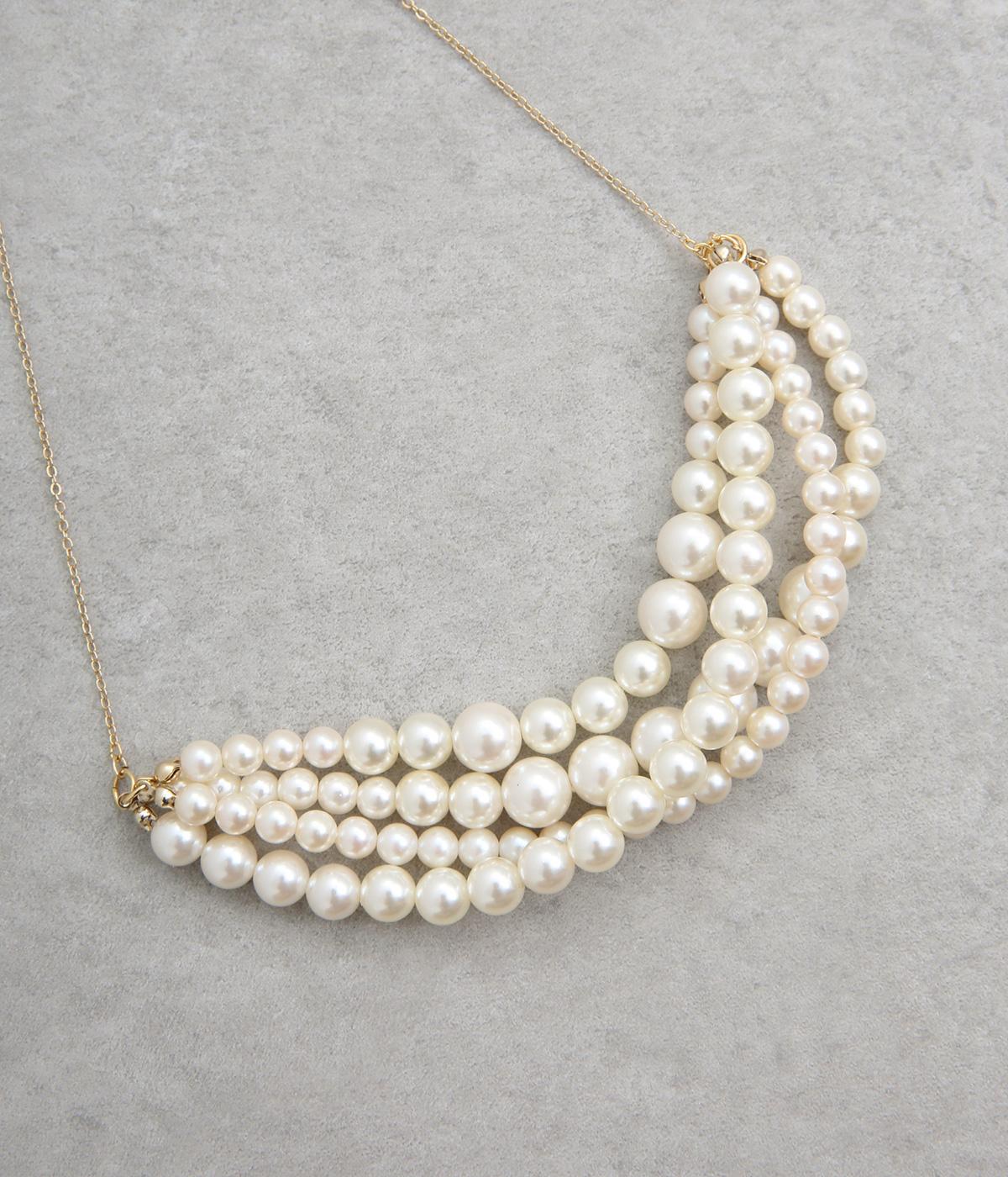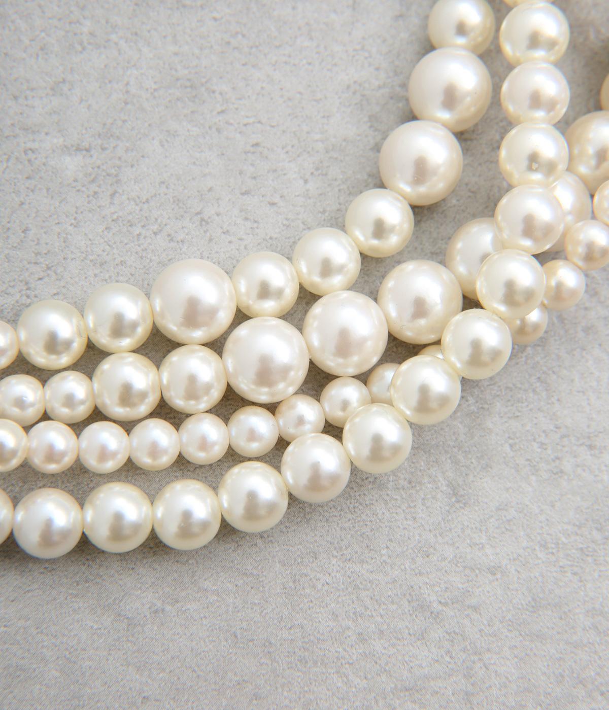 粒の大きさが異なるパールを四連に重ね、奥行きのある美しいボリュームを演出しました。中央にパールを集めたデザインが、華やかさと上品さのバランスを整えます。華美すぎないほどよい存在感なので、シーンを問わずに使える万能なネックレスです。