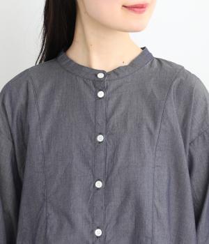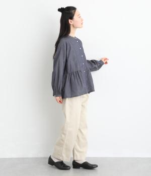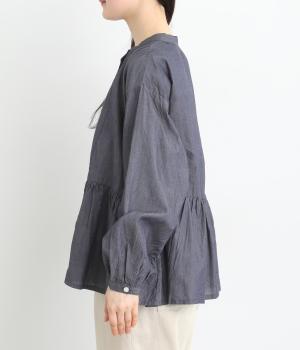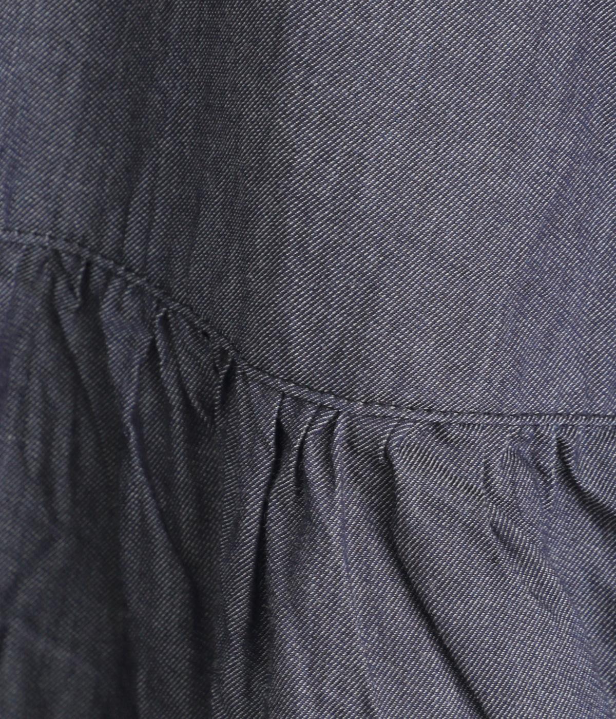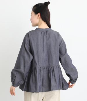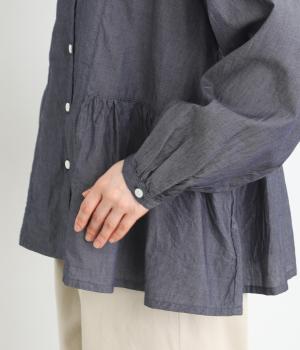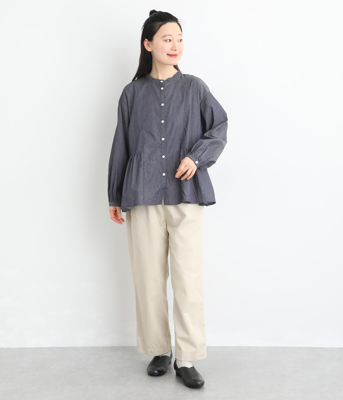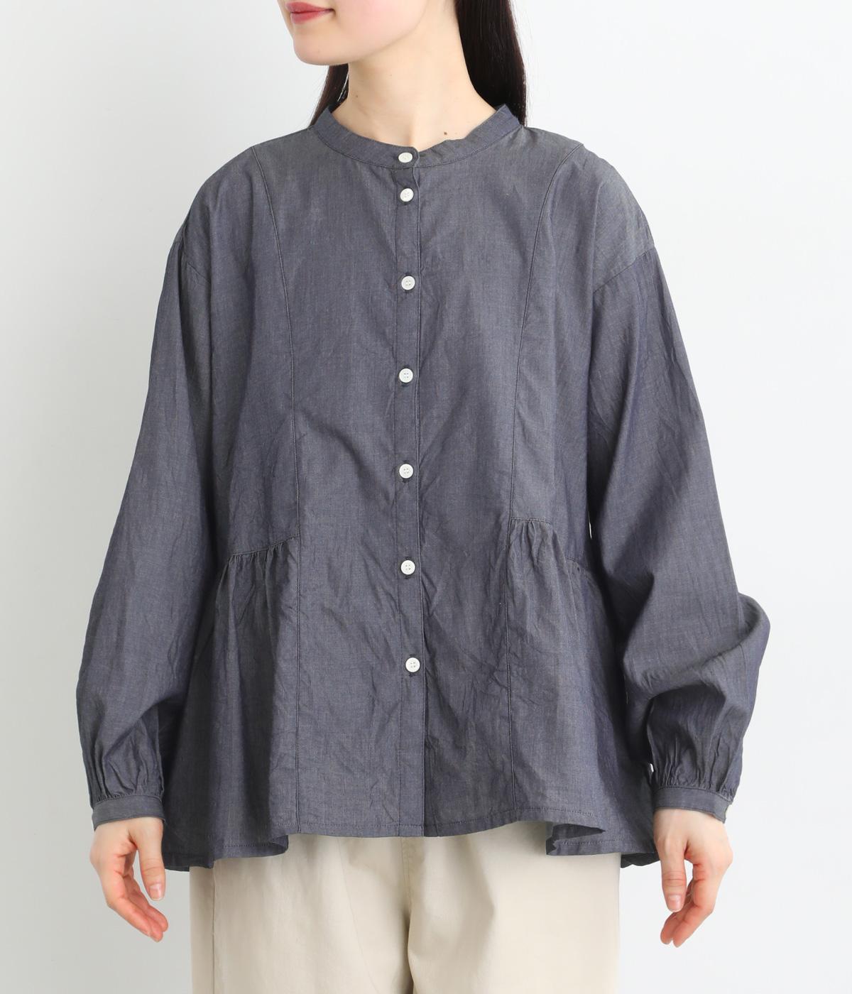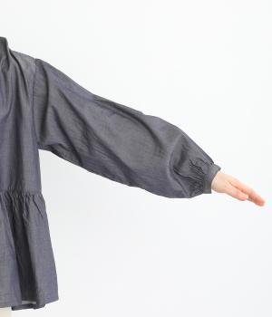 デニムシャツでありながらふっくらと空気をはらむようにやわらかな着心地のブラウスです。ウエストのサイドからうしろにかけてギャザーをほどこし、気になる腰まわりをカバーしつつ、前はすっきりとした印象に仕上げました。