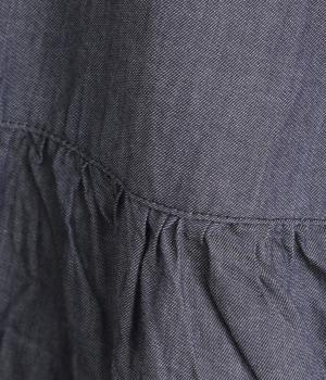 薄手で軽やかなコットンデニムを使用しています。なめらかな表面でふんわりと優しい着心地です。インディゴ染めならではの、洗うたびに変化する風合いが魅力の素材です。