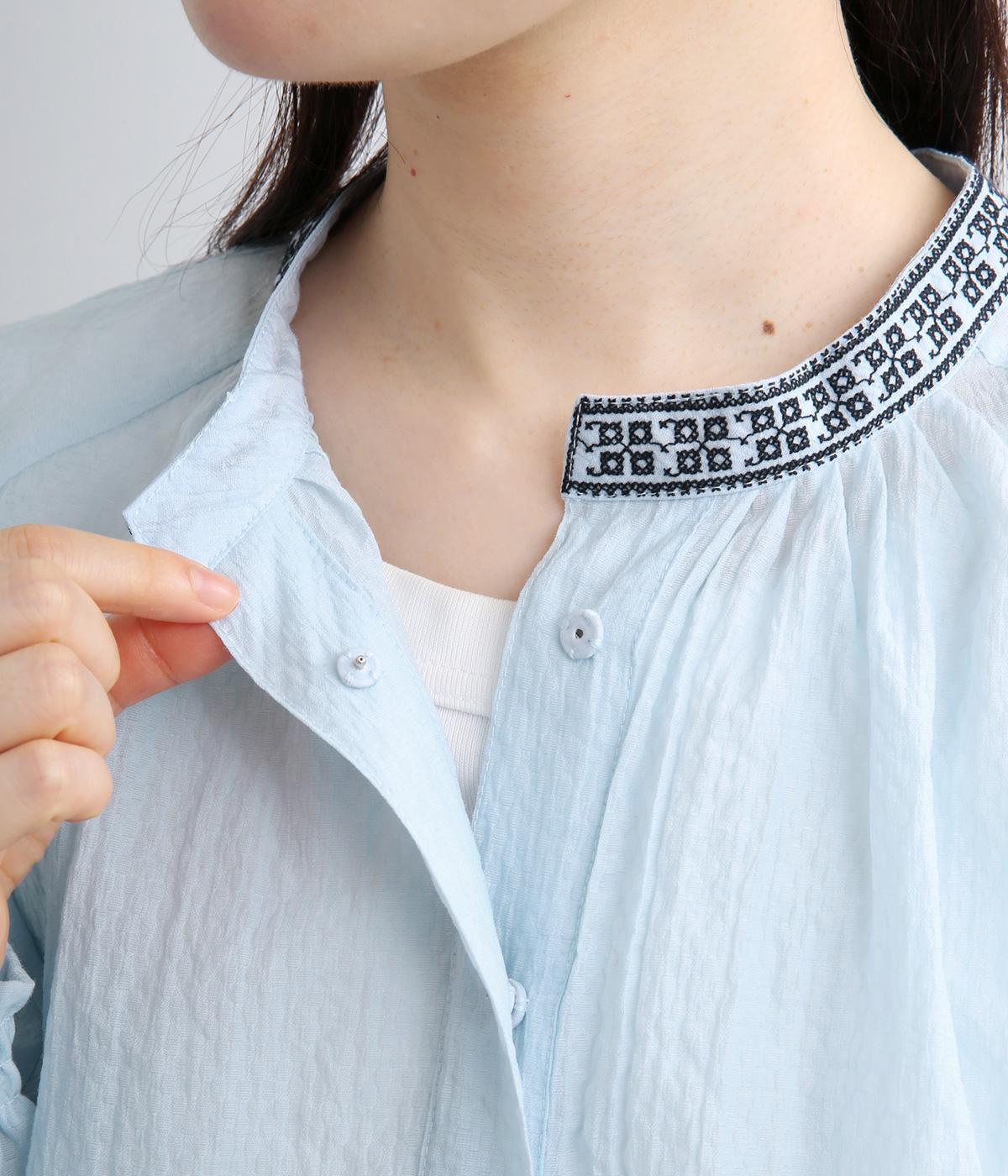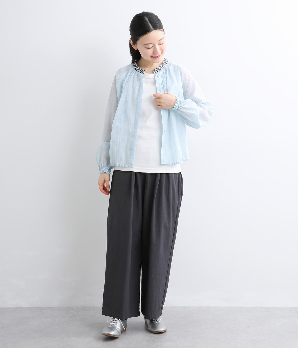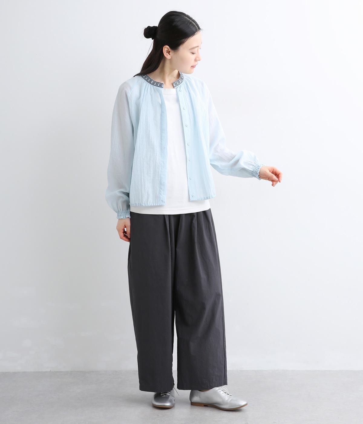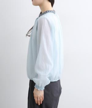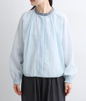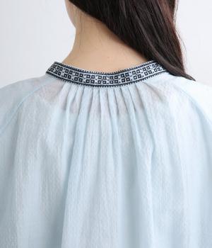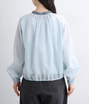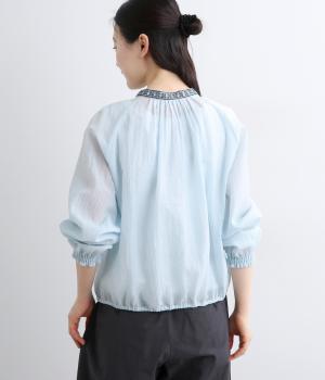 ドット風の織模様にシアーな素材感がレイヤードスタイルに奥行きを与える一枚。襟ぐりには刺しゅうを配してエスニックな要素をプラス。スナップボタン仕様でカーディガン感覚でも着まわしやすく、袖口ゴムギャザーでちょっとした手仕事時も便利です。