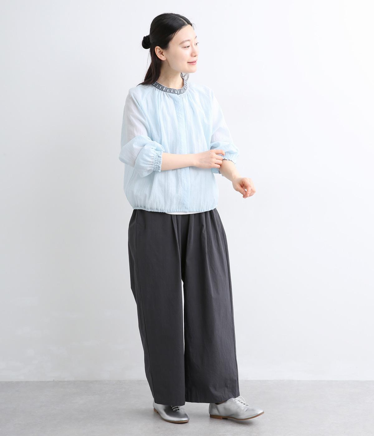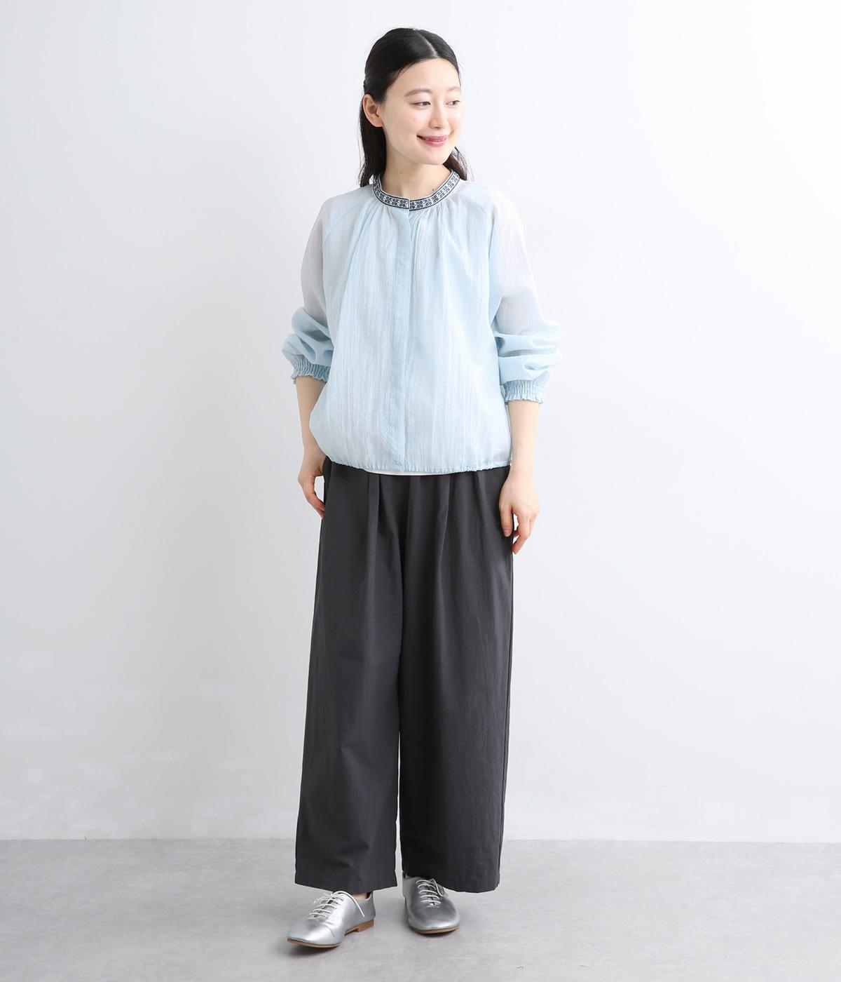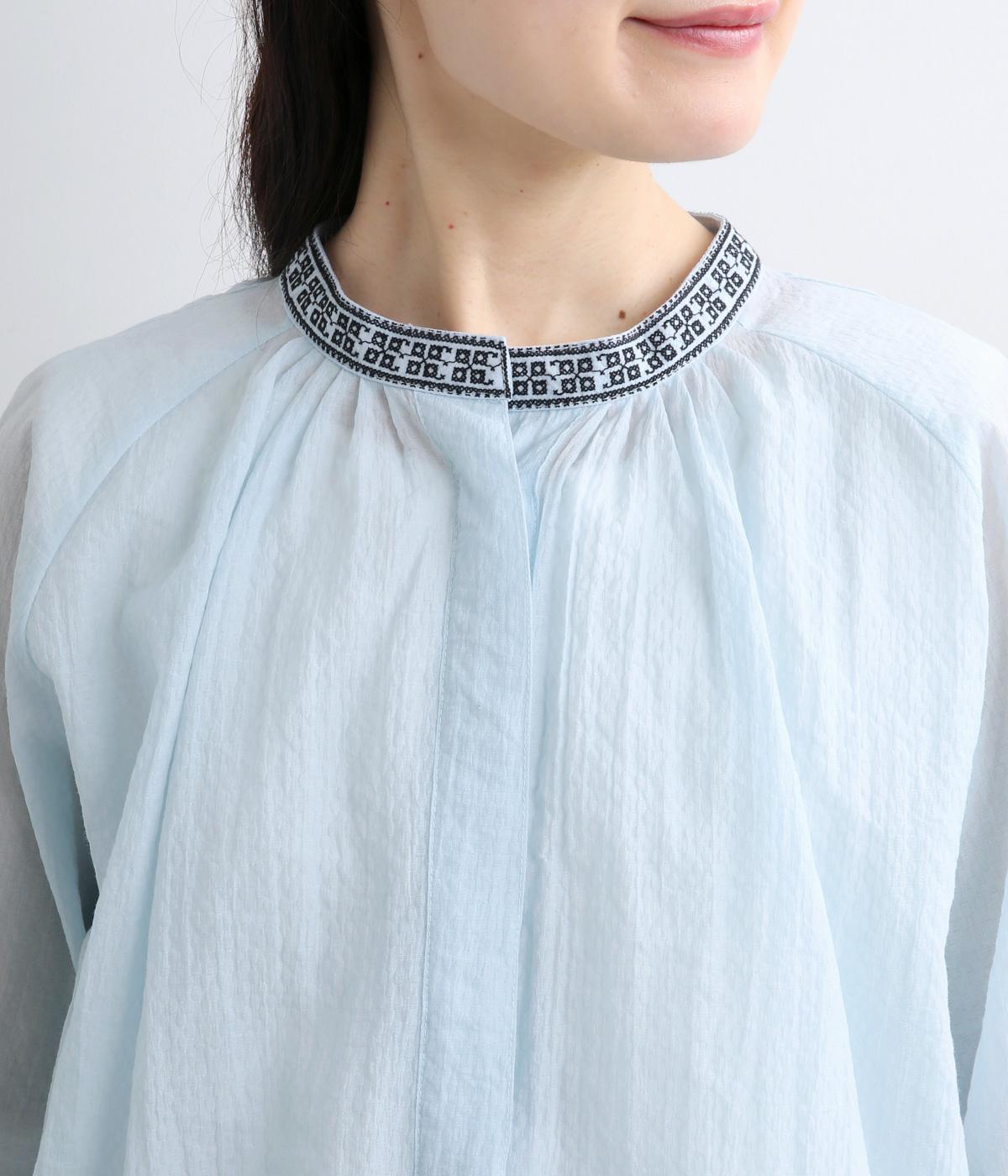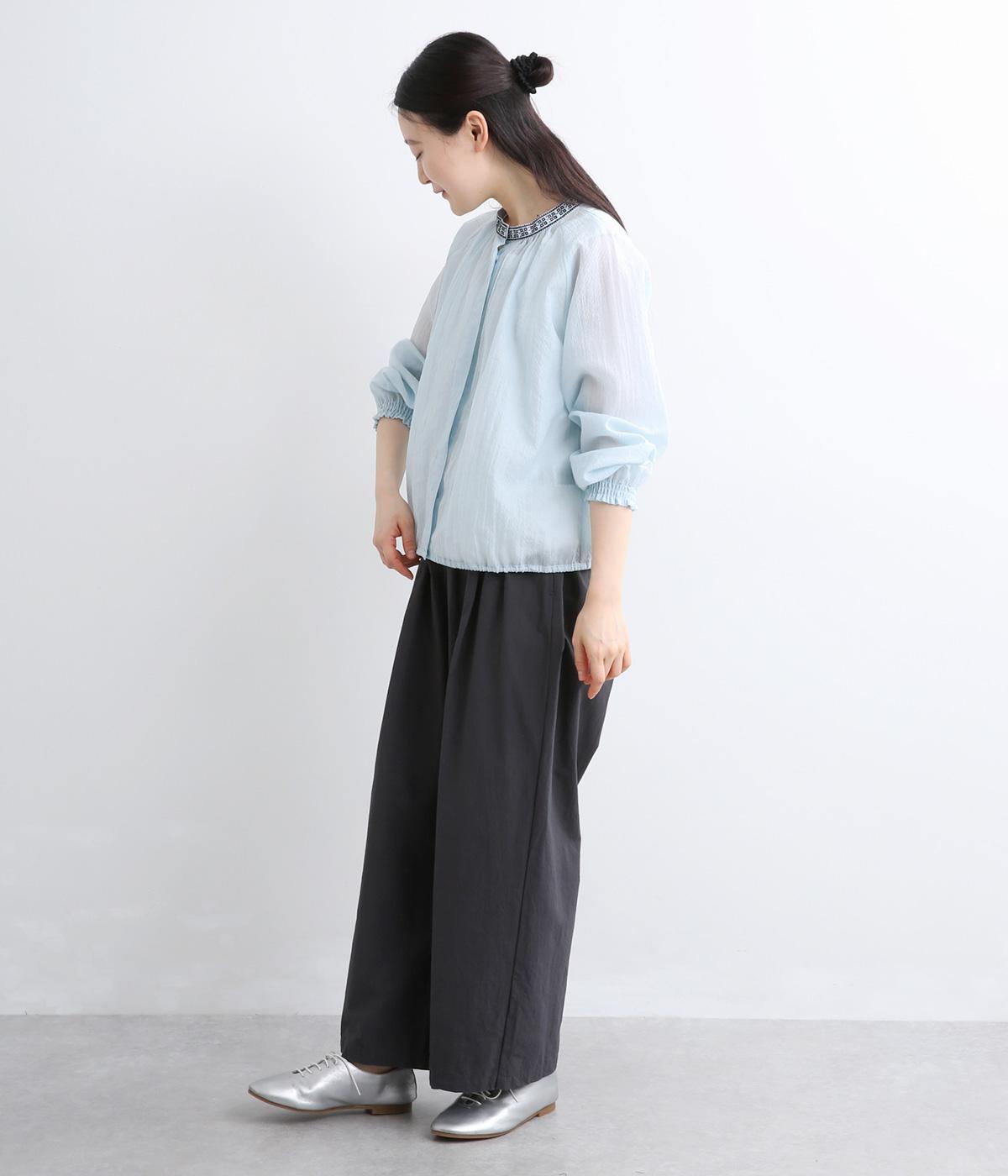 ドット風の織模様にシアーな素材感がレイヤードスタイルに奥行きを与える一枚。襟ぐりには刺しゅうを配してエスニックな要素をプラス。スナップボタン仕様でカーディガン感覚でも着まわしやすく、袖口ゴムギャザーでちょっとした手仕事時も便利です。