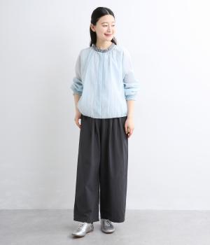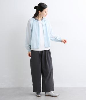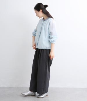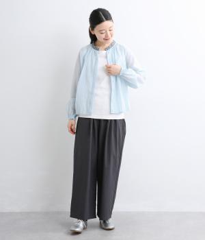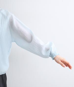 適度なふくらみとさらりとした肌触りが心地よく、シアー感が特徴的な混紡生地を使用しています。薄手素材で肌離れも良く、季節問わず快適に着用できます。