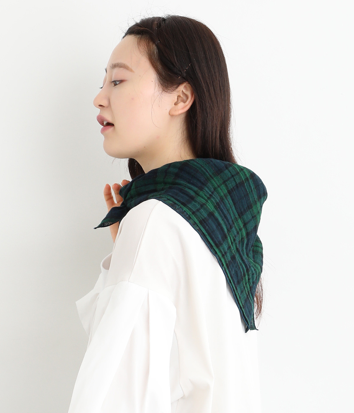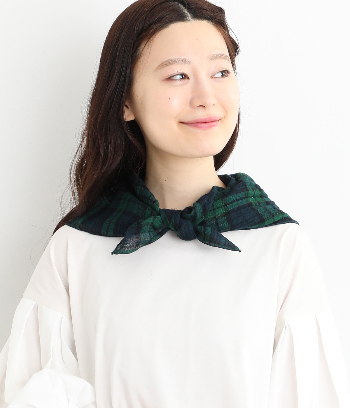 デイリースタイルにちょっと物足りなさを感じたときに、投入するだけでシックな装いを叶えてくれる柄ストールです。使い勝手のいい正方形タイプで、三角形に折ってセーラーカラーのように首元にあててもすてき。
