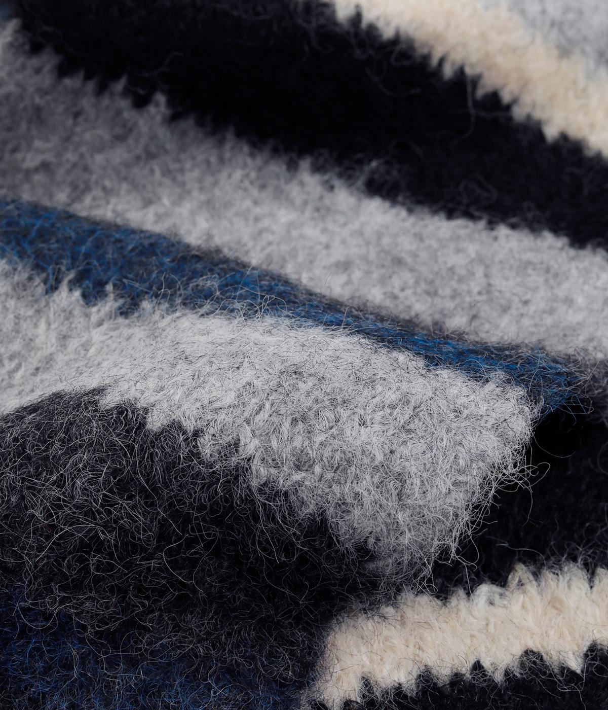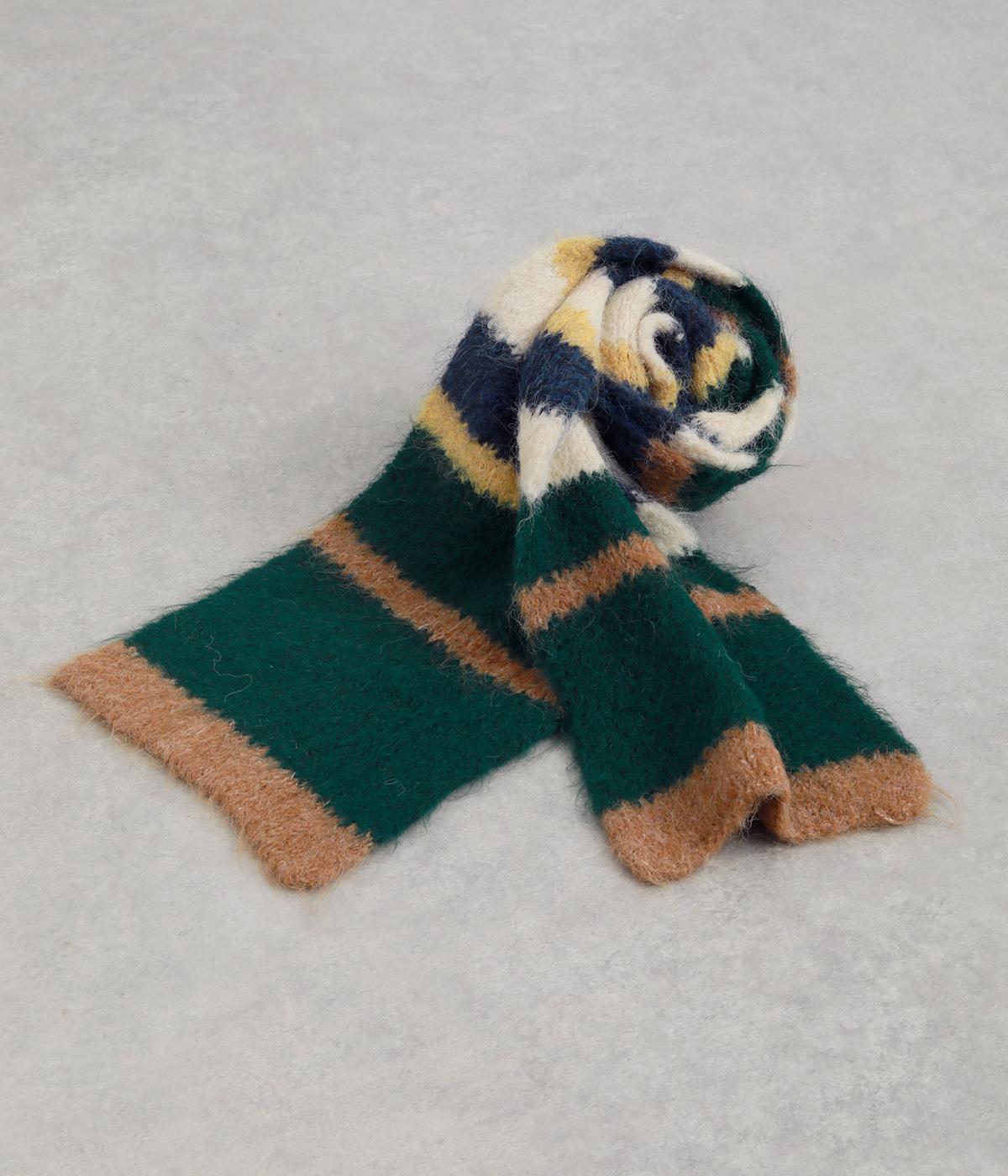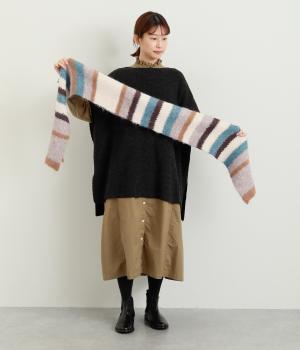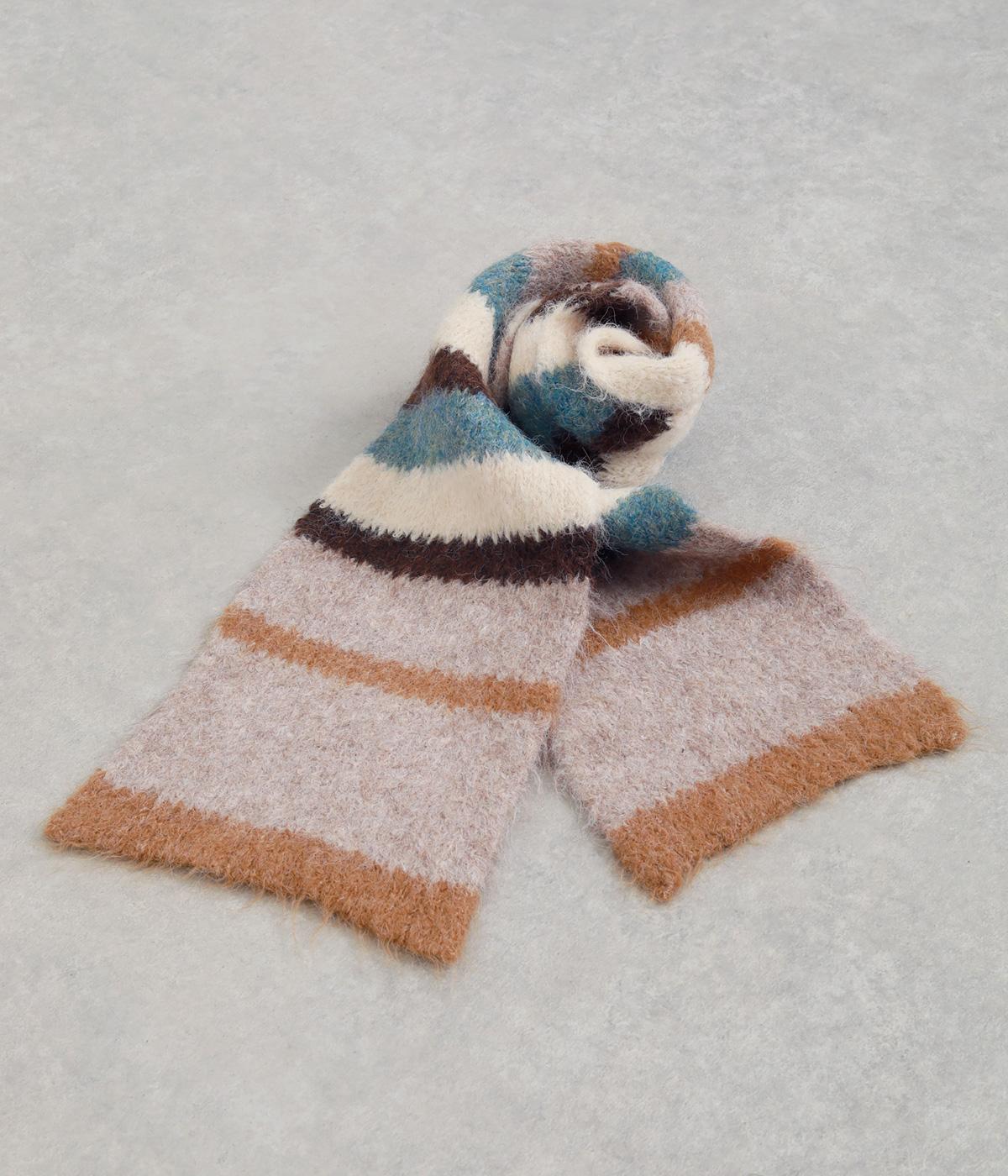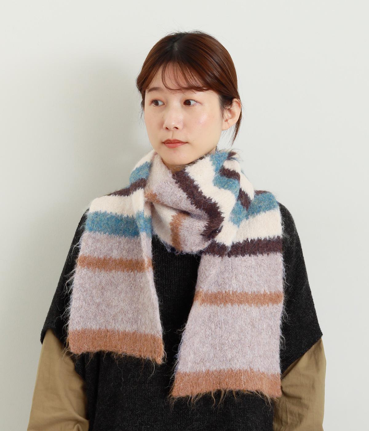 メリハリのある色合いを重ねたボーダー柄が、寒い季節の装いにほどよい遊び心を添えます。毛足によって色の境界がやわらくにじみ、巻き方によっても表情が変わります。コンパクトなボリュームながら存在感があり、シンプルなコーディネートに合わせたい主役級のアイテムです。