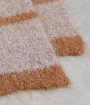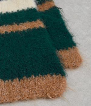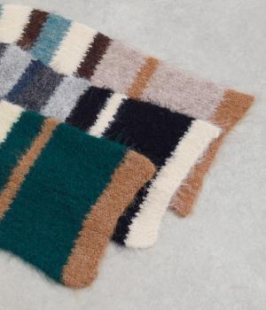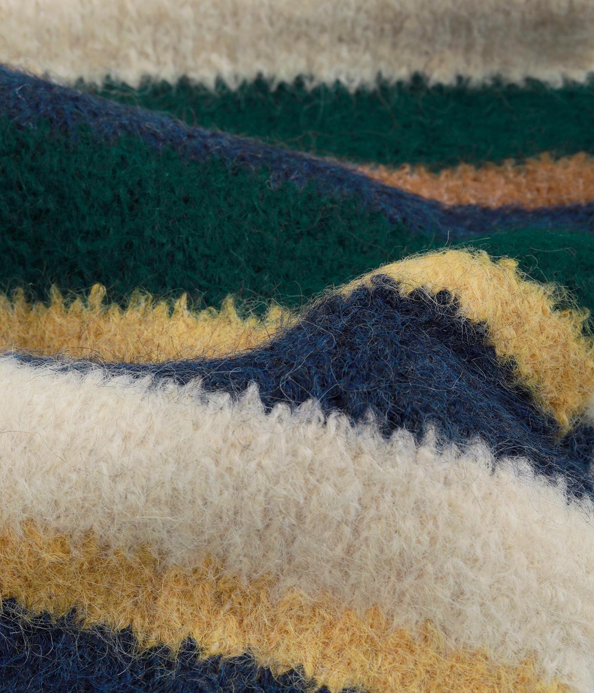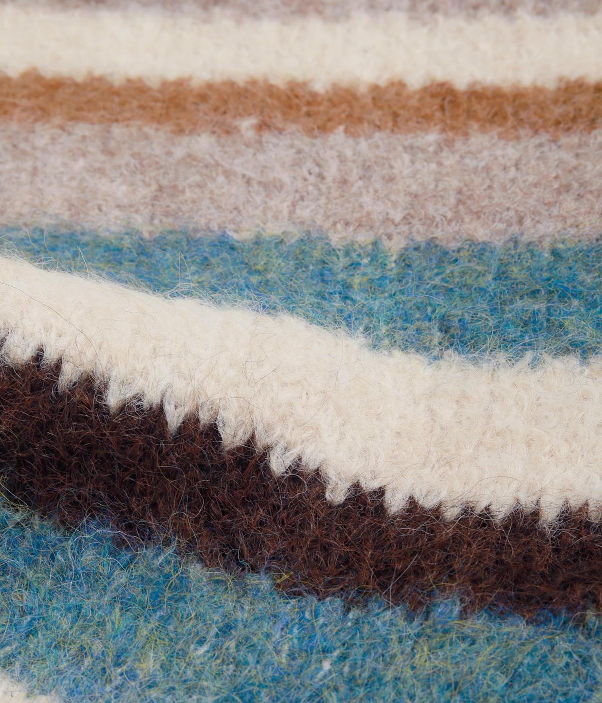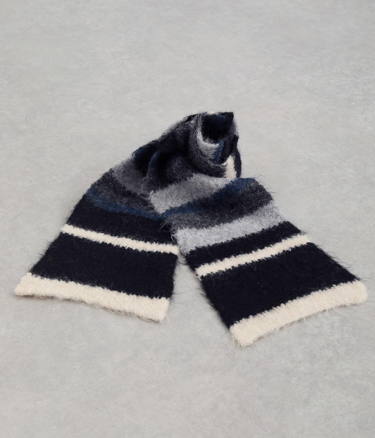 メリハリのある色合いを重ねたボーダー柄が、寒い季節の装いにほどよい遊び心を添えます。毛足によって色の境界がやわらくにじみ、巻き方によっても表情が変わります。コンパクトなボリュームながら存在感があり、シンプルなコーディネートに合わせたい主役級のアイテムです。