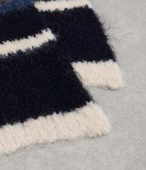 メリハリのある色合いを重ねたボーダー柄が、寒い季節の装いにほどよい遊び心を添えます。毛足によって色の境界がやわらくにじみ、巻き方によっても表情が変わります。コンパクトなボリュームながら存在感があり、シンプルなコーディネートに合わせたい主役級のアイテムです。