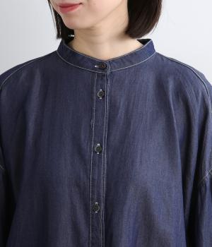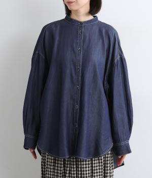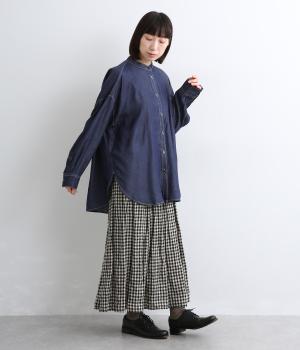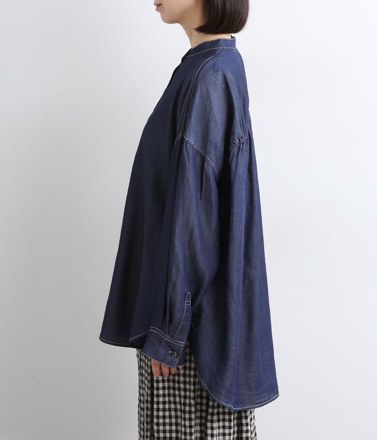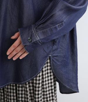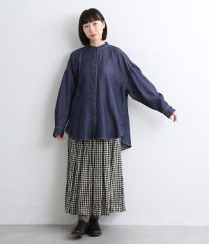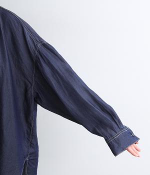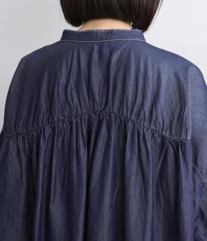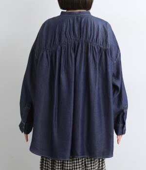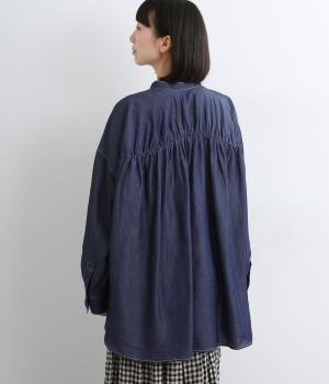 生地の特性を活かし、後ろヨークにたっぷりギャザーを入れたフレアシルエットのデニムシャツ。カジュアルすぎない品の良さがあり、大人のデイリースタイルをブラッシュアップさせてくれる一枚。ラフに羽織るのも◎。