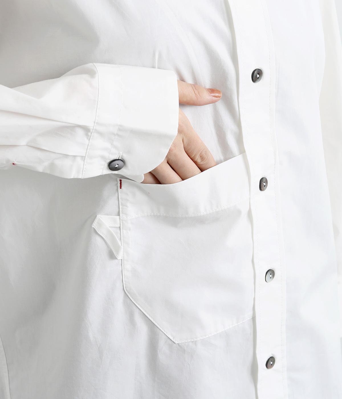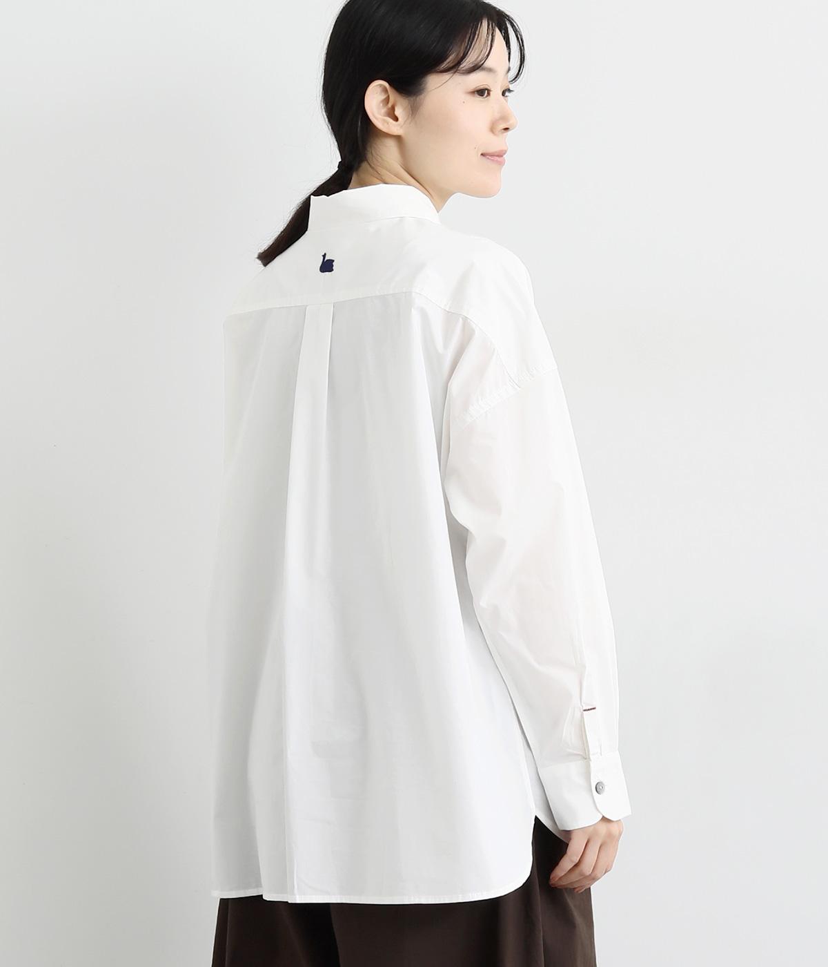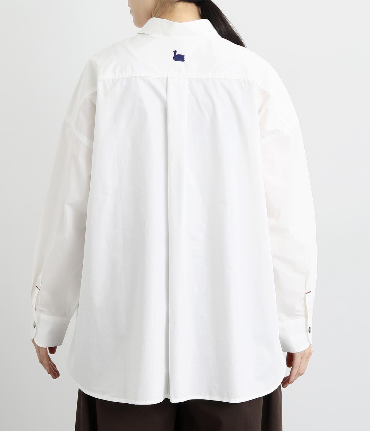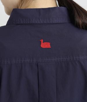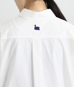トップスとしても羽織りとしても活躍するオーバーサイズシャツ。カップのようなデザインのポケットが、かわいらしいポイントです。高級感のある貝ボタンや、下前中心の配色ステッチなど、こだわりが詰まった一枚。後ろヨークにはブランドアイコンであるスワン刺しゅう入りです。