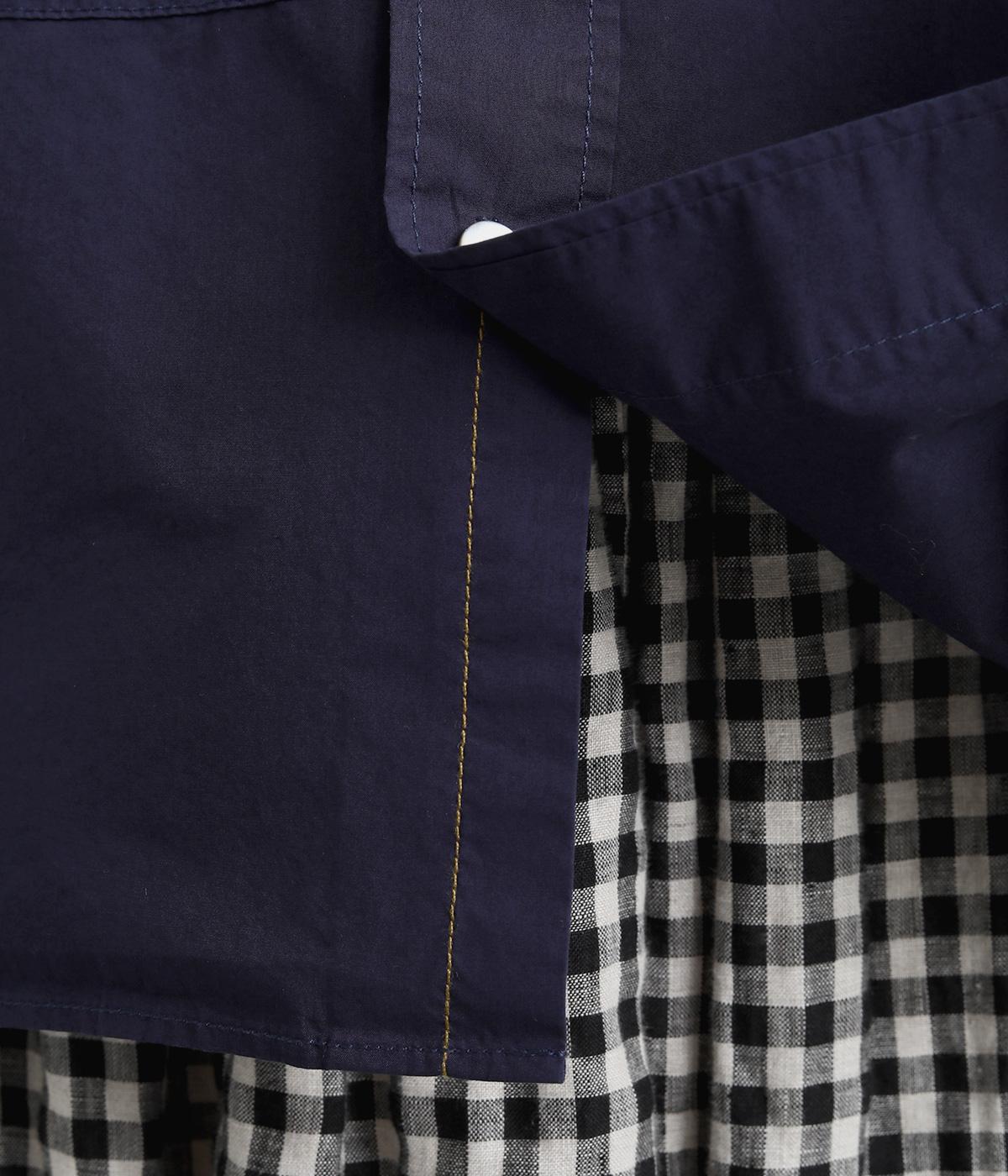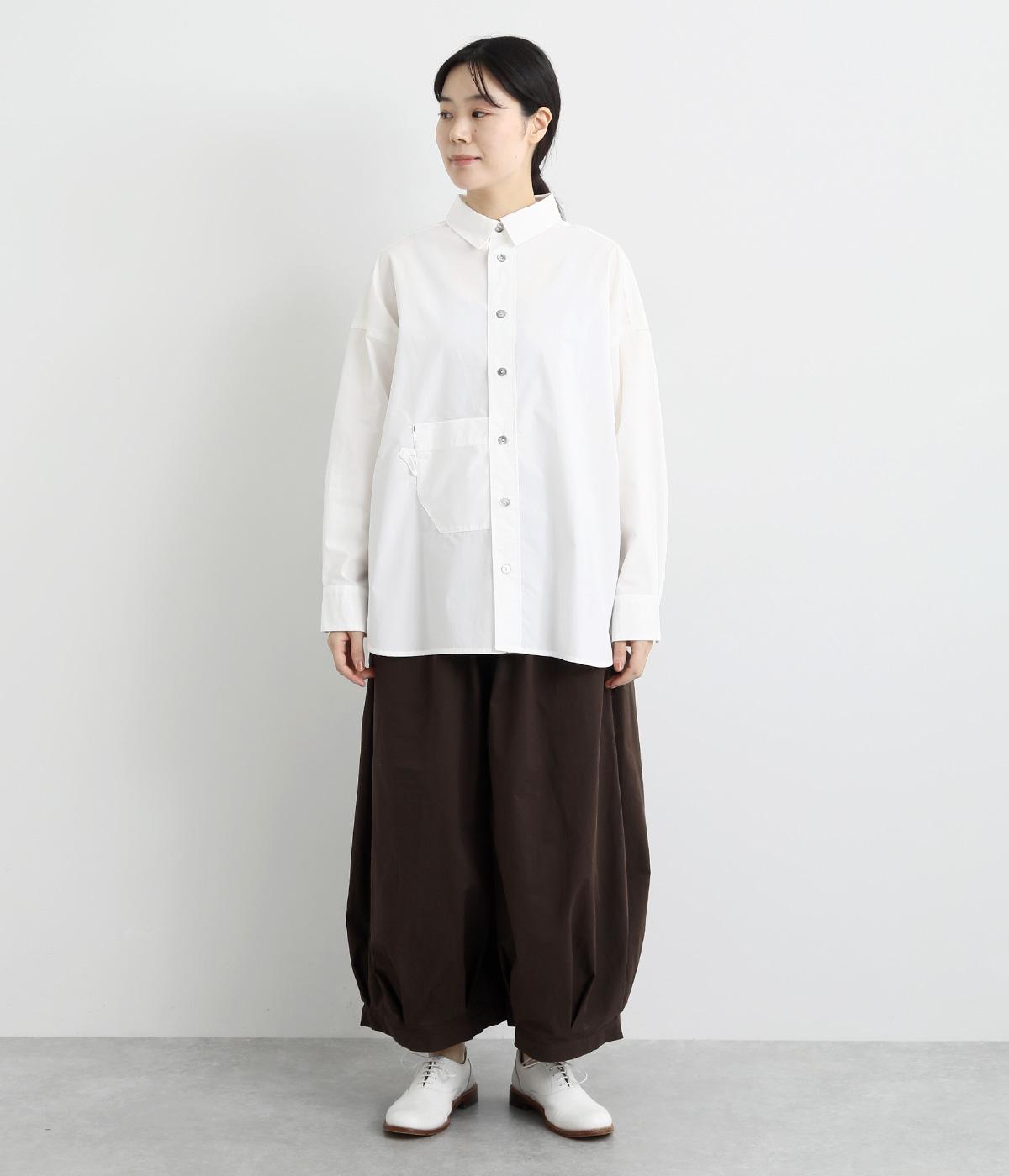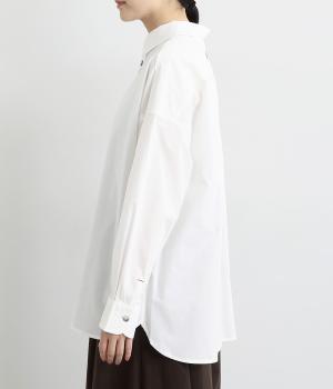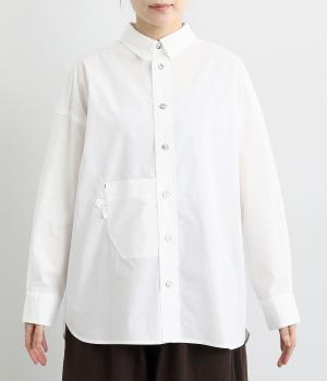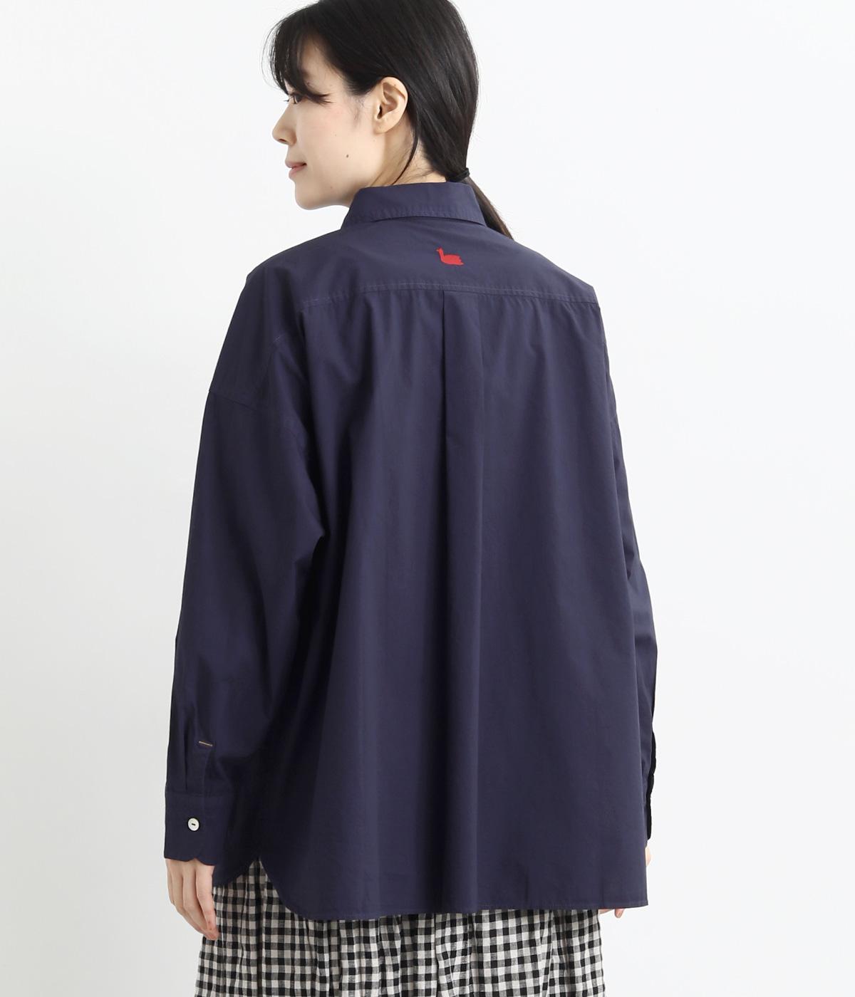 トップスとしても羽織りとしても活躍するオーバーサイズシャツ。カップのようなデザインのポケットが、かわいらしいポイントです。高級感のある貝ボタンや、下前中心の配色ステッチなど、こだわりが詰まった一枚。後ろヨークにはブランドアイコンであるスワン刺しゅう入りです。