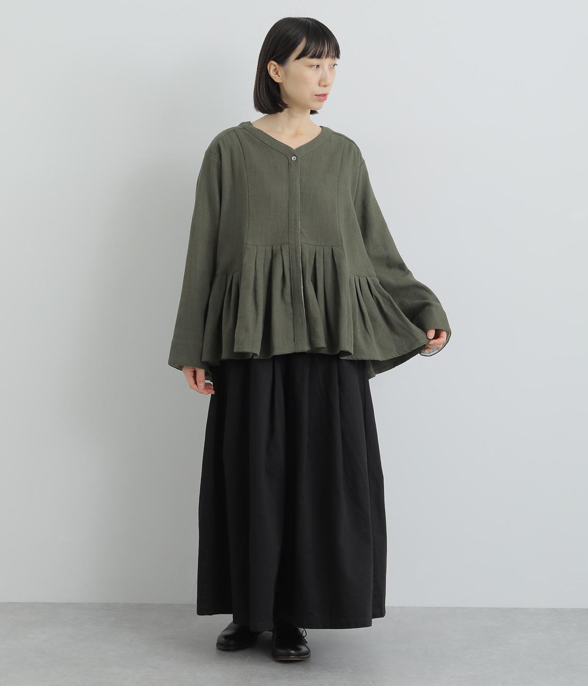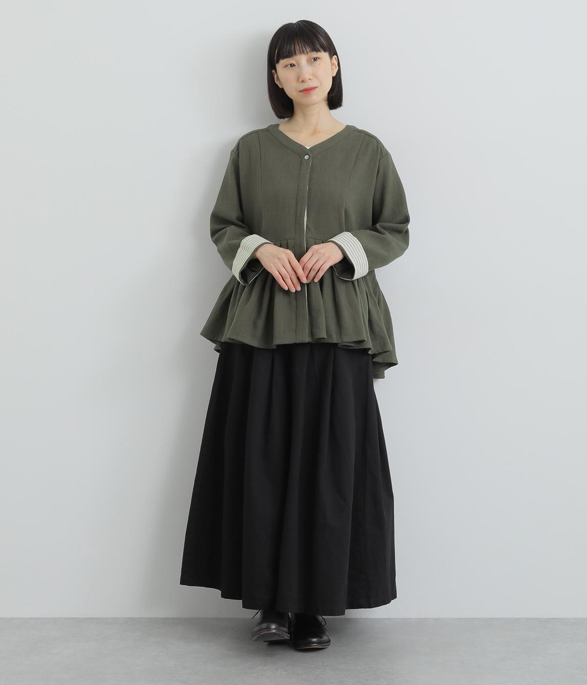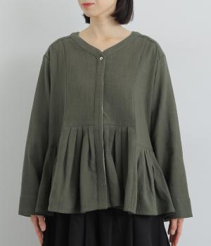 プリーツのように連続したタック使いでシルエットに変化をつけた一着。Vネックと比翼仕立てのデザインが上品見えする、大人フェミニンな仕上がりです。袖口は折り返して裏のストライプ生地を覗かせても素敵。トップスとしてもジャケットとしても着まわせる便利なアイテムです。
