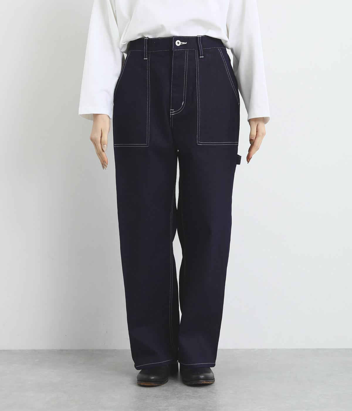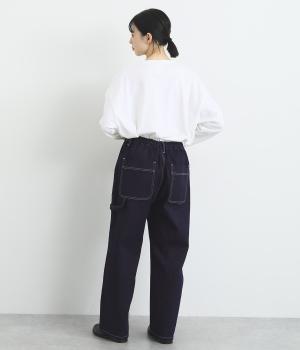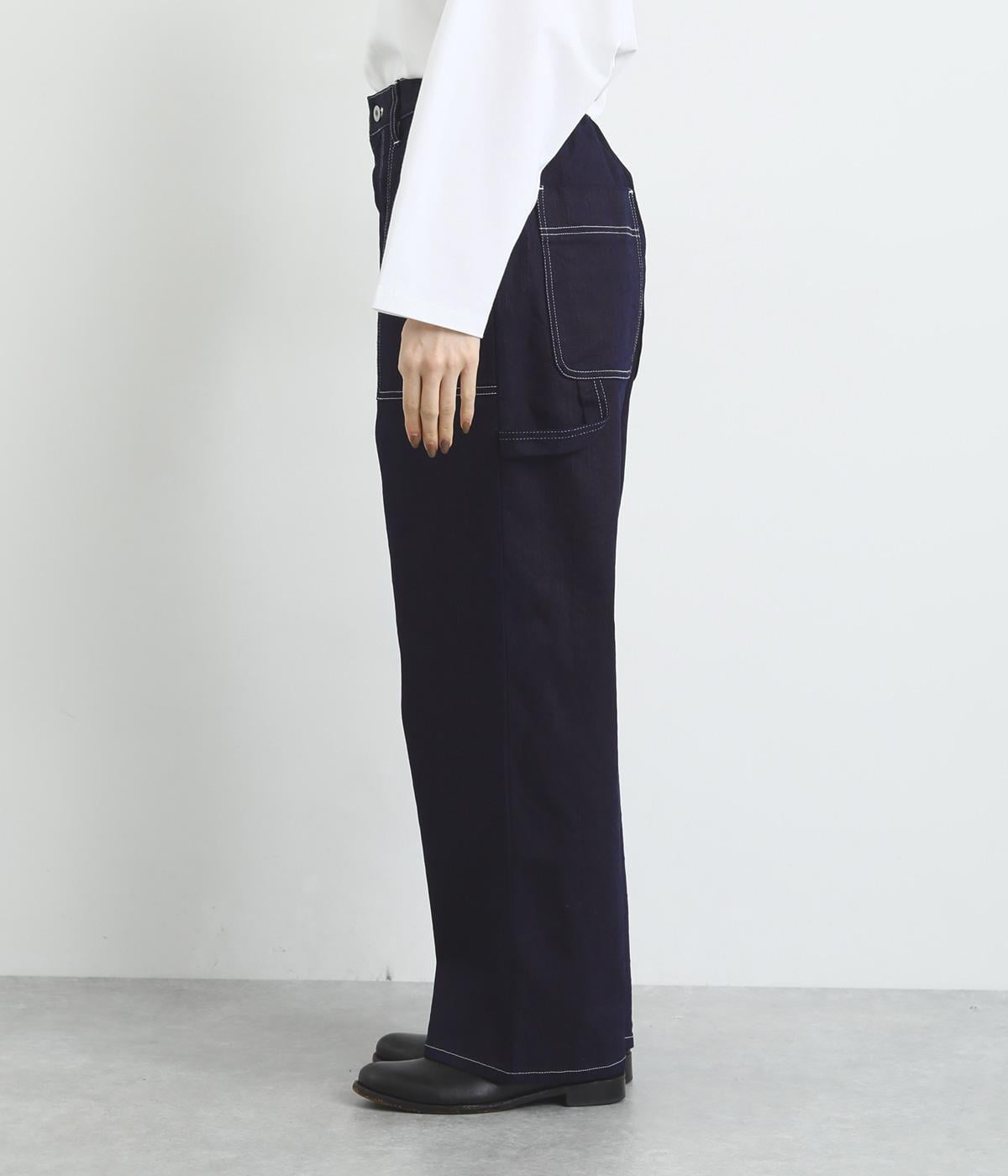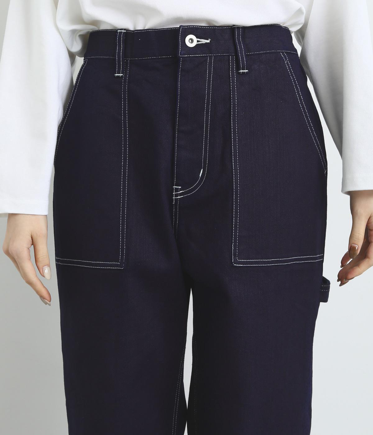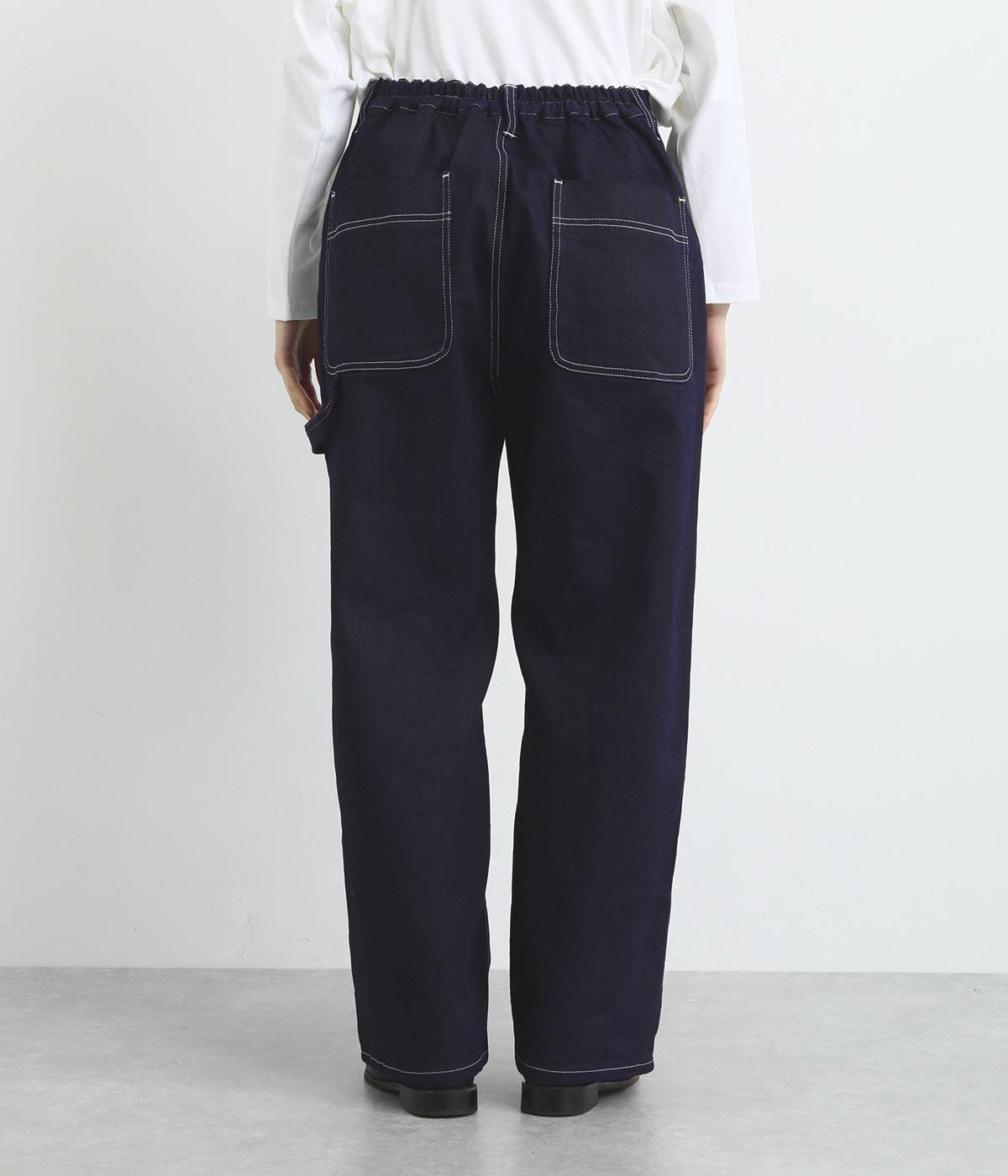 大きなポケットやハンマーループがワーク感を漂わせるペインターパンツ。適度にゆとりを持たせた、脚のラインをきれいに見せるストレートシルエットです。ホワイトのステッチがカジュアルなアクセントに。後ろウエストはゴム仕様、前はボタンとファスナー仕様ですっきりと仕上げました。