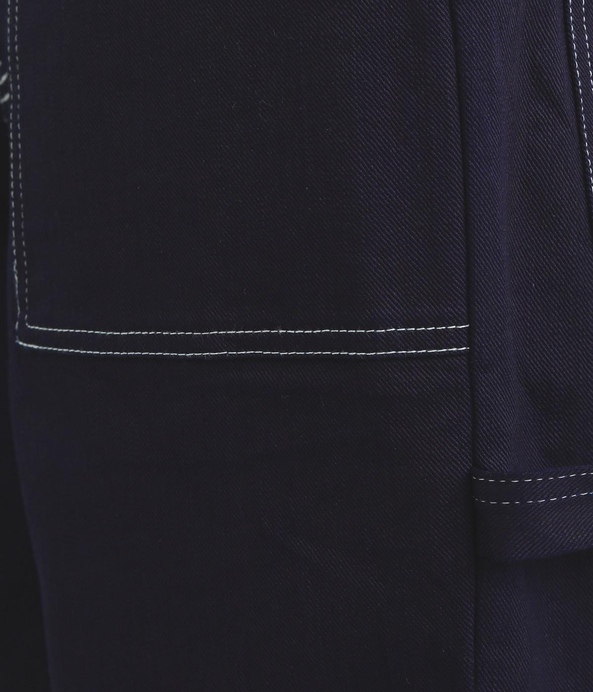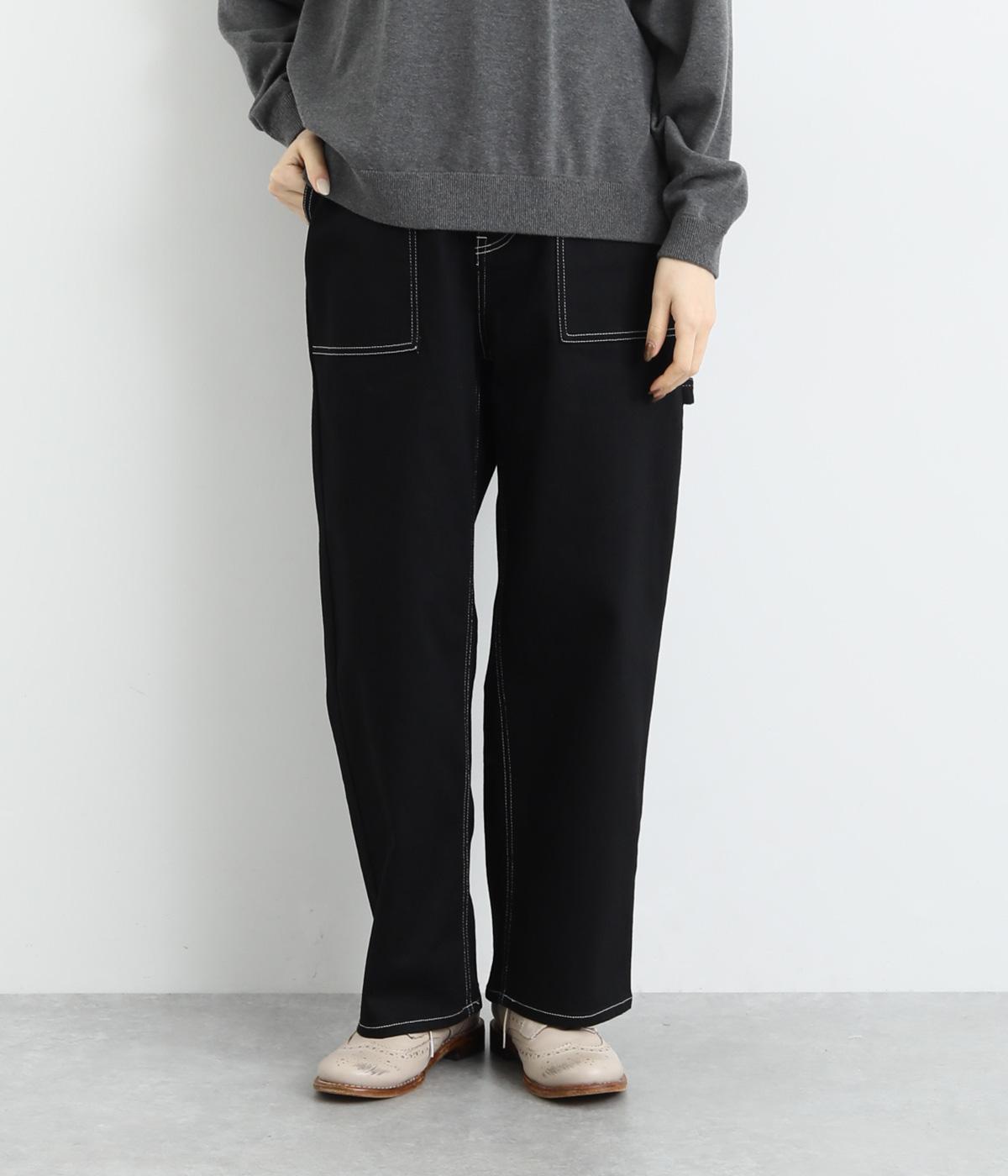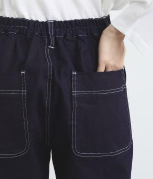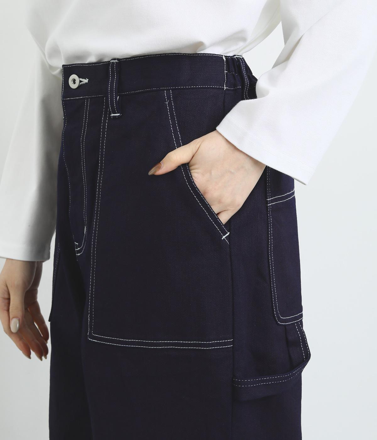 大きなポケットやハンマーループがワーク感を漂わせるペインターパンツ。適度にゆとりを持たせた、脚のラインをきれいに見せるストレートシルエットです。ホワイトのステッチがカジュアルなアクセントに。後ろウエストはゴム仕様、前はボタンとファスナー仕様ですっきりと仕上げました。