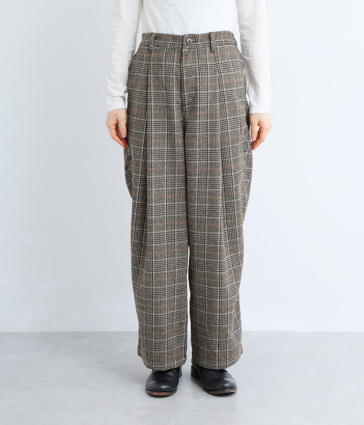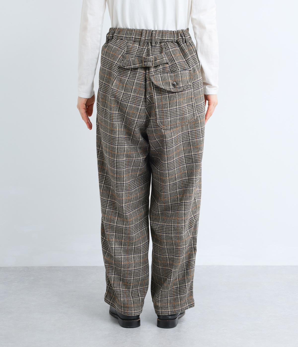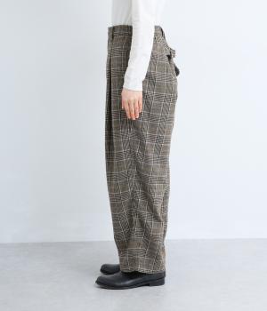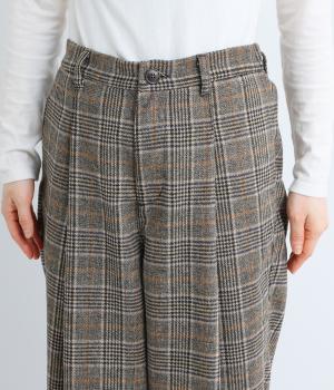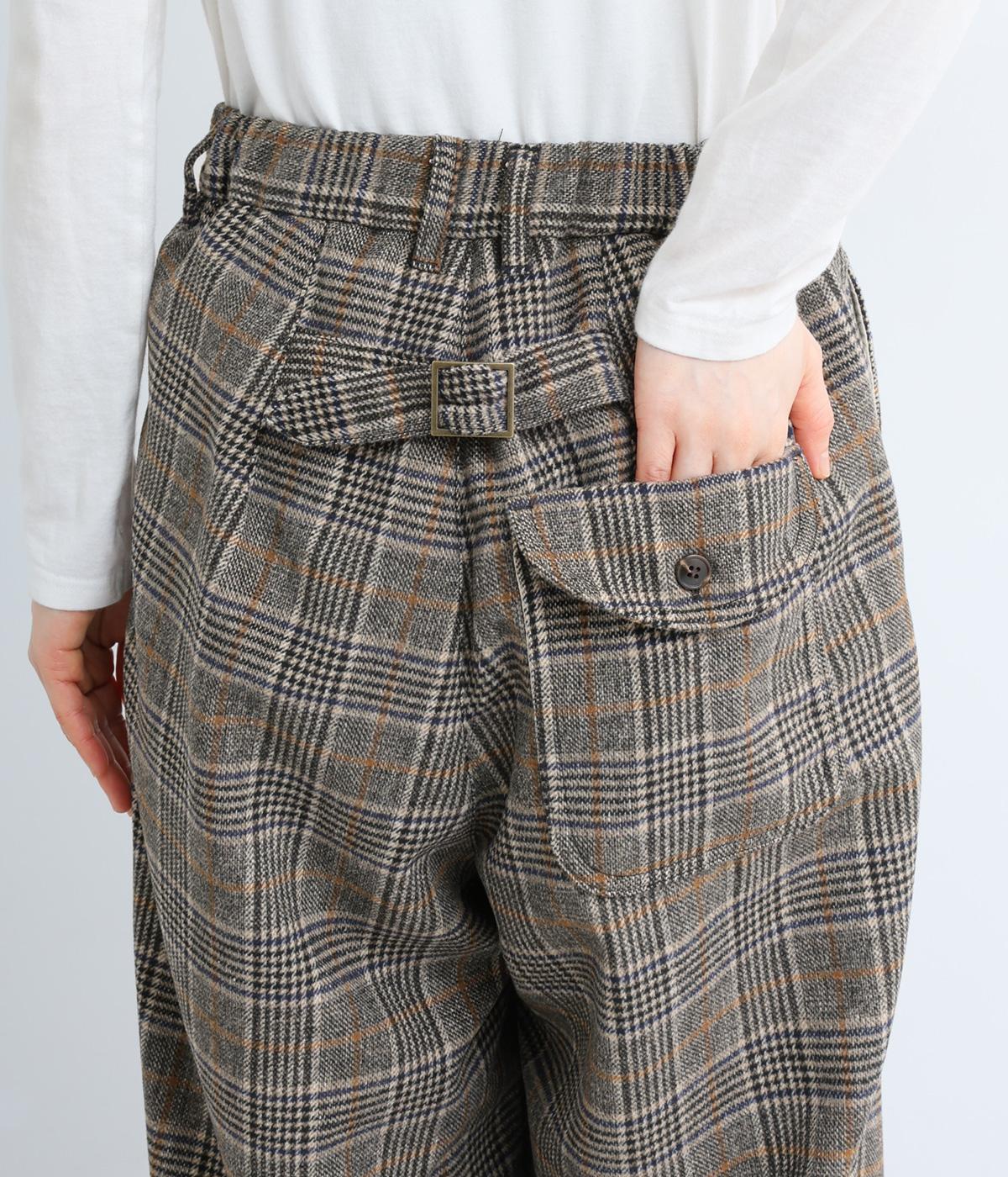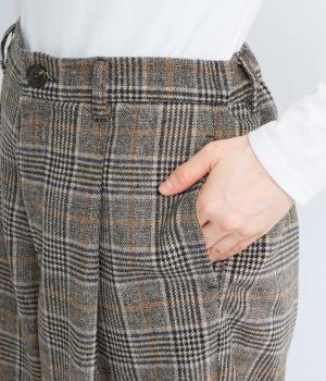 クラシカルなチェック柄が端正な印象をを与えるパンツ。フロントにタックをほどこして、気になる体のラインをカバーするゆとりを持たせました。ヒップポケットやバックベルトが後ろ姿のアクセントに。ウエストは後ろのみゴム仕様です。