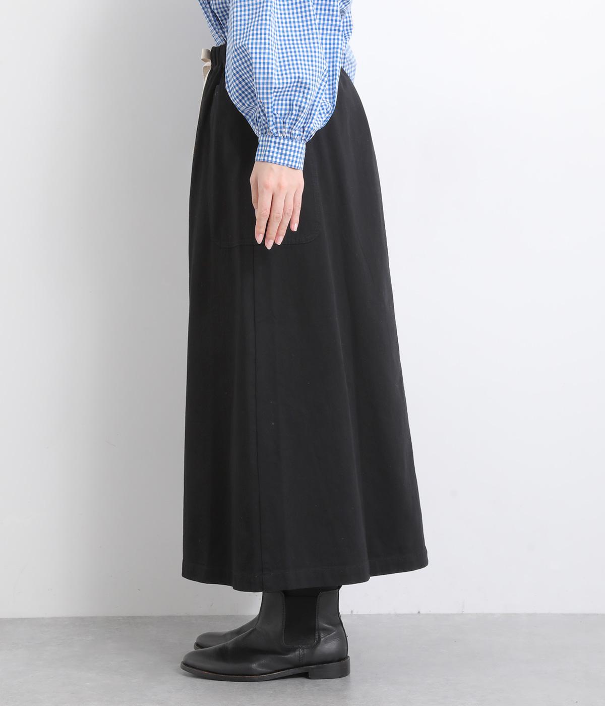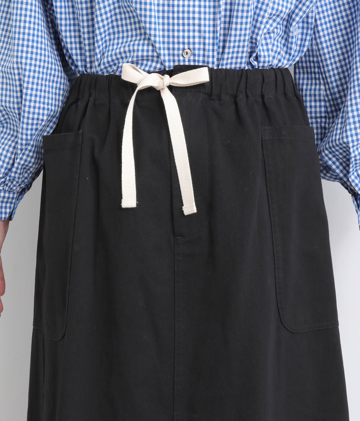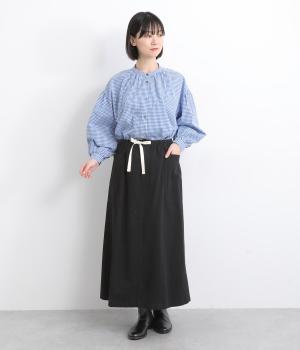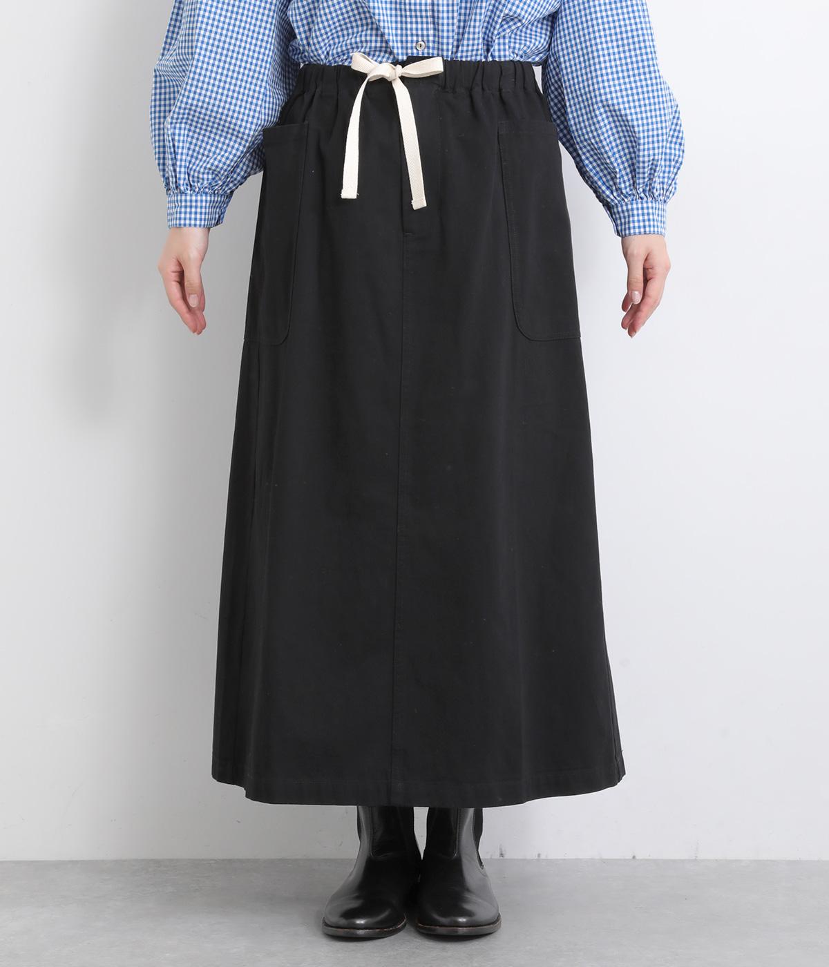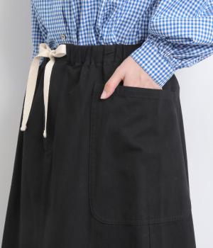 ワークテイストの大きなポケットが目をひくAラインスカート。ウエストはボタンとファスナー留めでぐるりとゴムをほどこしたストレスフリーな穿き心地。ウエストの調節ができる紐は、トップスインするとアクセントにもなります。