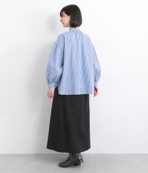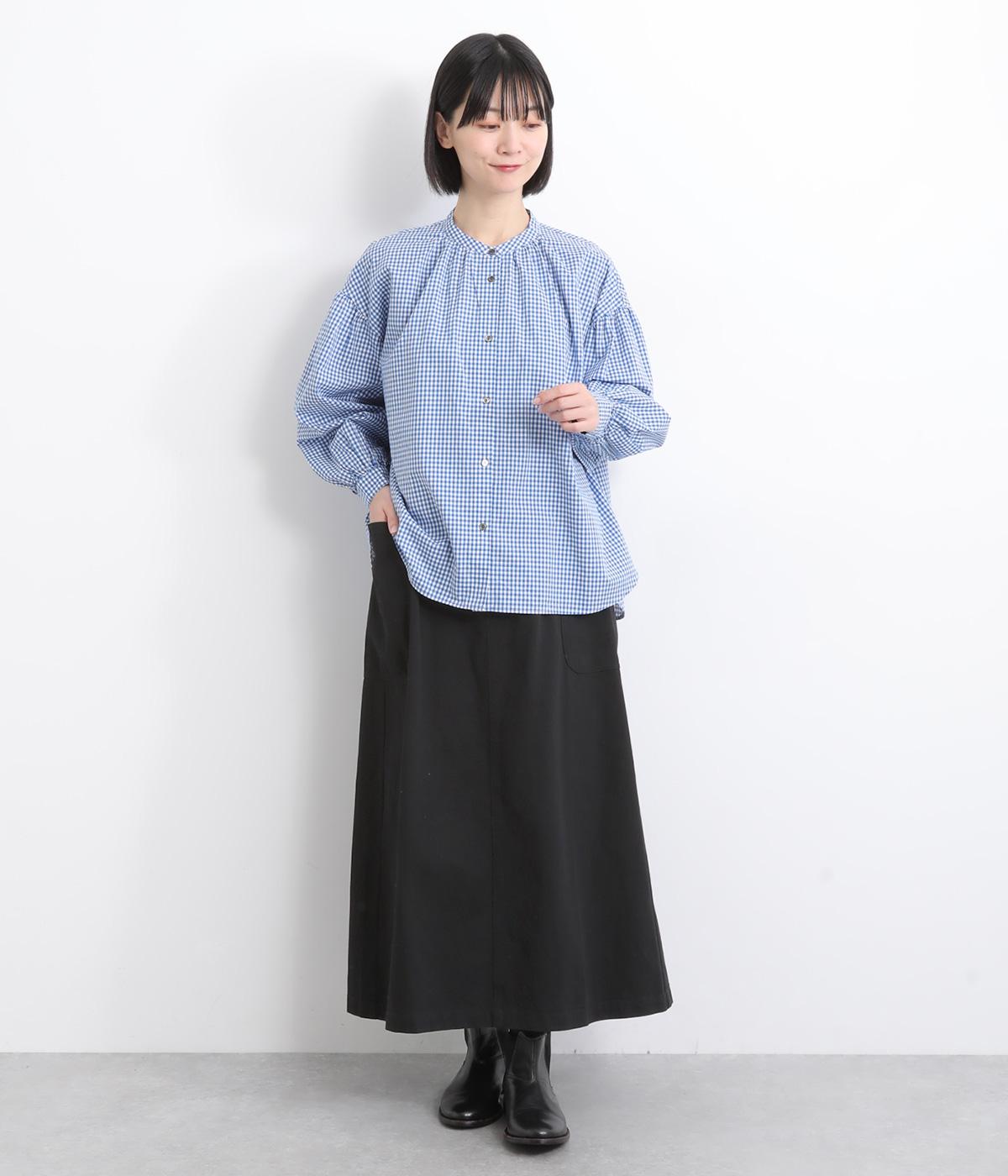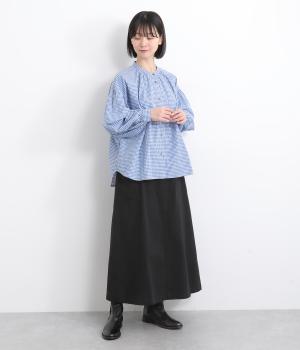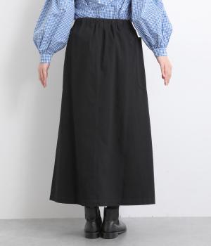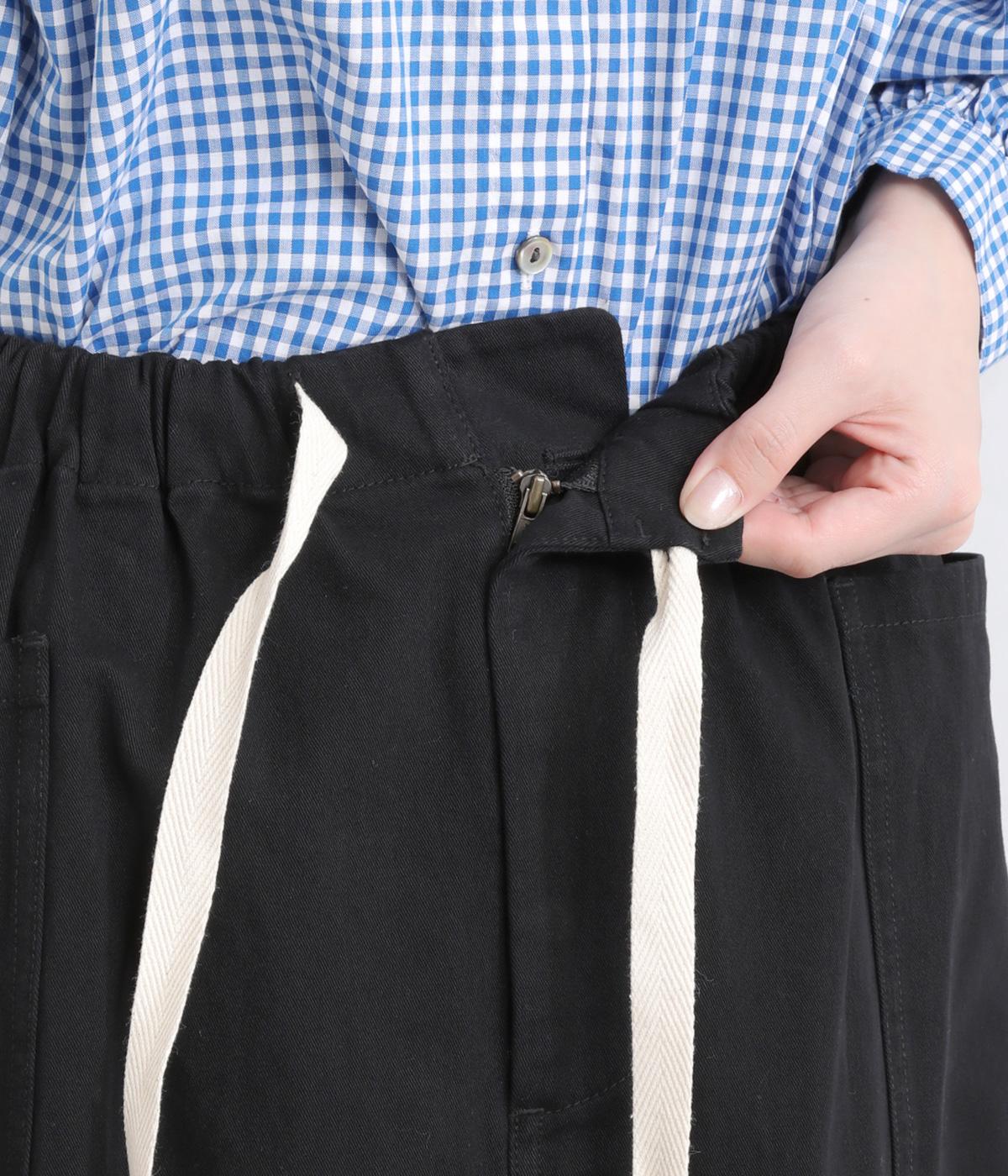 ワークテイストの大きなポケットが目をひくAラインスカート。ウエストはボタンとファスナー留めでぐるりとゴムをほどこしたストレスフリーな穿き心地。ウエストの調節ができる紐は、トップスインするとアクセントにもなります。