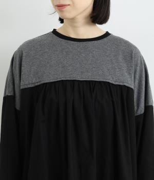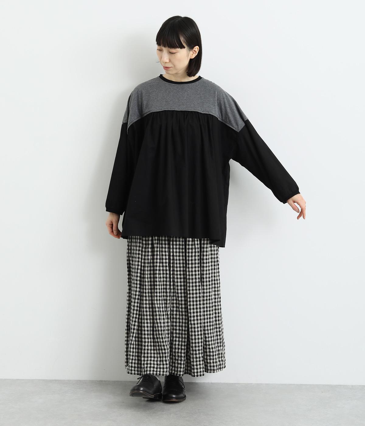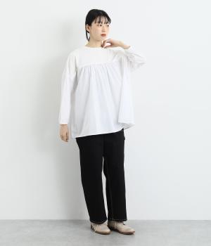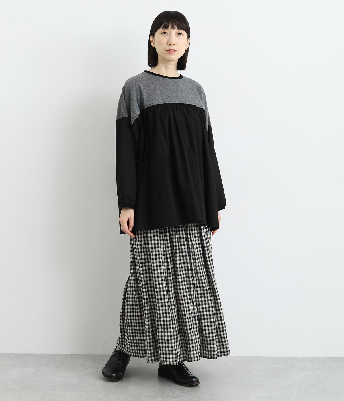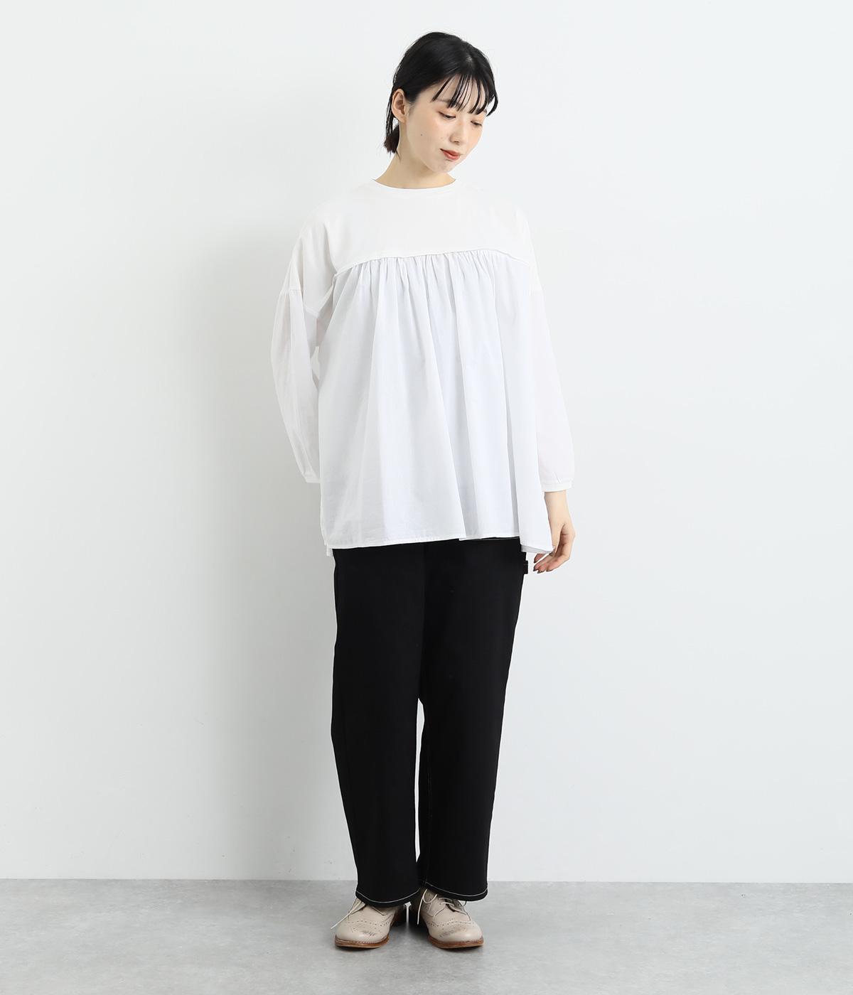 胸から下の異素材使いが目を引くプルオーバー。切り替えラインのギャザーがフェミニンなムードを添え、ふんわりとした軽やかな着こなしが叶います。高い位置の切り替えが視線をアップさせ、長めの着丈をすっきりと見せる効果も。カジュアルにも上品にも着こなせる活用度の高い一着です。