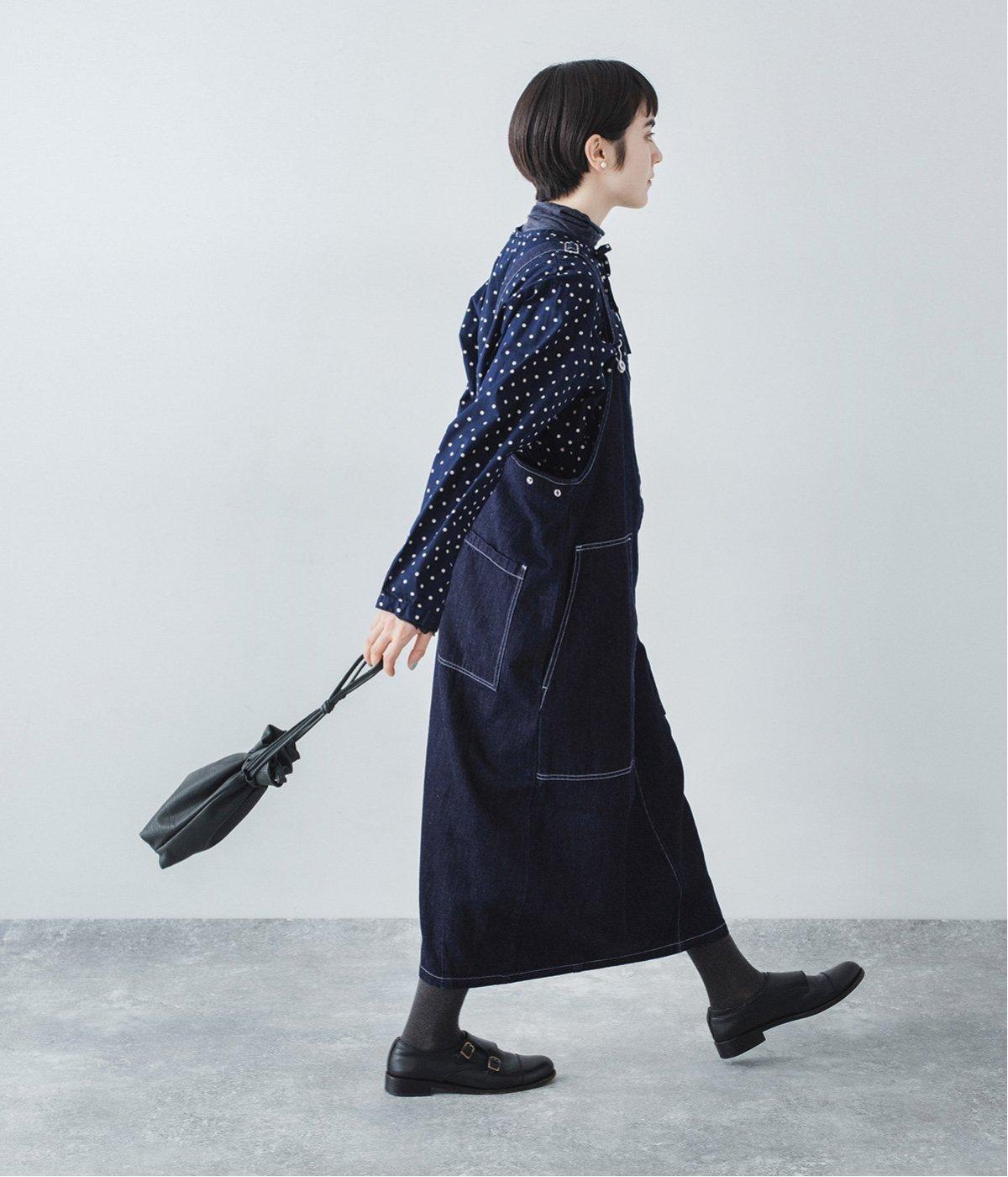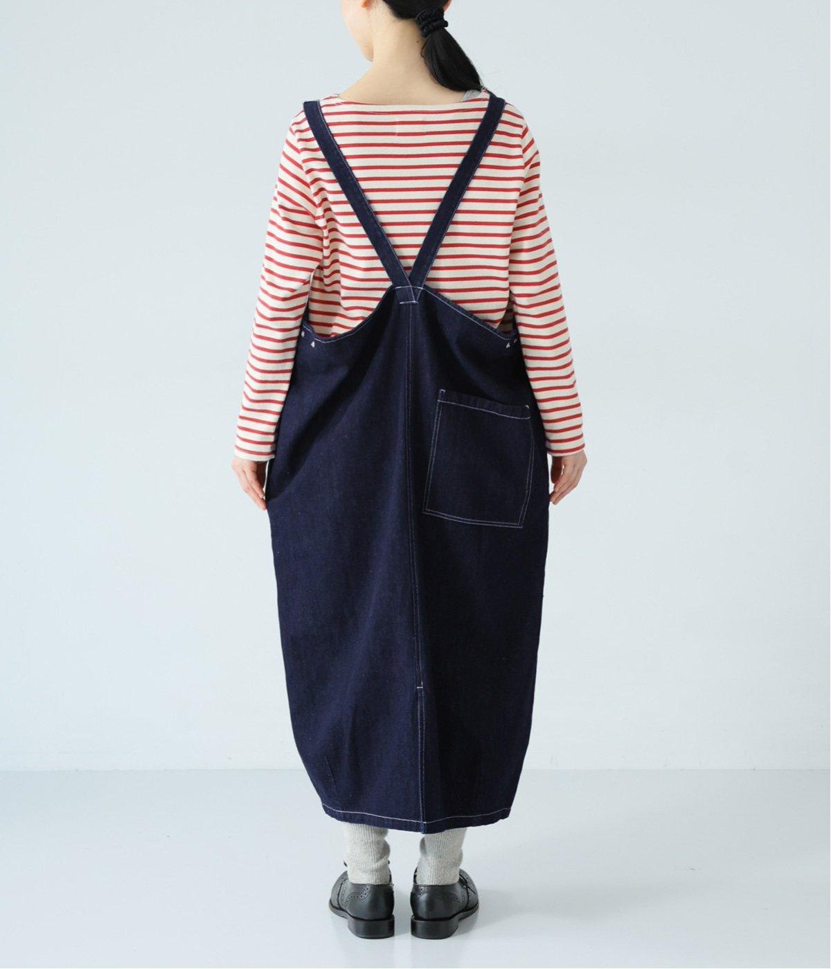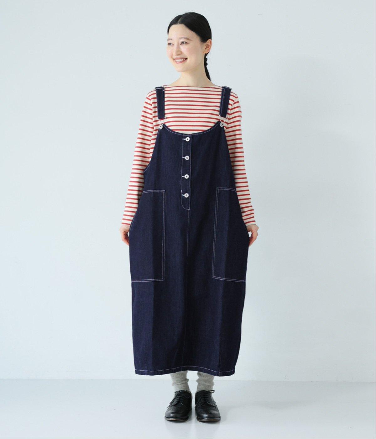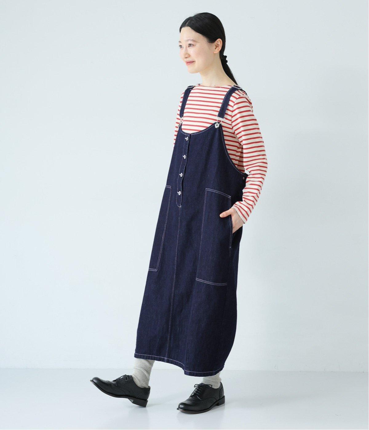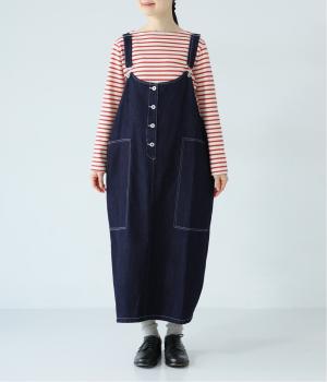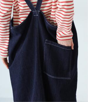 裾の広がりをおさえ丸みを持たせたコクーンシルエットが大人らしいジャンパースカート。前後の大きめのポケットやステッチでワークテイストを取り入れました。ウエスト位置両サイドのドットボタンでシルエット調節が可能。肩紐もバックルで長さをアレンジできます。