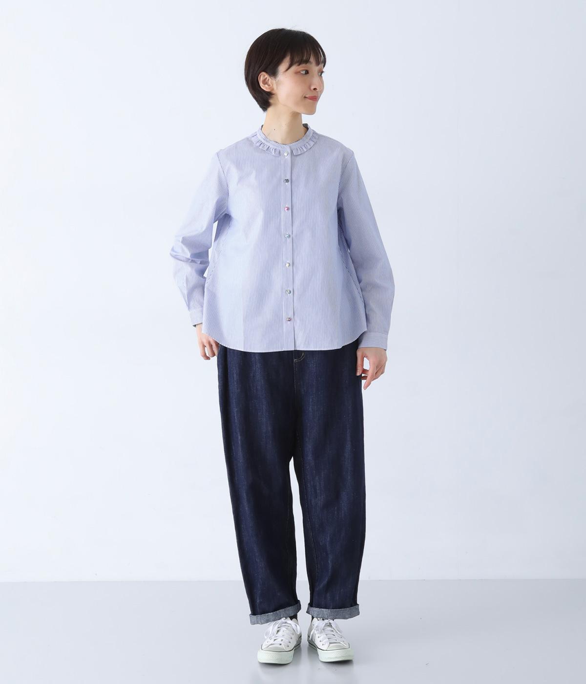 Parkesでは定番のLIBERTYくるみボタンを使用した、すっきりシルエットのフリル付きブラウスです。フラットカラーのフリルで首まわりの締め付け感なく、華やかな印象だけ添えてくれます。
