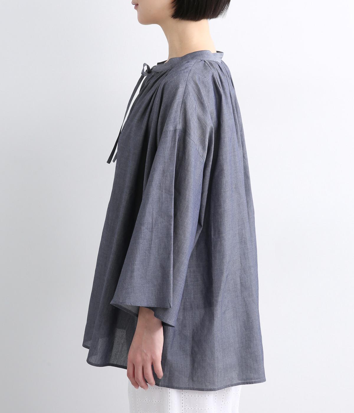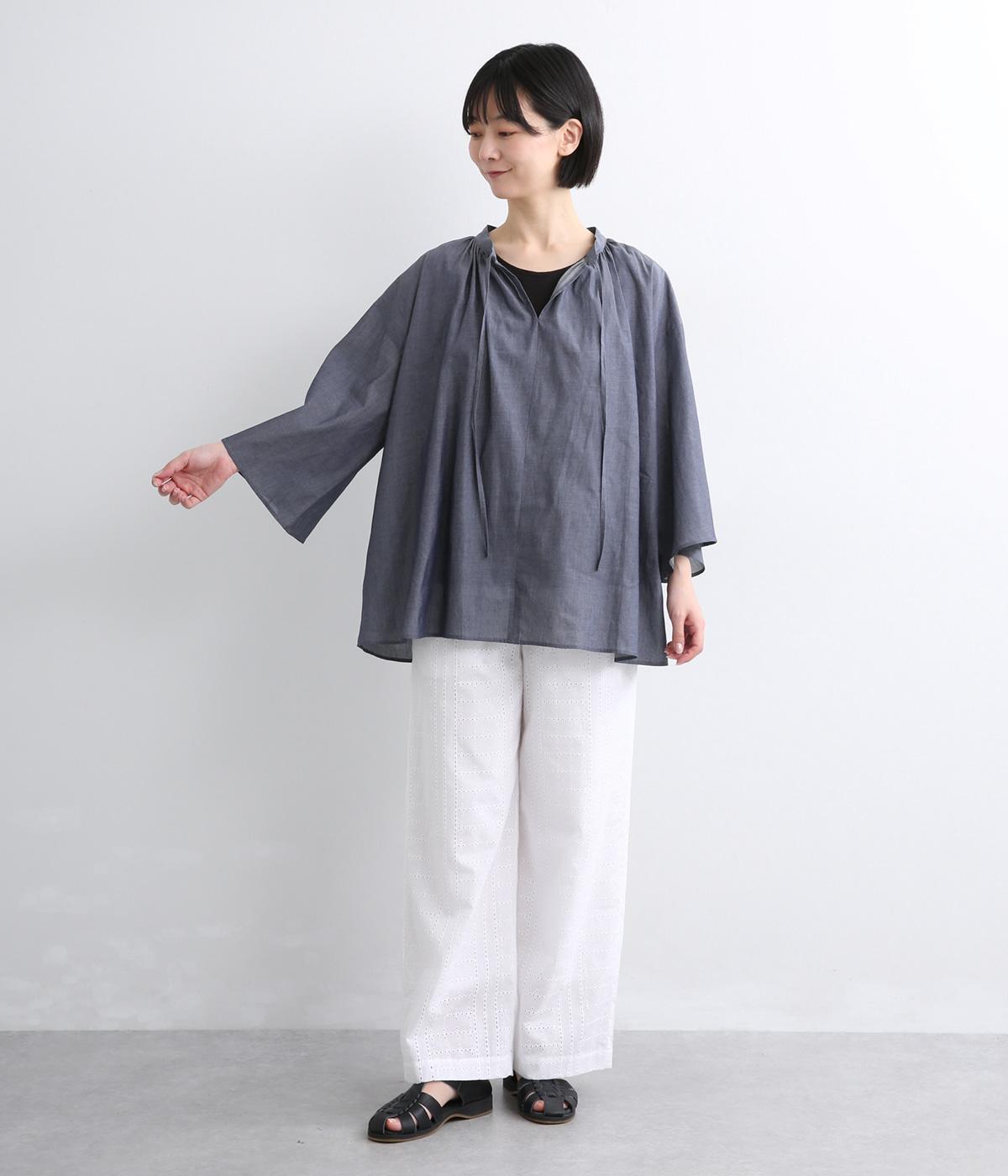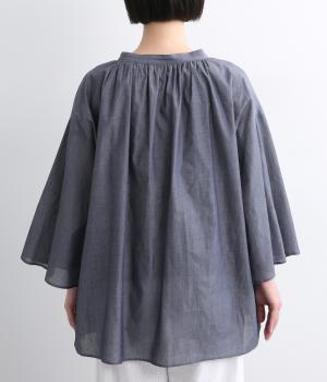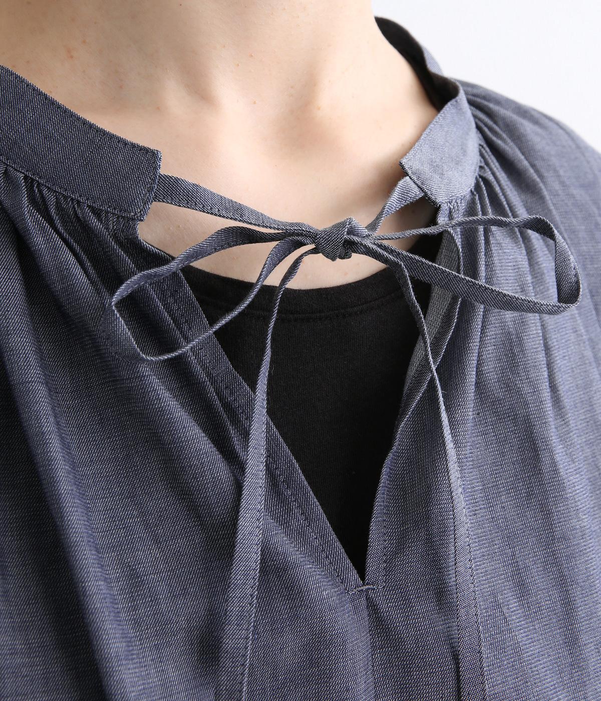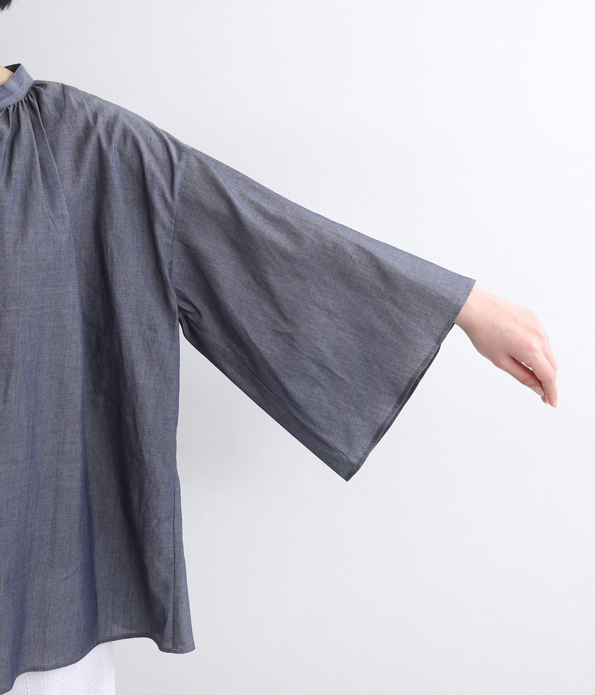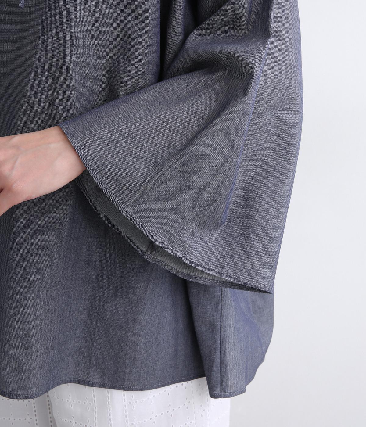 ゆったりした身頃やベルスリーブがきれいなドレープを描き、デニムシャツとはひと味違った華やかさのあるブラウス。スキッパーカラーはリボンを結んでワンポイントにしても◎。後ろ身頃を長くフレアに仕立て、どこから見ても着映え力のある一枚に。