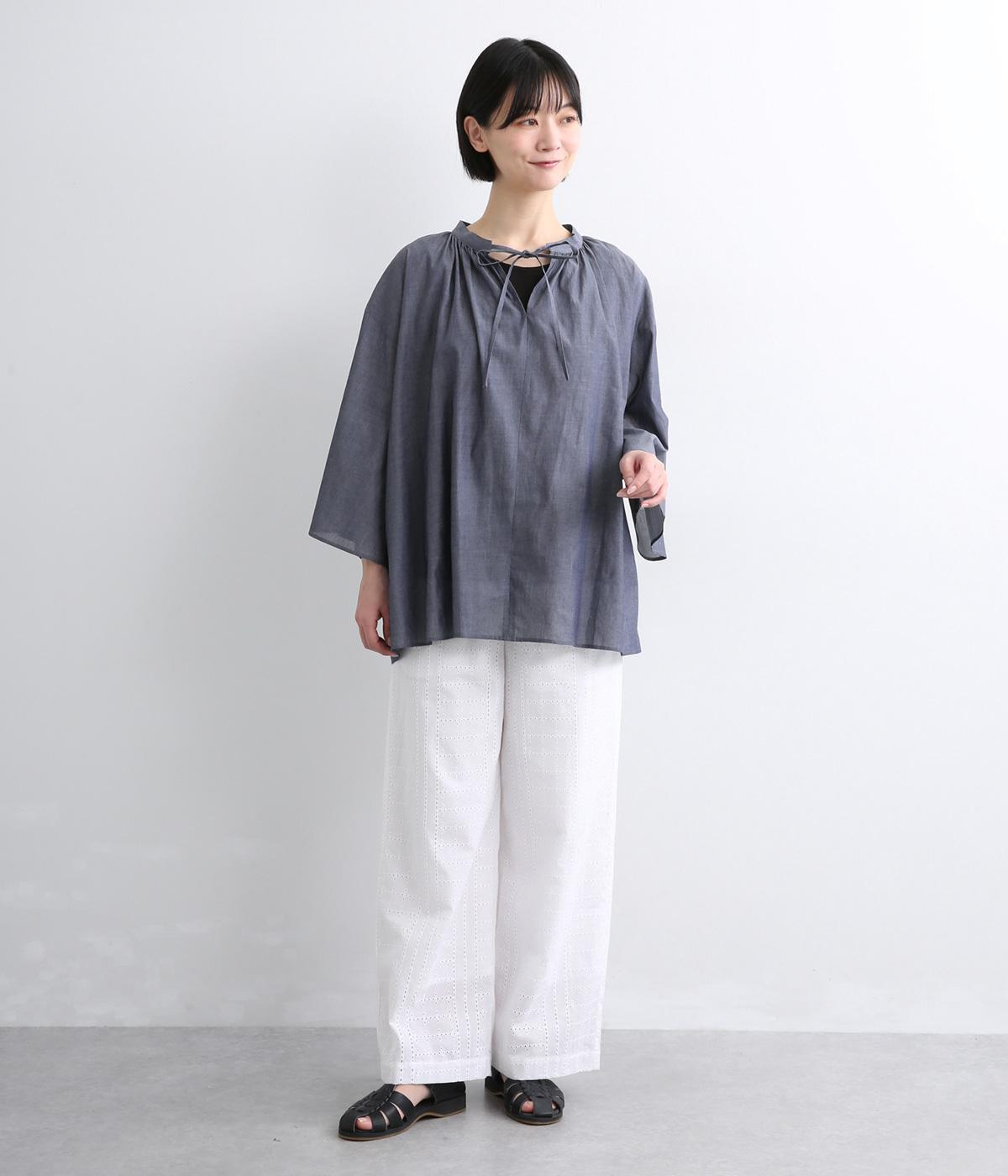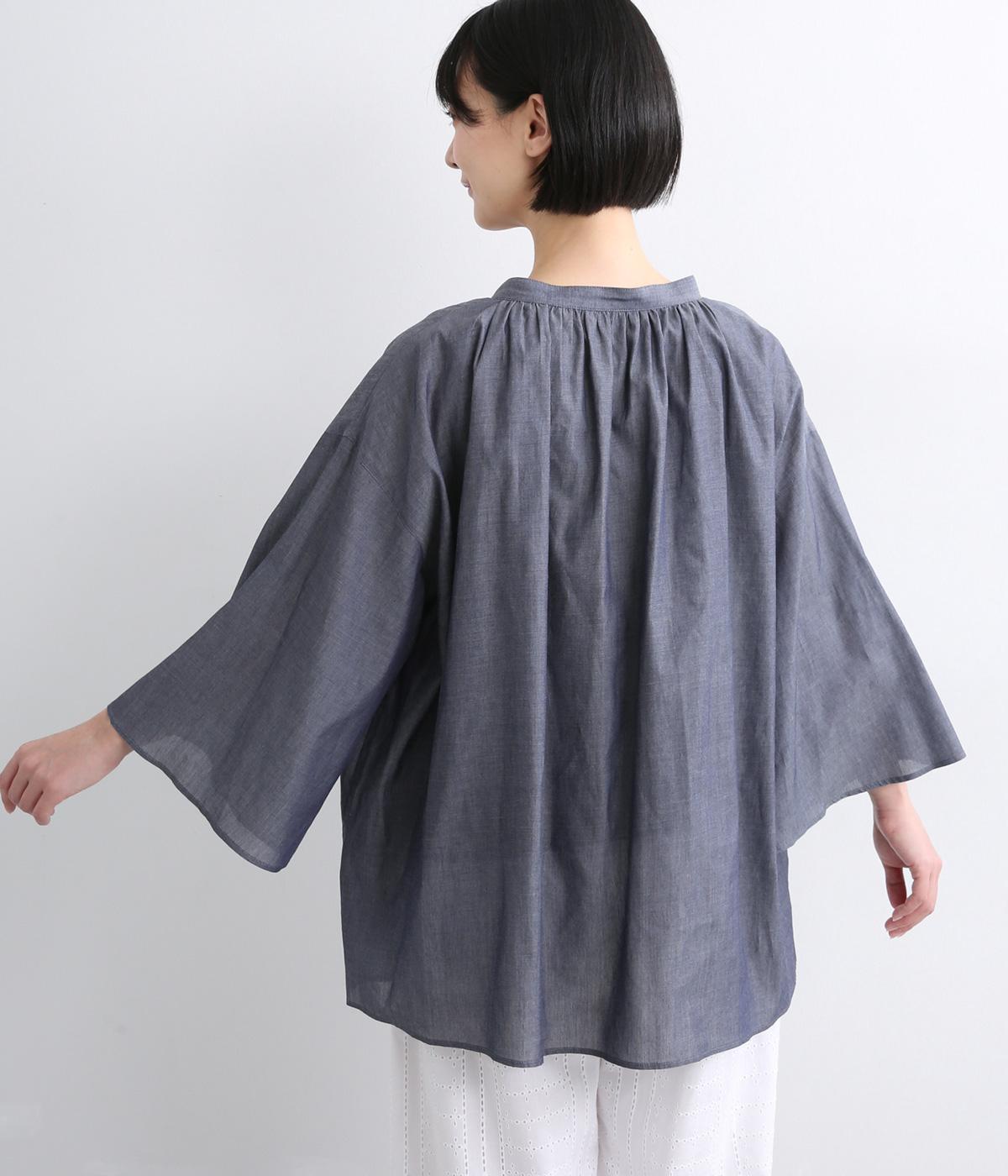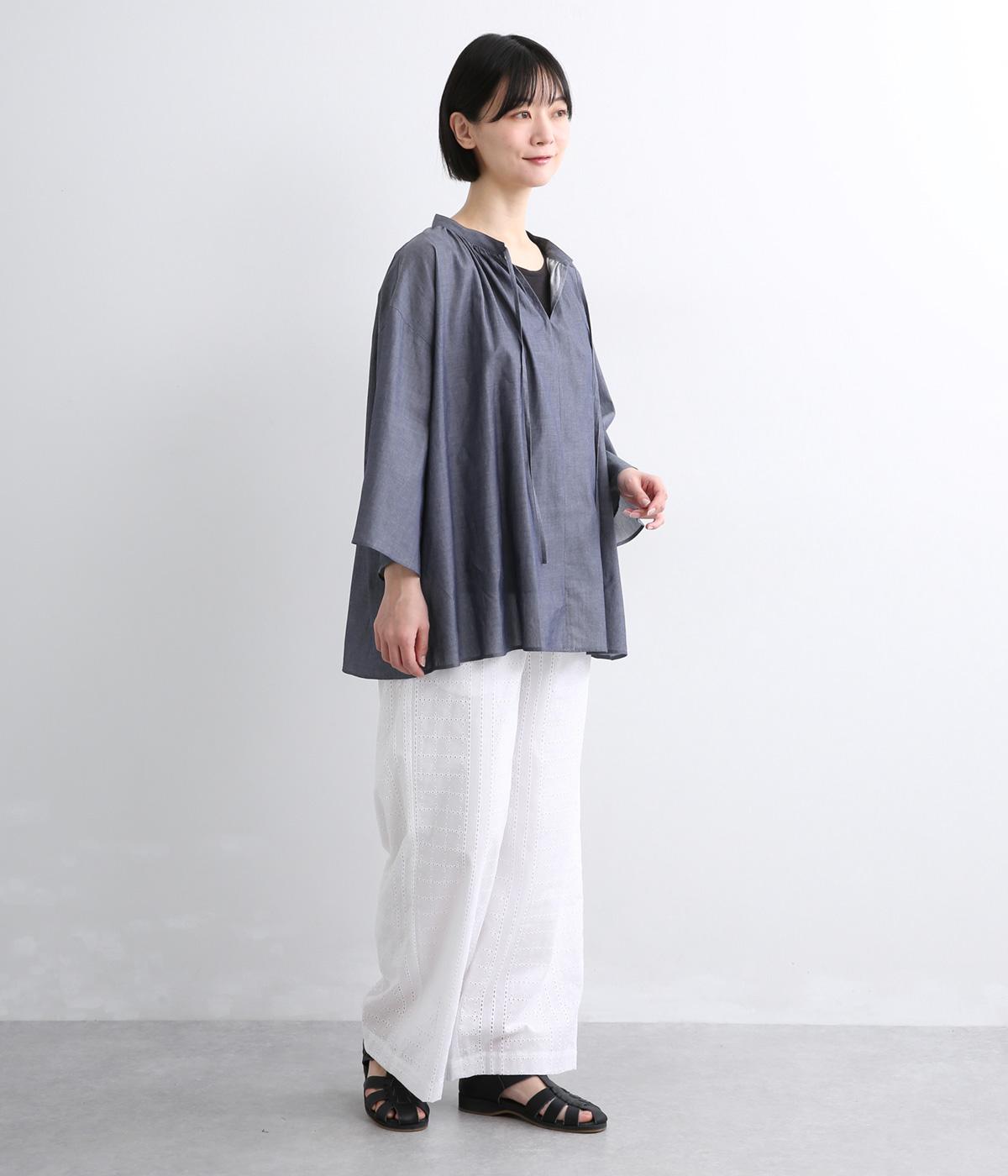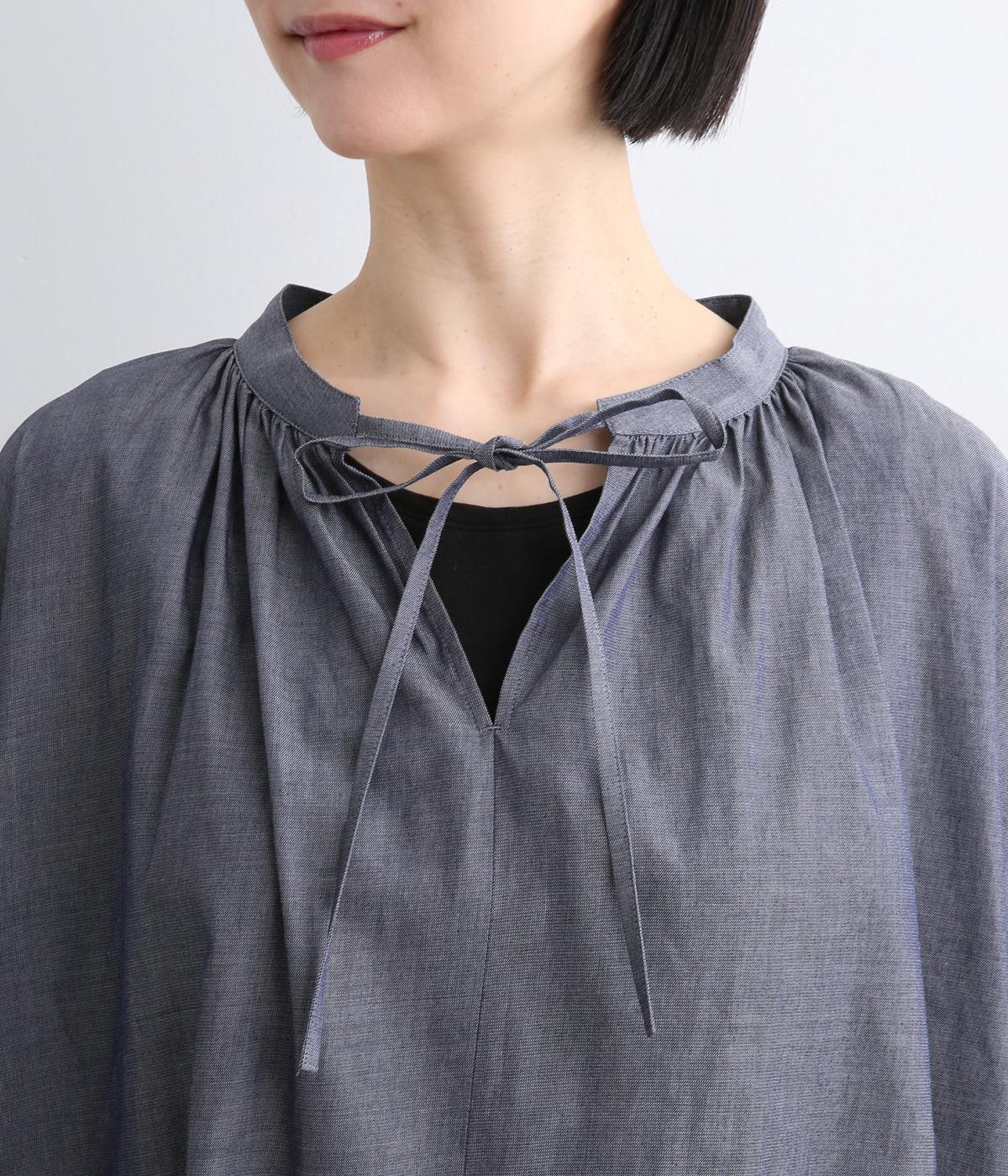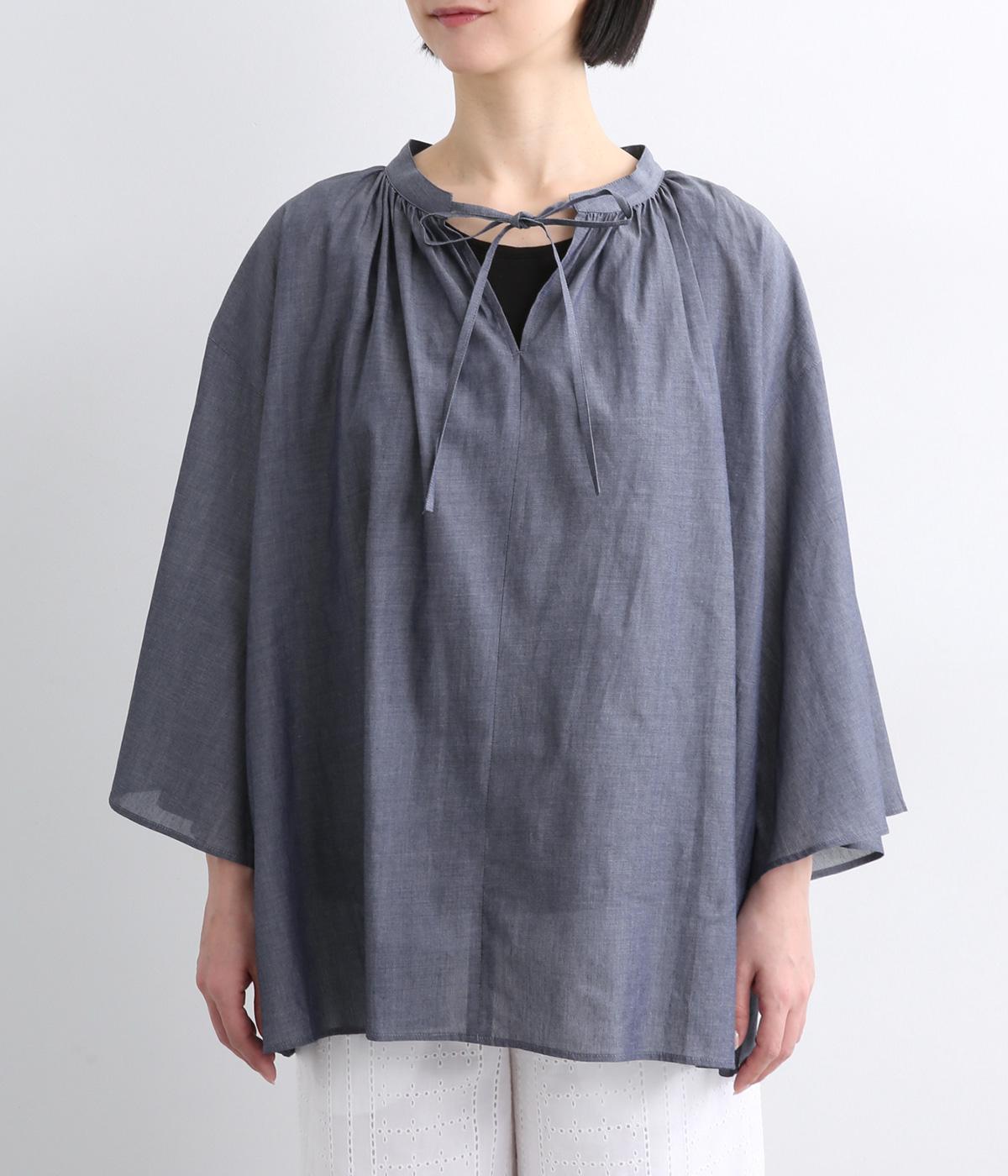 ゆったりした身頃やベルスリーブがきれいなドレープを描き、デニムシャツとはひと味違った華やかさのあるブラウス。スキッパーカラーはリボンを結んでワンポイントにしても◎。後ろ身頃を長くフレアに仕立て、どこから見ても着映え力のある一枚に。
