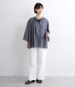 薄手ながらもパリッとしたハリ感が心地よいコットンデニム生地をセレクト。インディゴ染めならではの風合いがあり、ほのかな光沢感がナチュラルながらもきれいめな印象です。