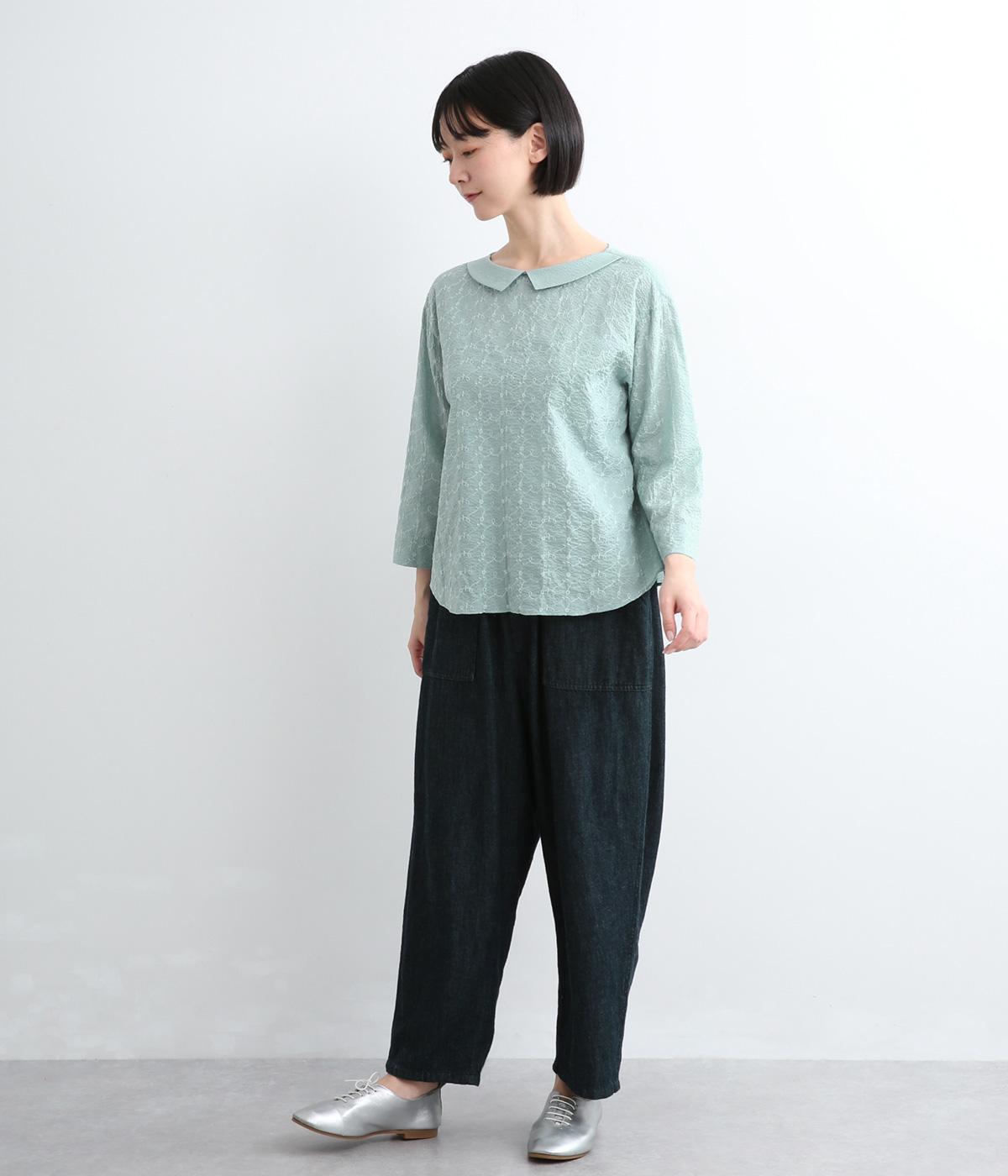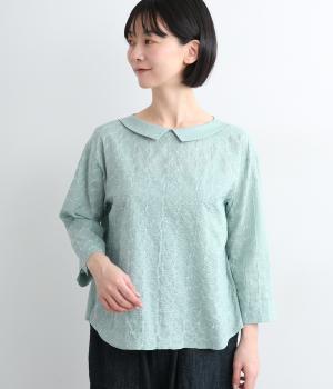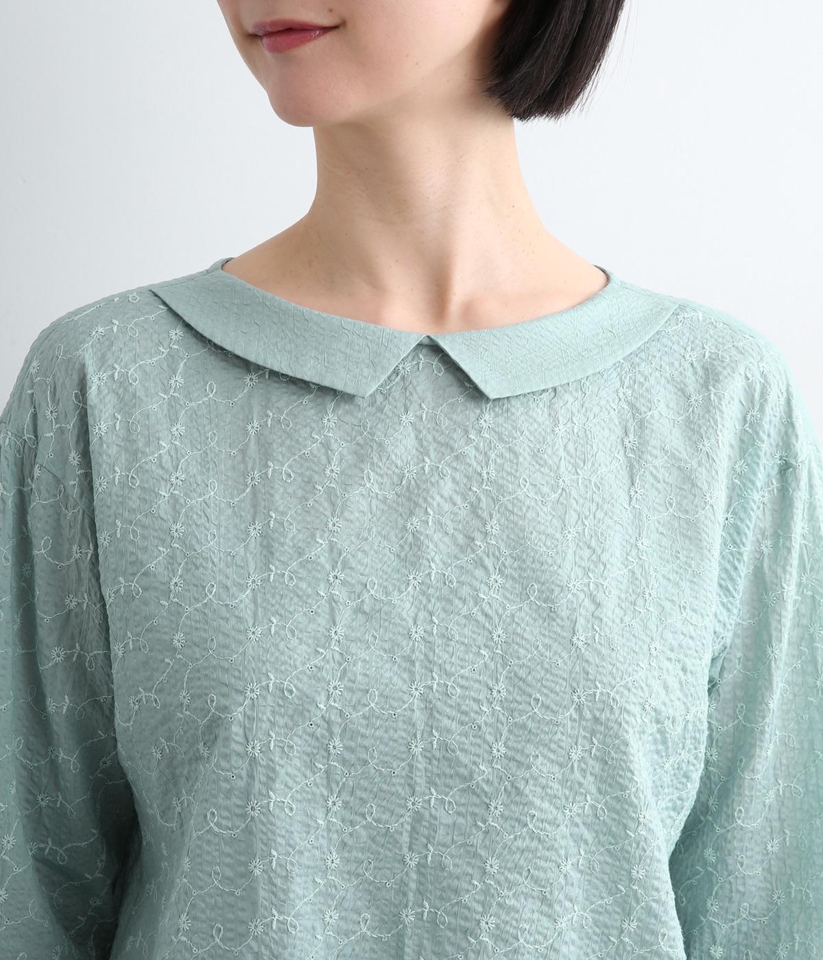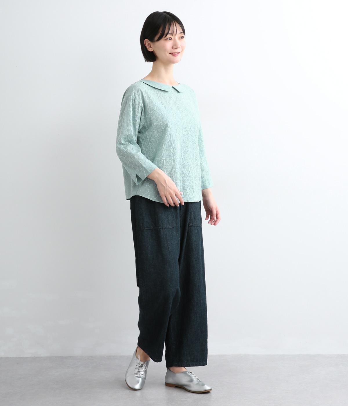 前身頃と袖にさり気なく刺しゅうをほどこし、フラットカラーブラウスのようにきれいめに仕立てたプルオーバー。裾はゆるやかにラウンドさせ、スリット入りの袖口は折り返して抜け感を出すのが◎。襟ぐり後ろはゴムを入れているので被りやすくなっています。