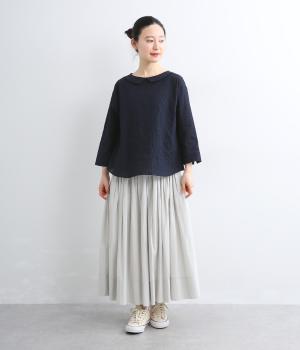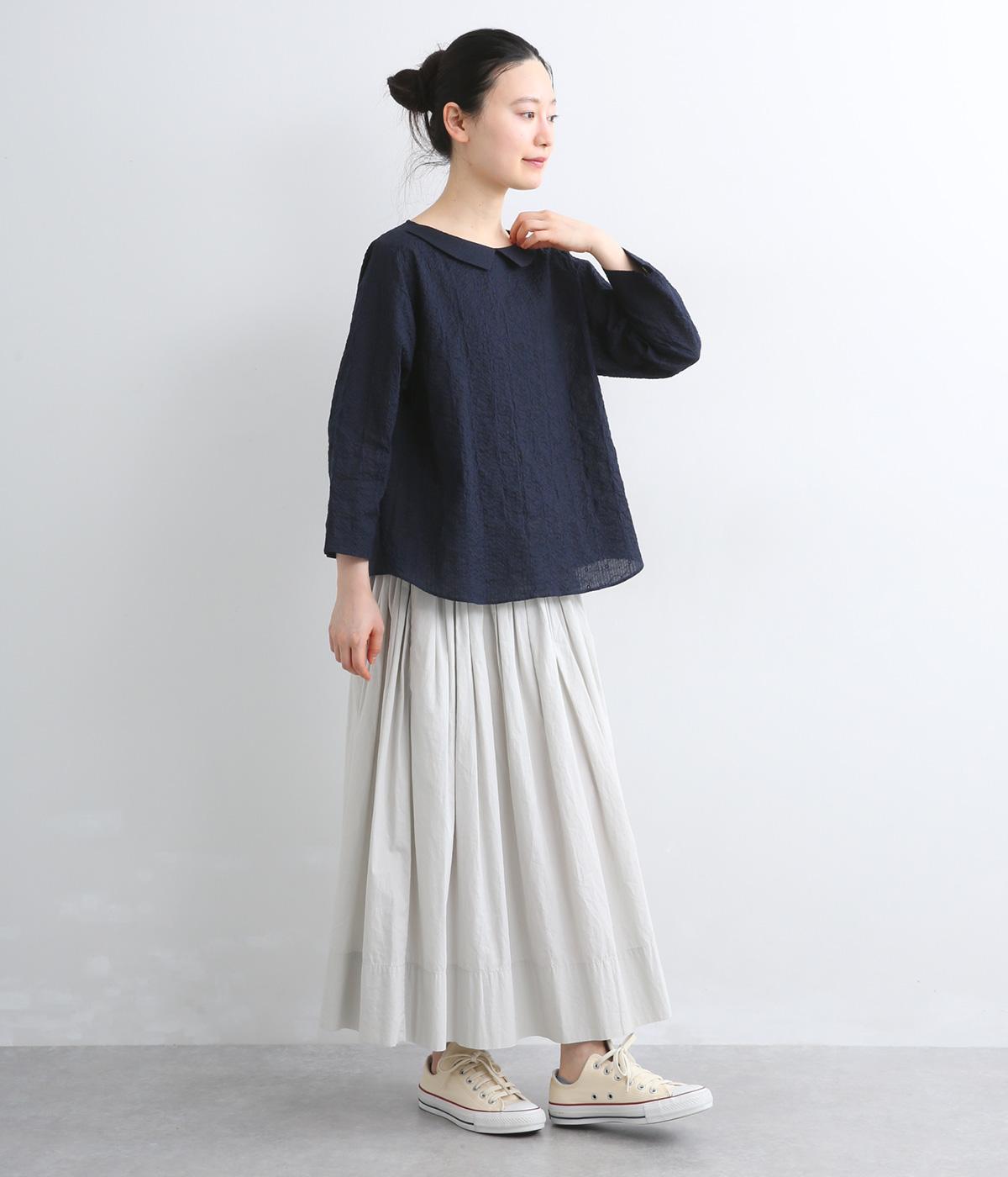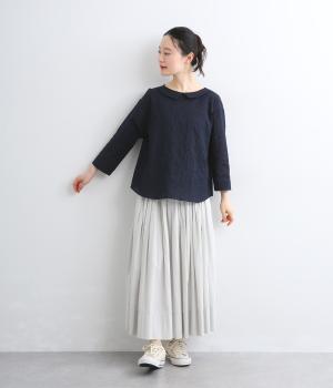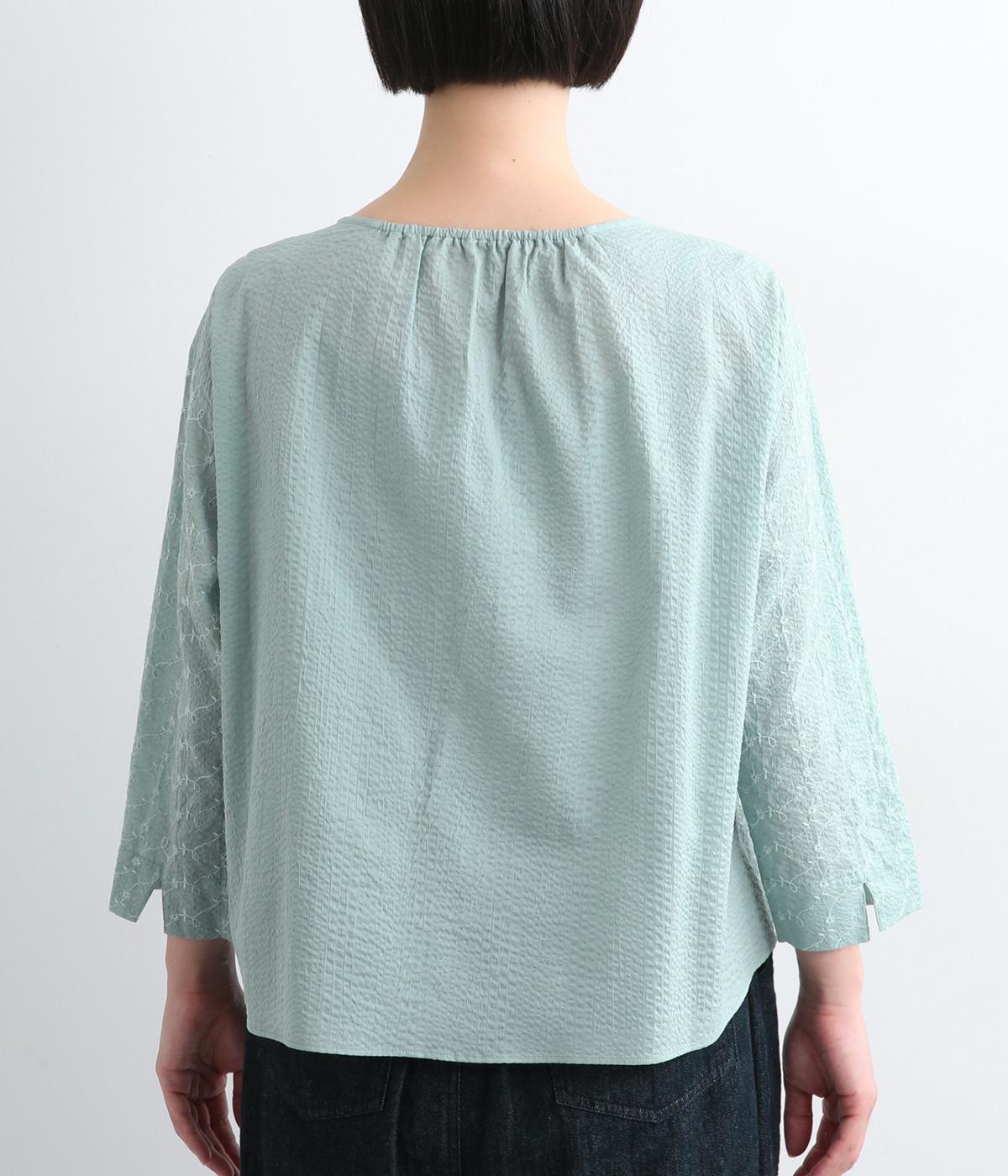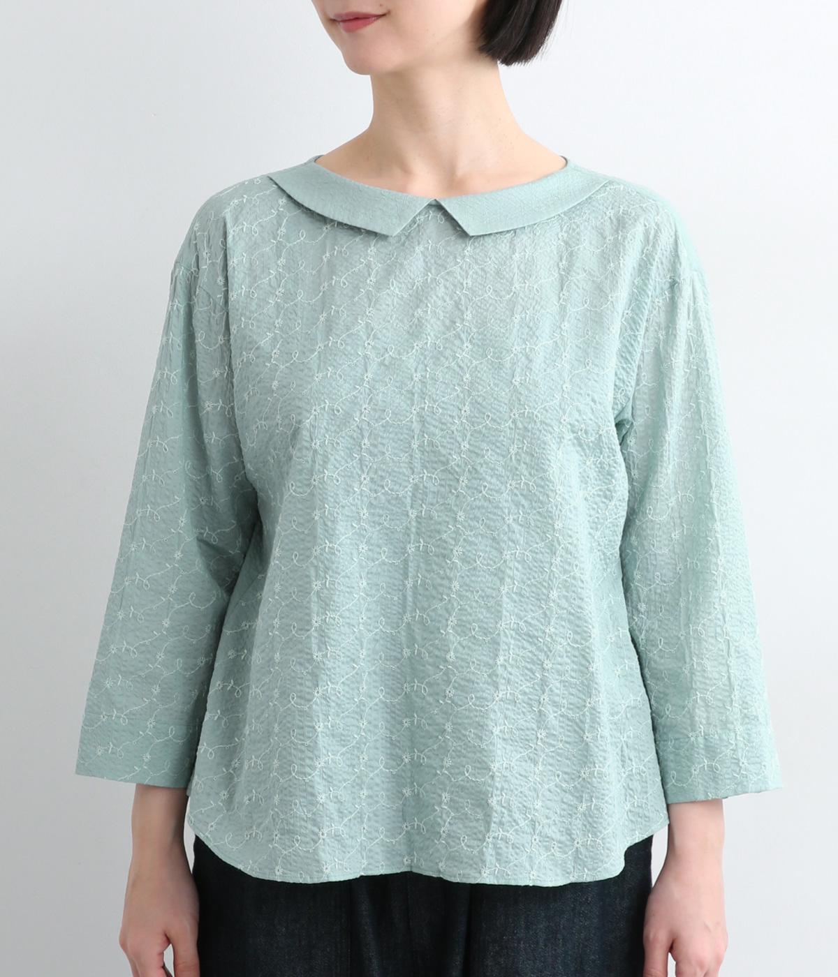 前身頃と袖にさり気なく刺しゅうをほどこし、フラットカラーブラウスのようにきれいめに仕立てたプルオーバー。裾はゆるやかにラウンドさせ、スリット入りの袖口は折り返して抜け感を出すのが◎。襟ぐり後ろはゴムを入れているので被りやすくなっています。