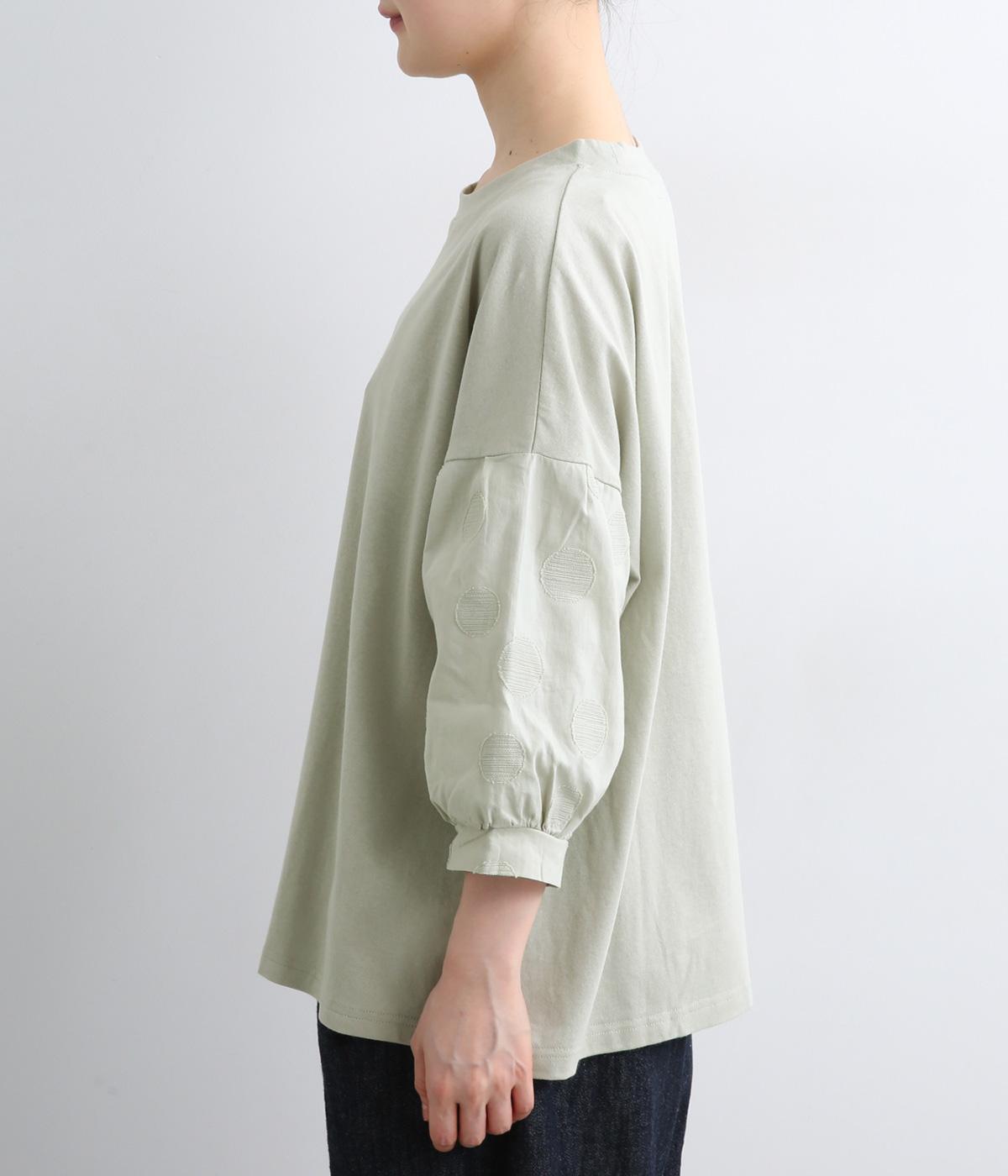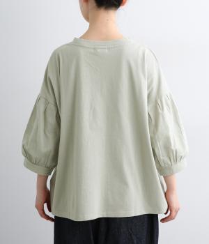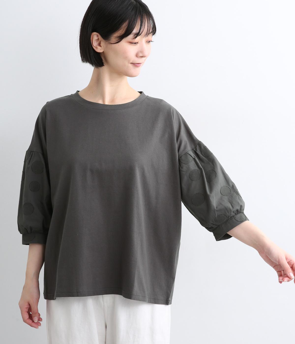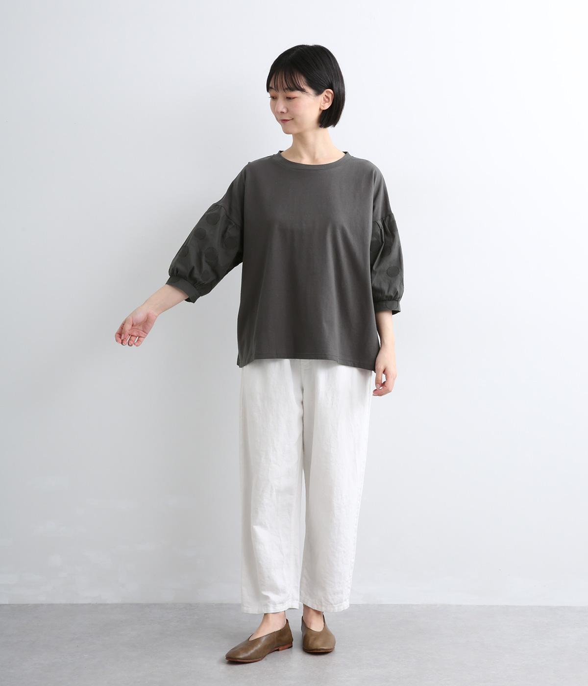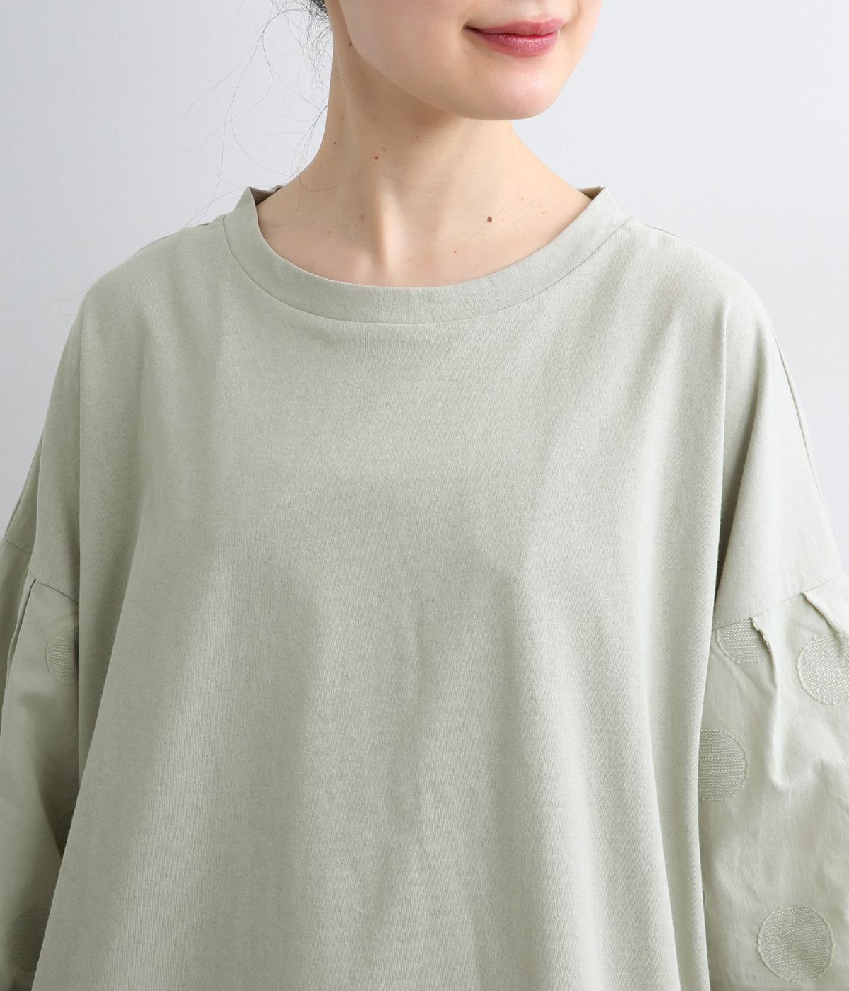 【素材】動きの多い身頃はやわらかな天竺素材で着心地よく仕立てました。袖はさらりとした軽やかな布帛に切り替えたドッキング仕様。【デザイン】キャンディーのようにふっくら立体感をつけたボリュームスリーブが特徴的な一枚。Tシャツのようにラフに着やすく、それでいてカジュアル感をおさえて着映え力をプラス。袖はさりげなくドット柄をきかせているのもポイント。
