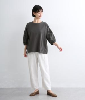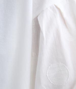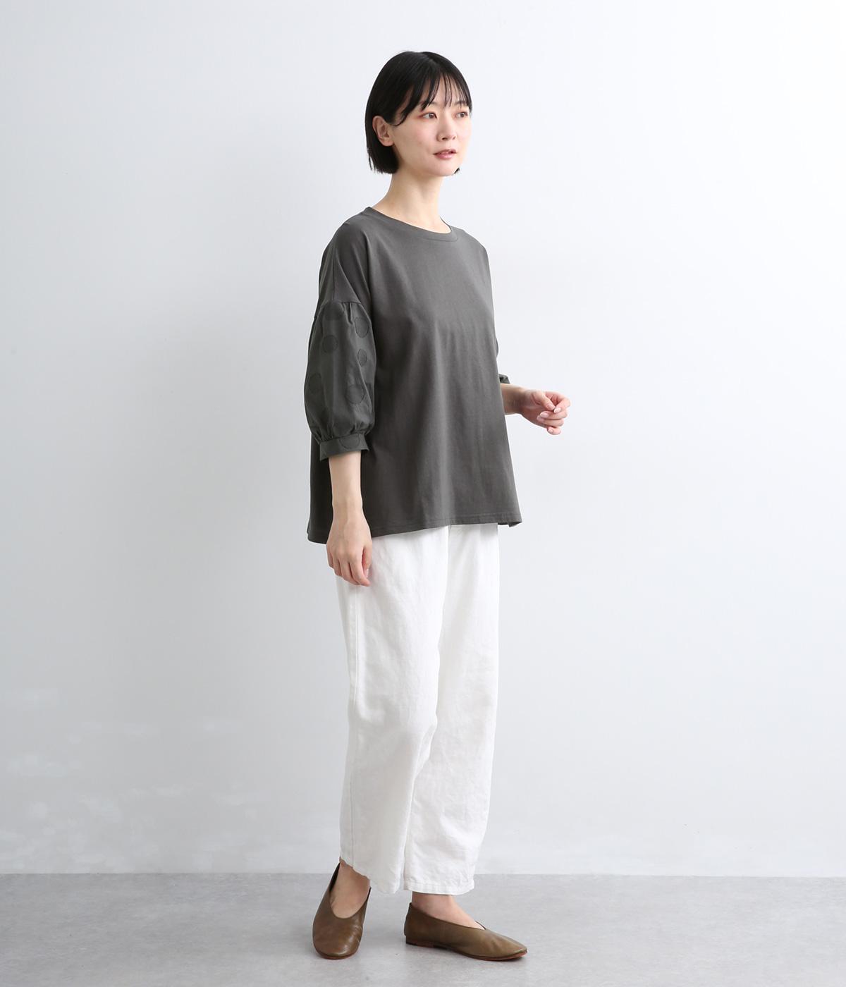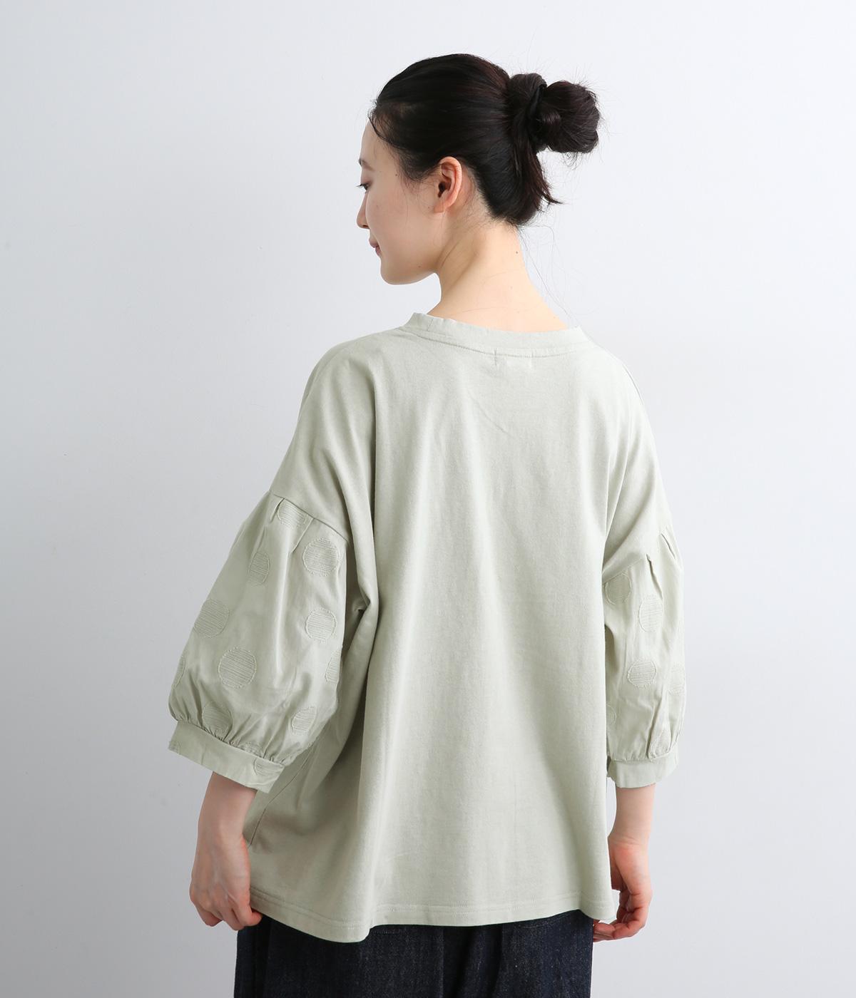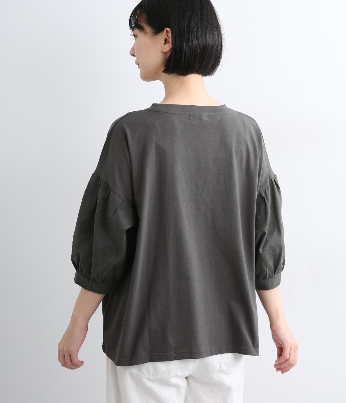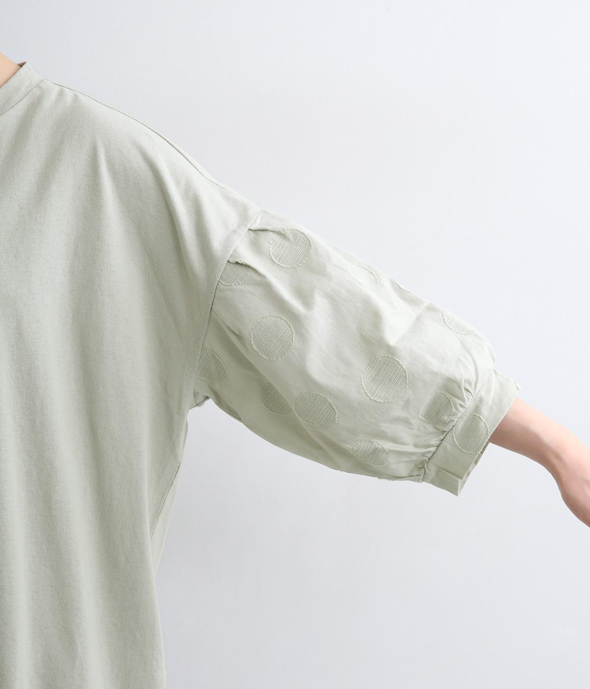 【素材】動きの多い身頃はやわらかな天竺素材で着心地よく仕立てました。袖はさらりとした軽やかな布帛に切り替えたドッキング仕様。【デザイン】キャンディーのようにふっくら立体感をつけたボリュームスリーブが特徴的な一枚。Tシャツのようにラフに着やすく、それでいてカジュアル感をおさえて着映え力をプラス。袖はさりげなくドット柄をきかせているのもポイント。