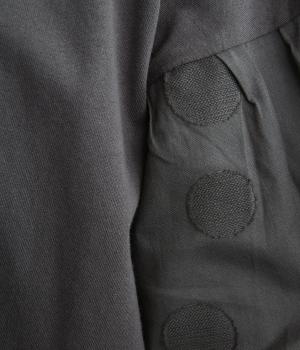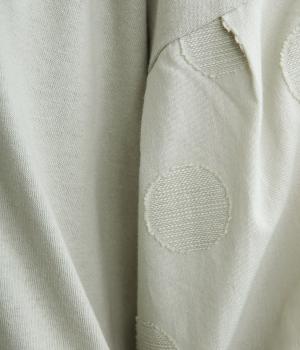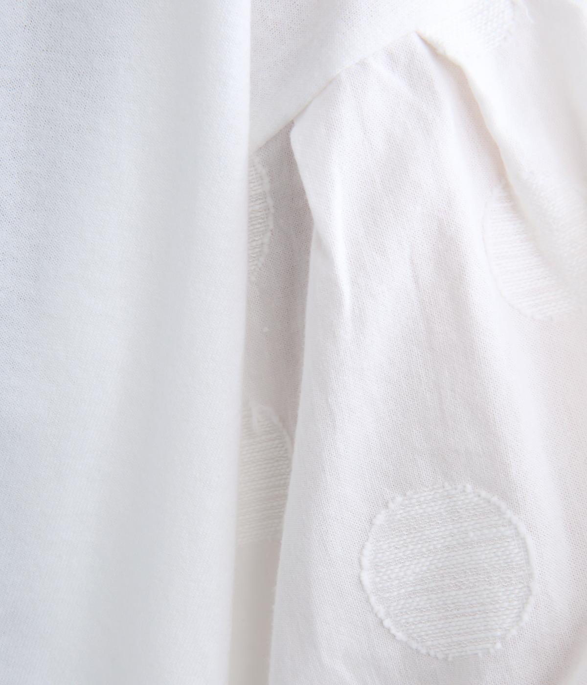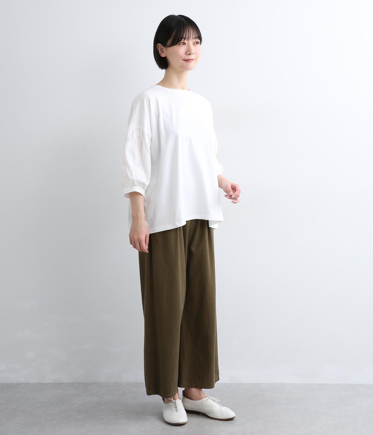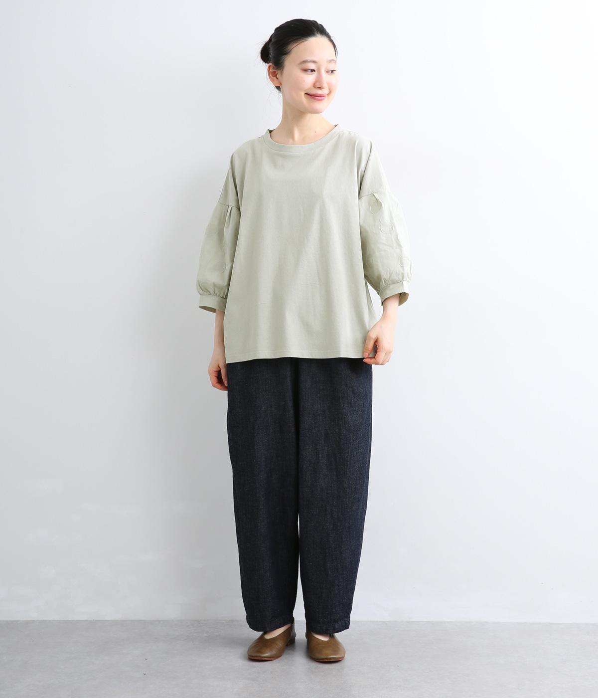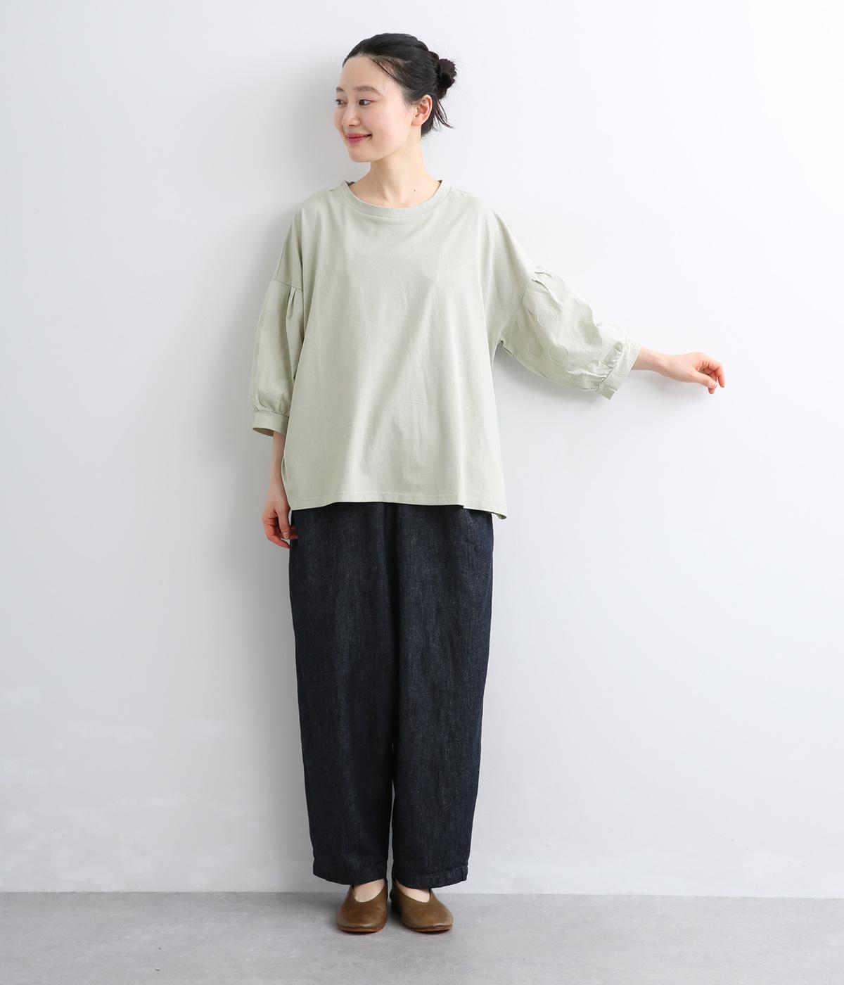 【素材】動きの多い身頃はやわらかな天竺素材で着心地よく仕立てました。袖はさらりとした軽やかな布帛に切り替えたドッキング仕様。【デザイン】キャンディーのようにふっくら立体感をつけたボリュームスリーブが特徴的な一枚。Tシャツのようにラフに着やすく、それでいてカジュアル感をおさえて着映え力をプラス。袖はさりげなくドット柄をきかせているのもポイント。