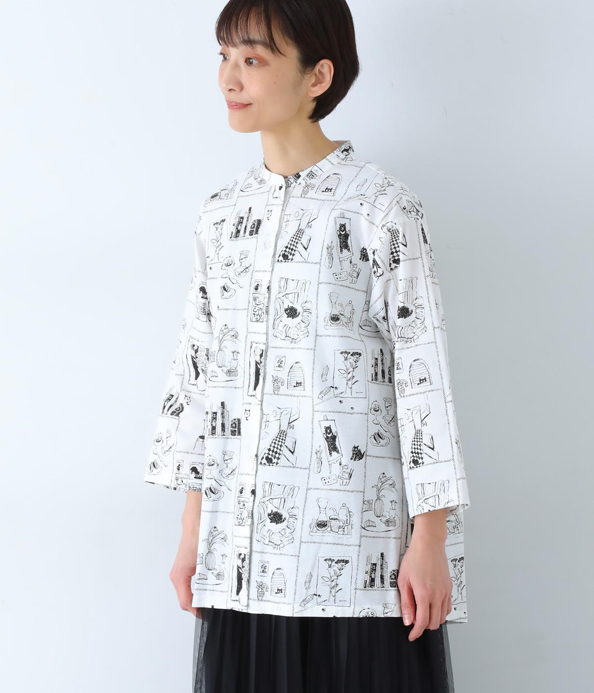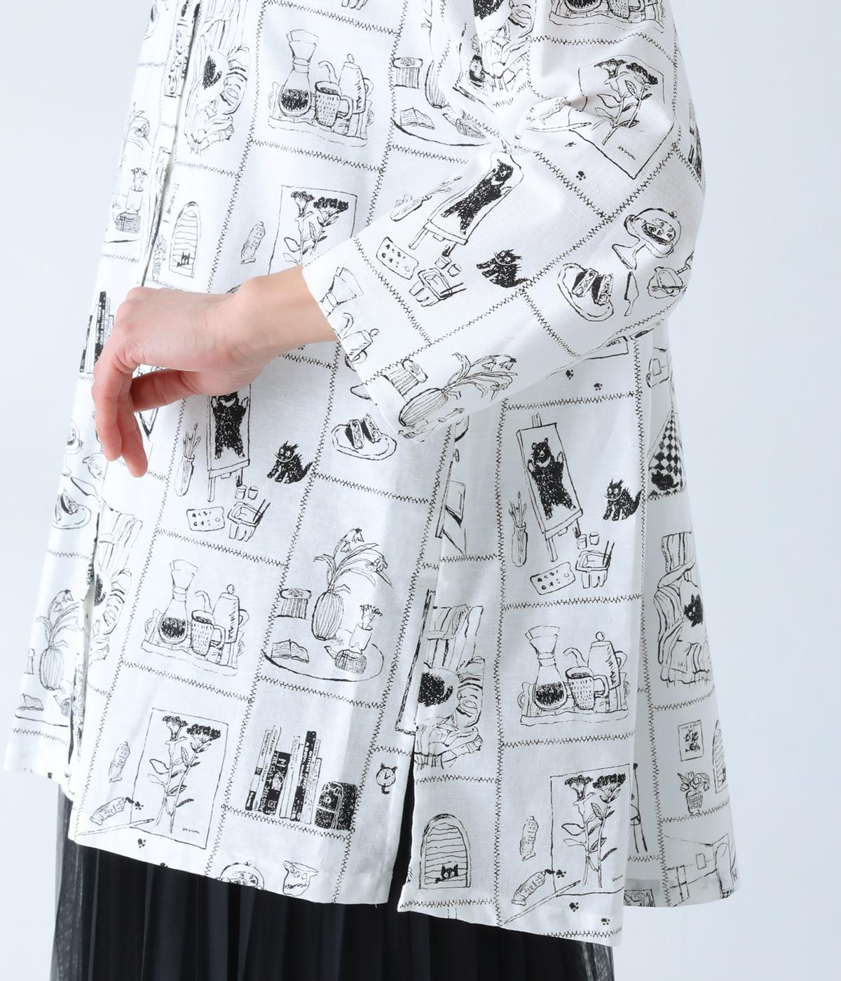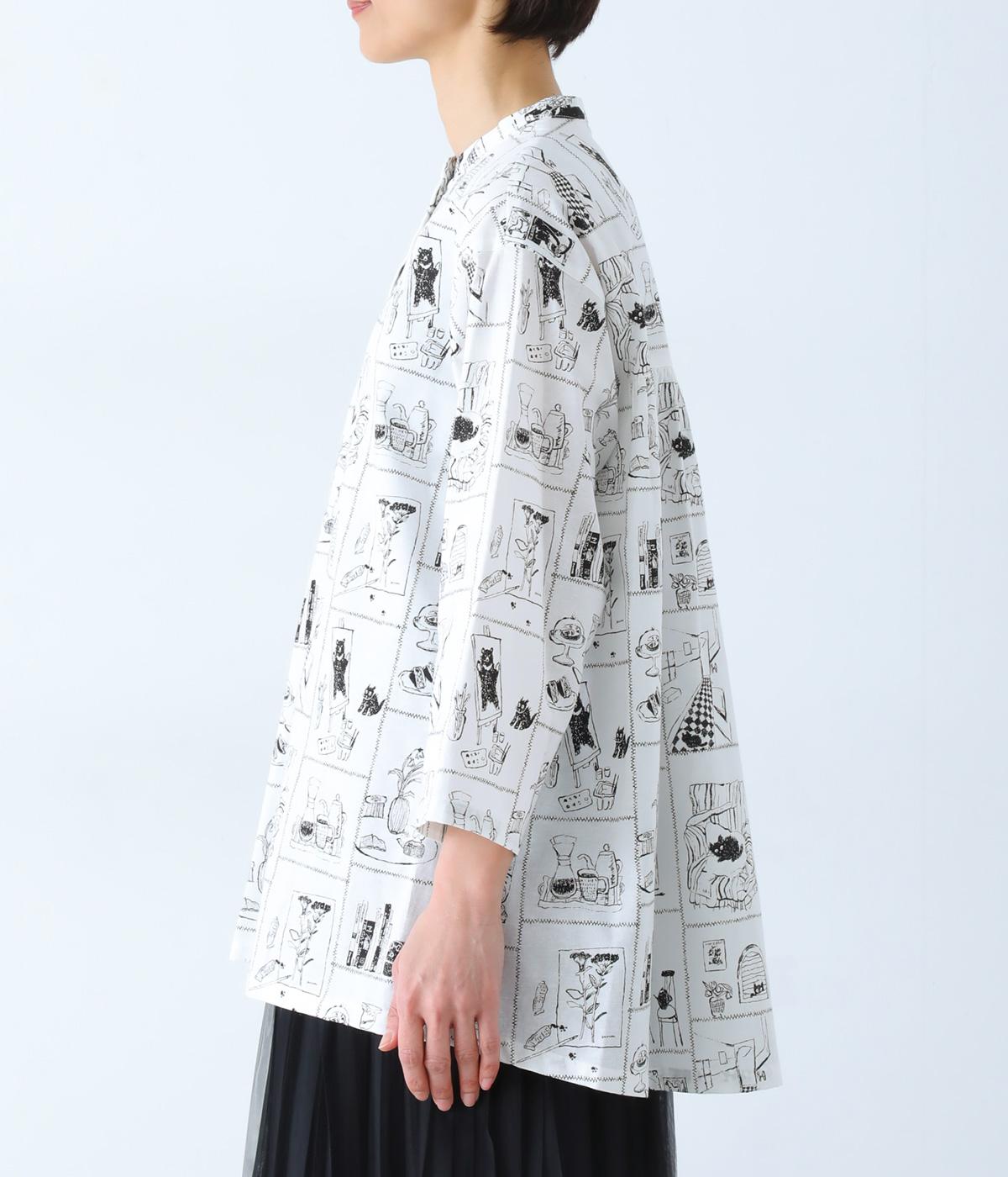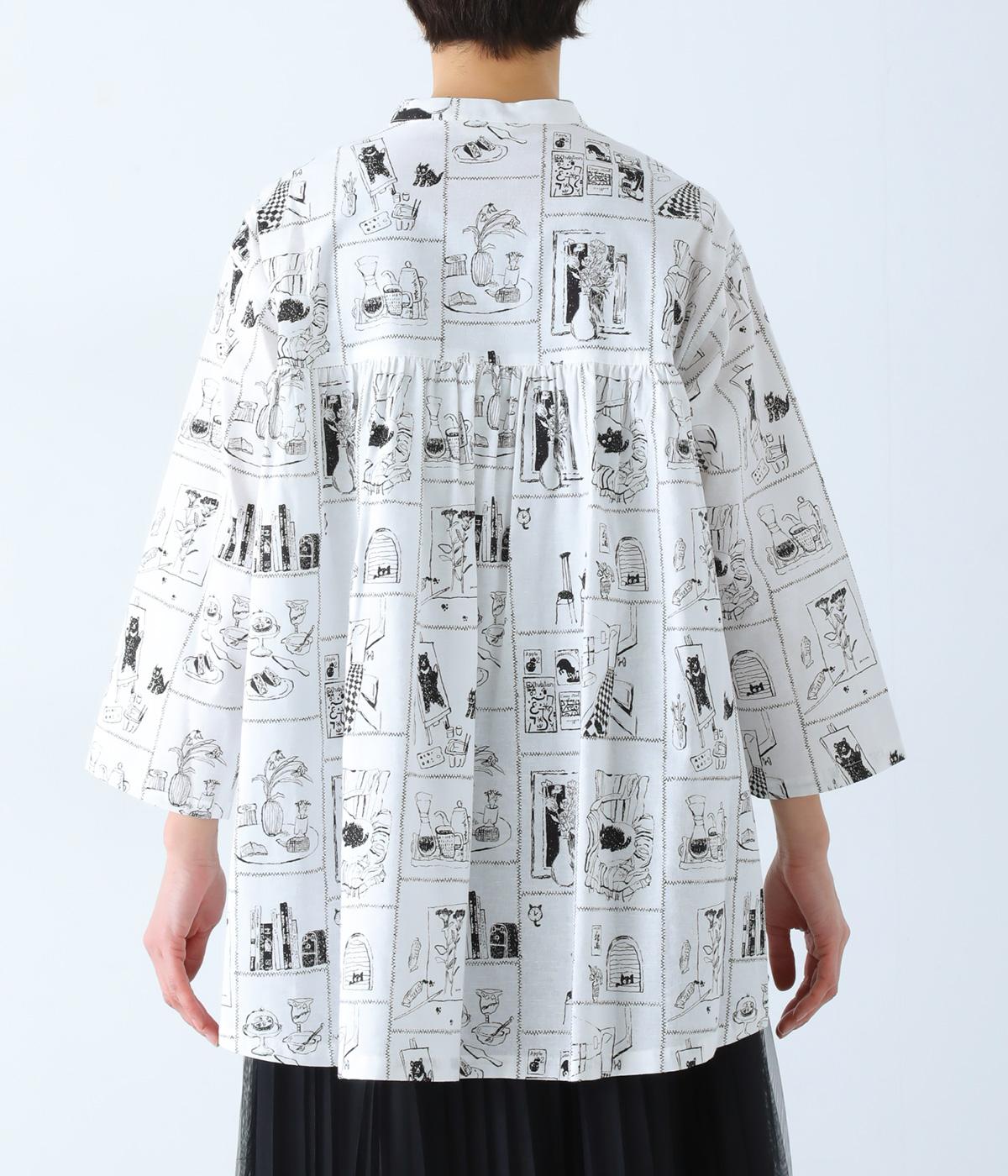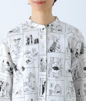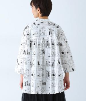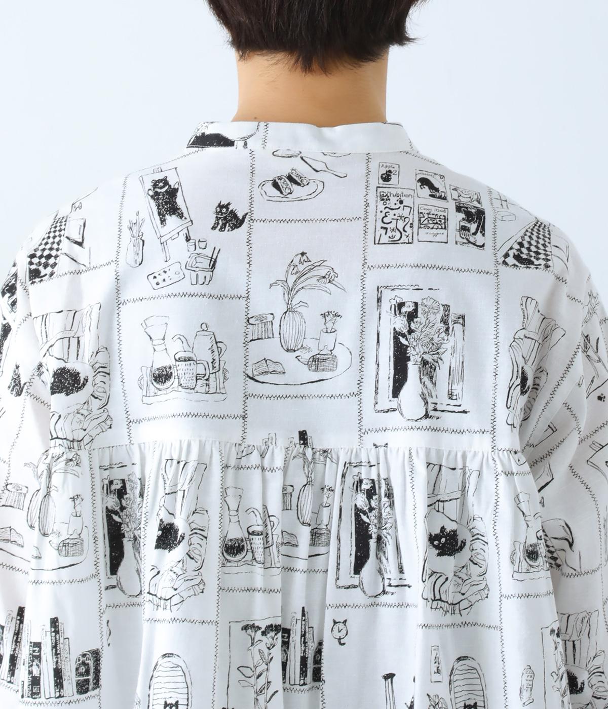家の中のさまざまなシーンを描いたプリントが個性を放ちます。背中のヨークにたっぷりとほどこしたギャザーや腰まわりをカバーする着丈で、ふんわりとゆとりのあるシルエットに仕立てました。一枚でスタイリングが完成する、主役トップスです。