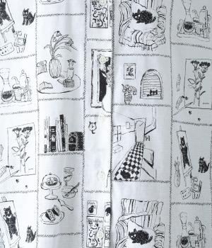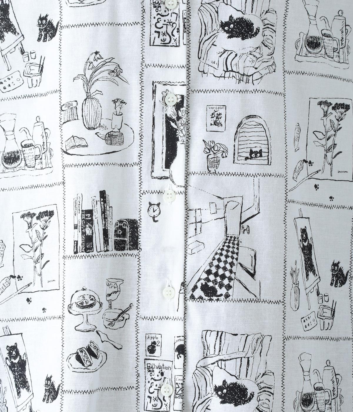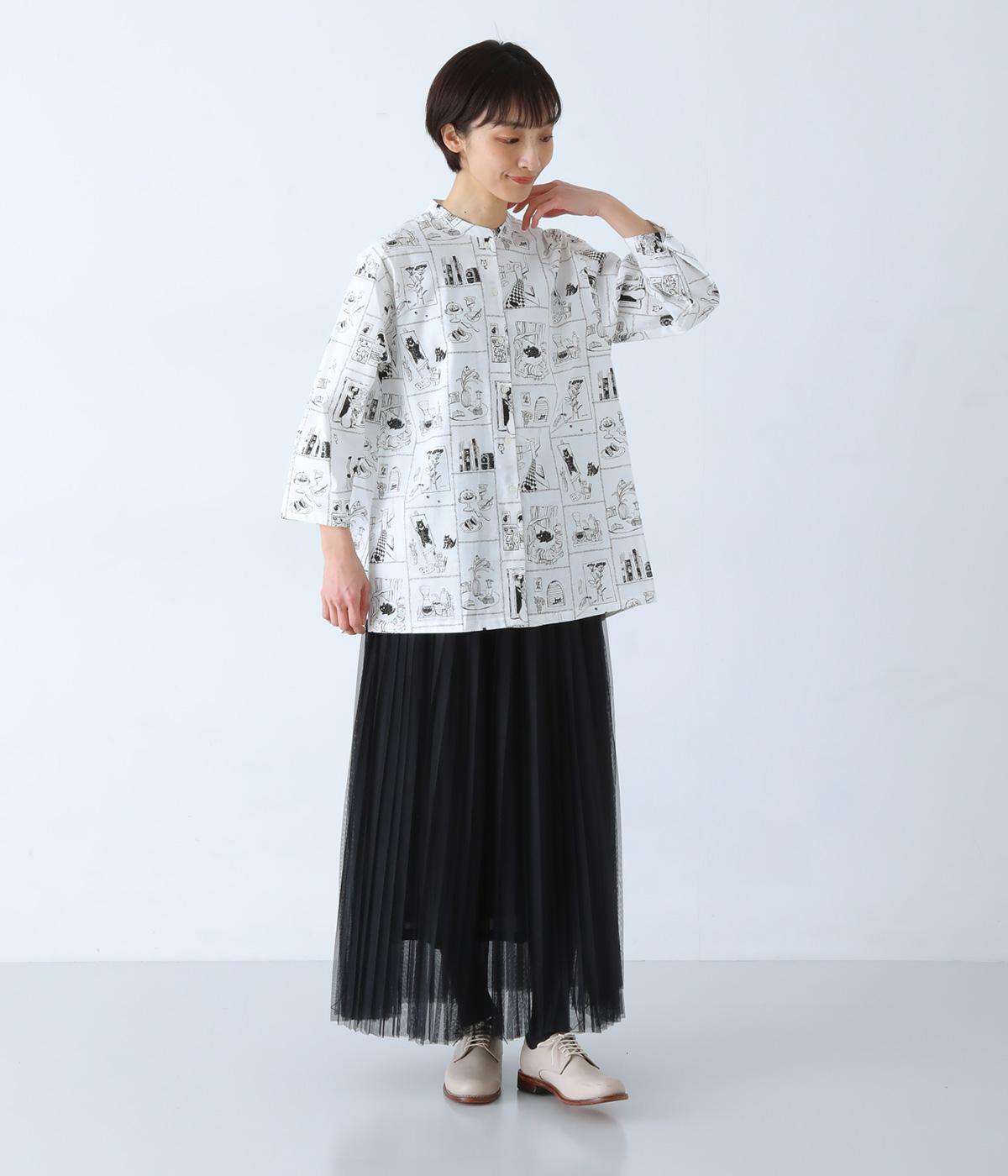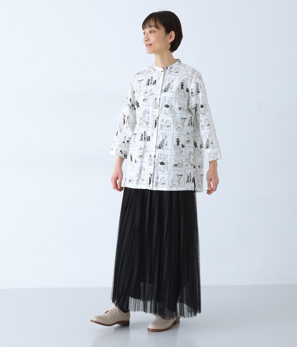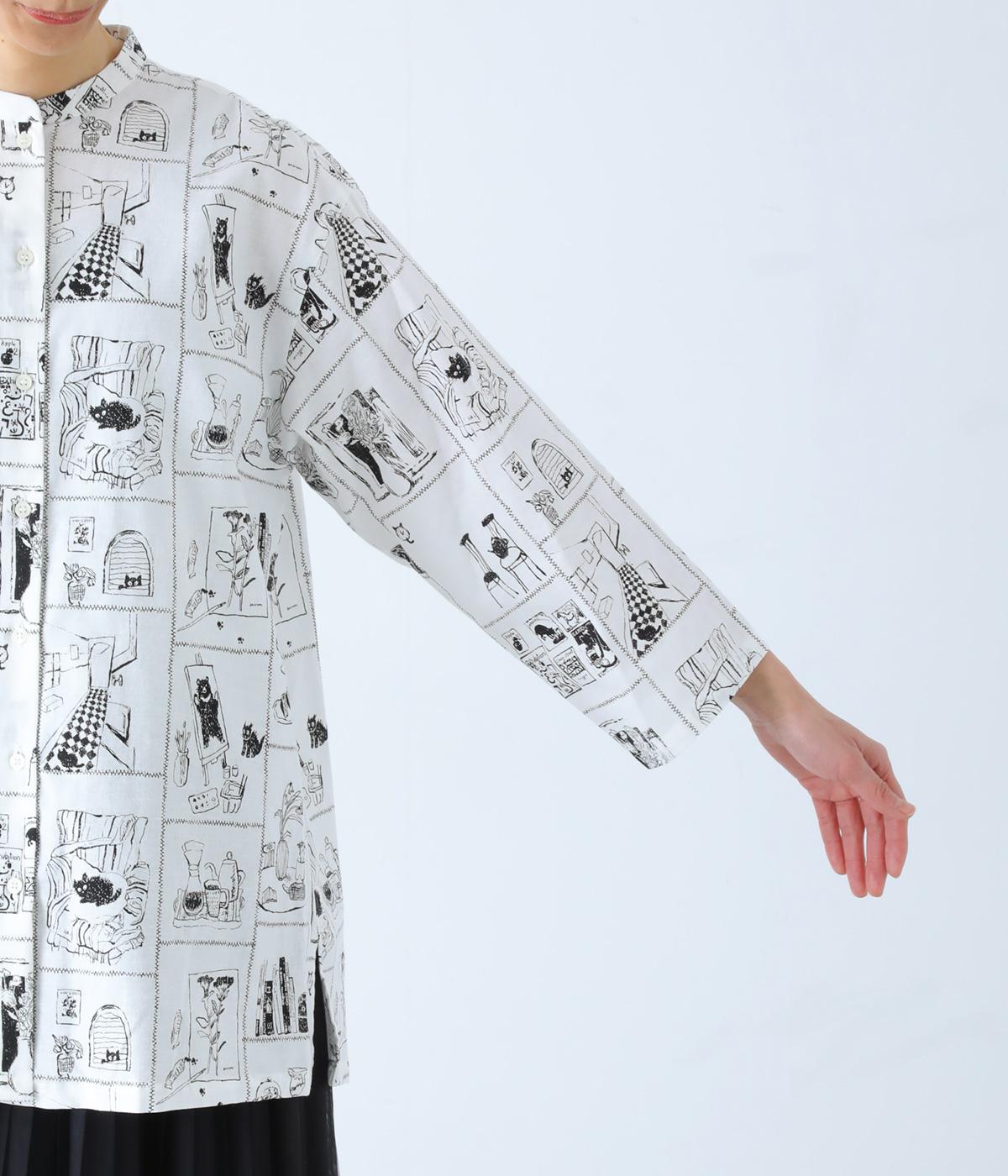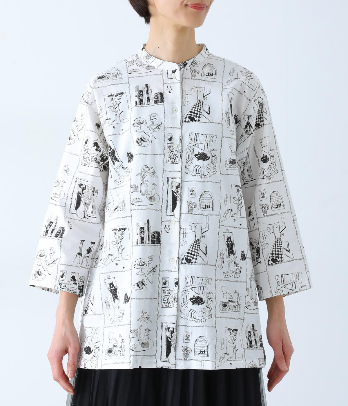 家の中のさまざまなシーンを描いたプリントが個性を放ちます。背中のヨークにたっぷりとほどこしたギャザーや腰まわりをカバーする着丈で、ふんわりとゆとりのあるシルエットに仕立てました。一枚でスタイリングが完成する、主役トップスです。