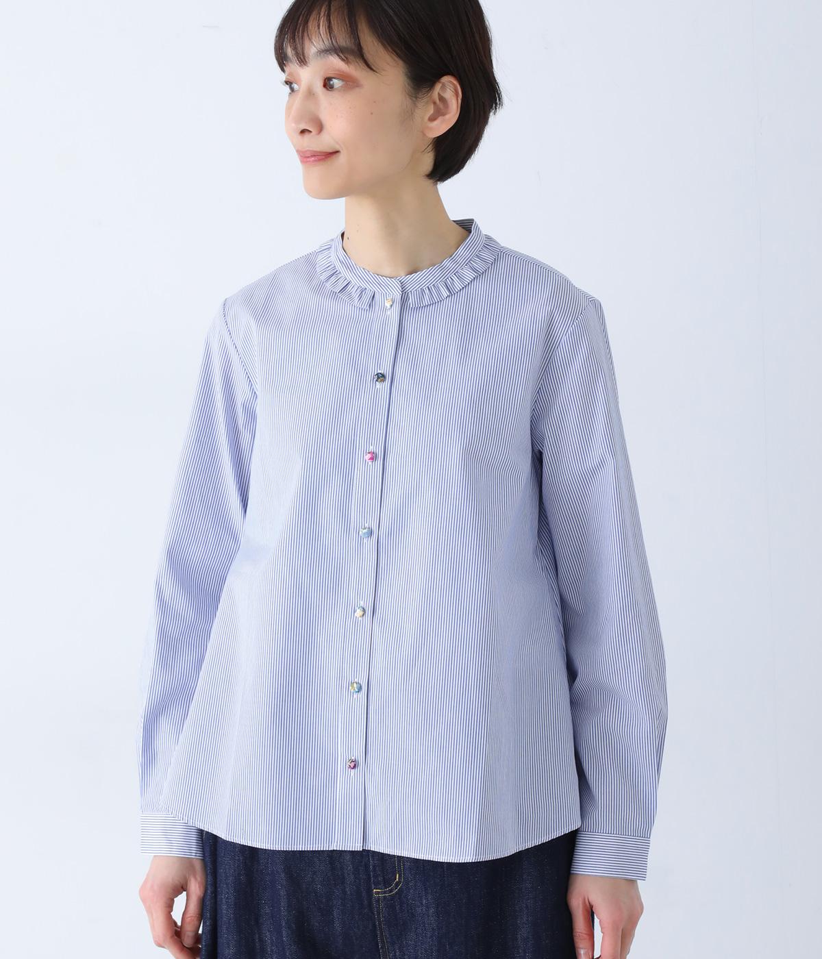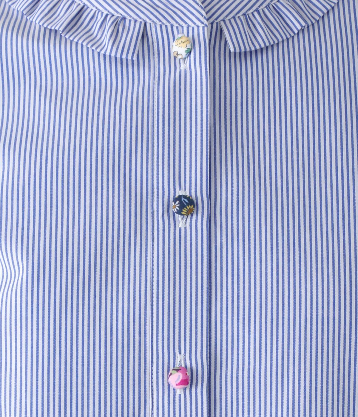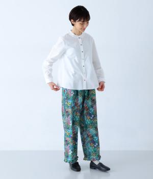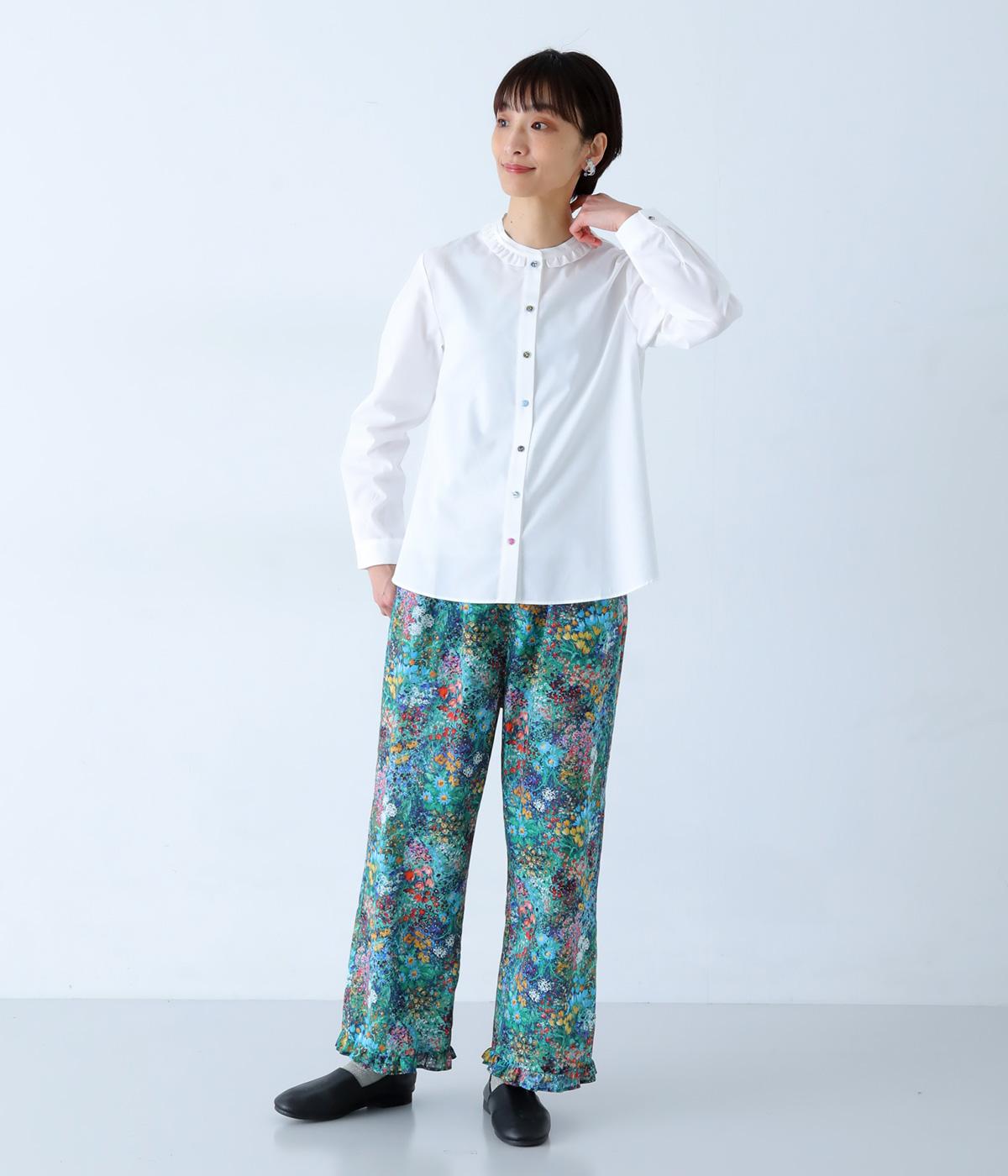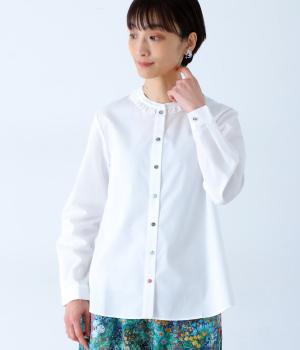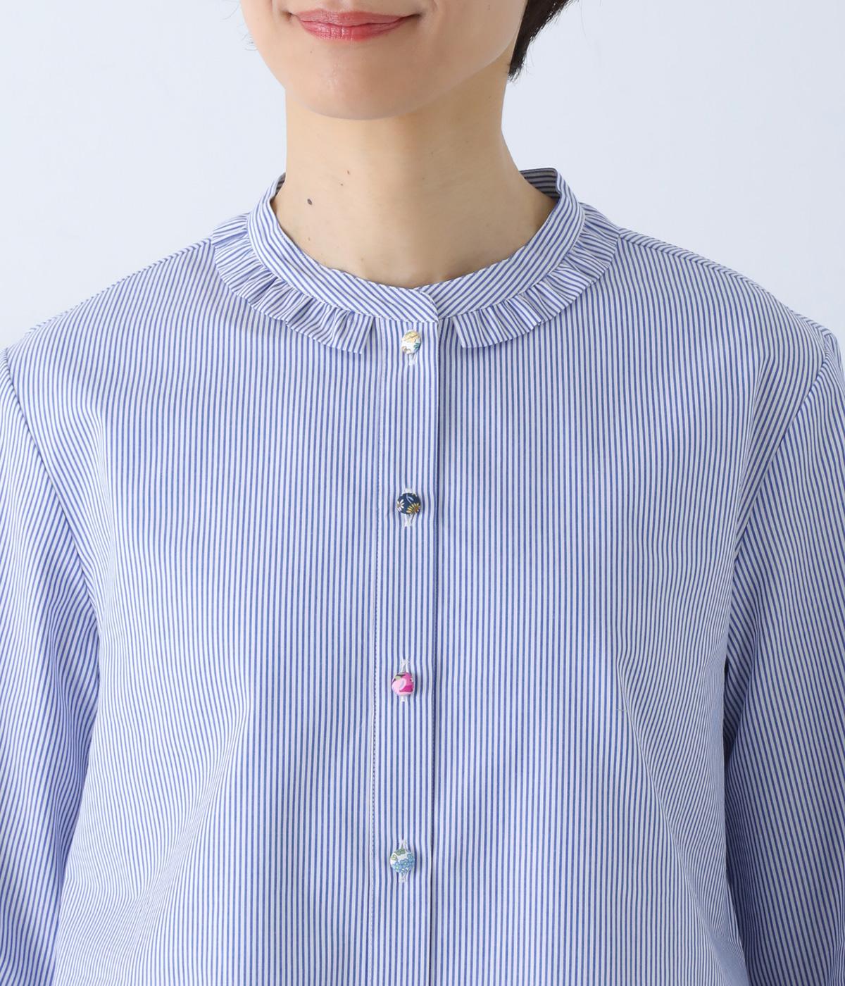 Parkesでは定番のLIBERTYくるみボタンを使用した、すっきりシルエットのフリル付きブラウスです。フラットカラーのフリルで首まわりの締め付け感なく、華やかな印象だけ添えてくれます。