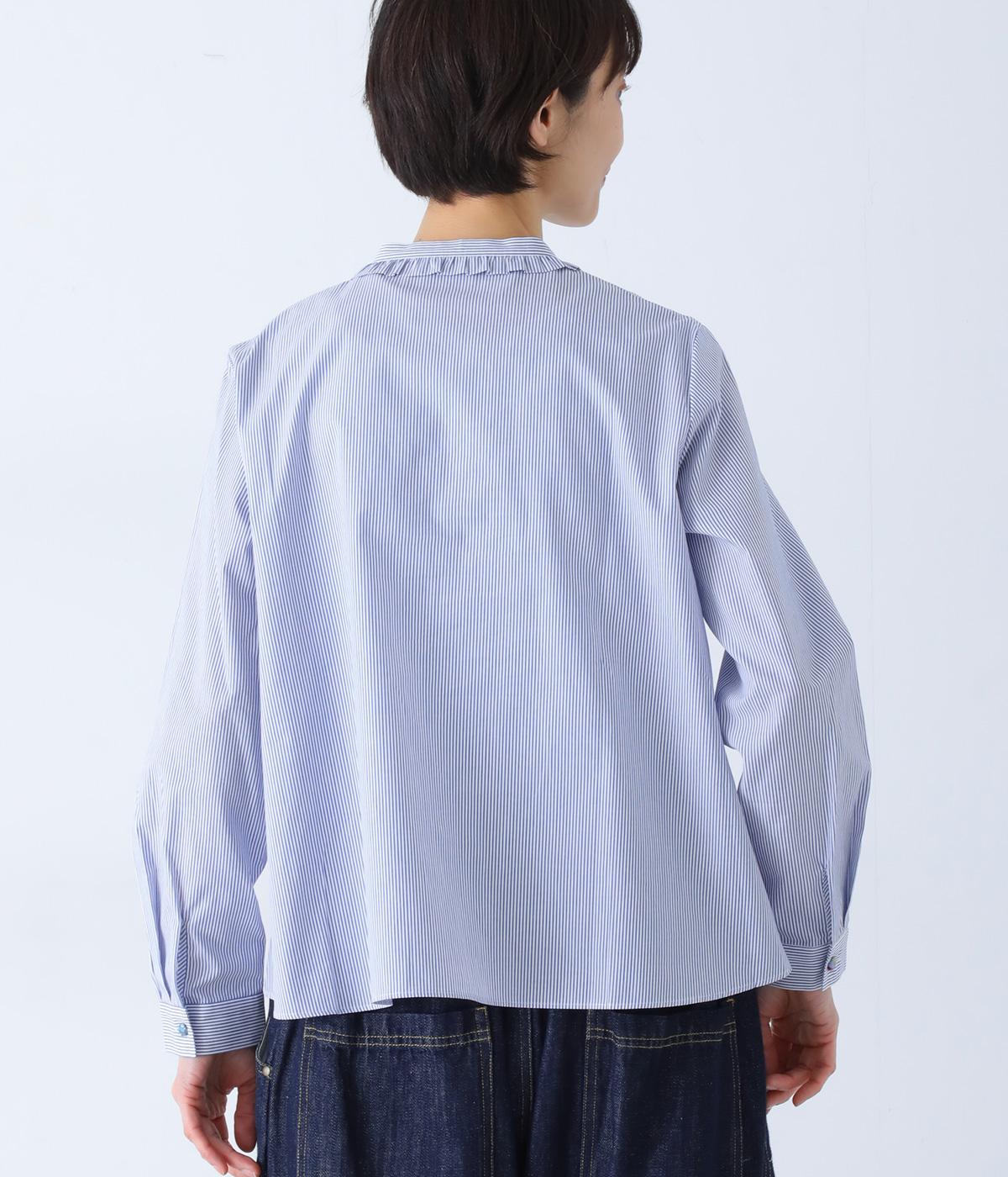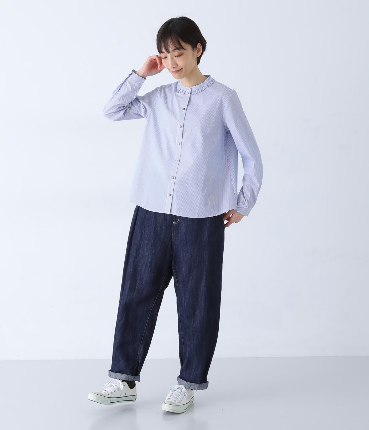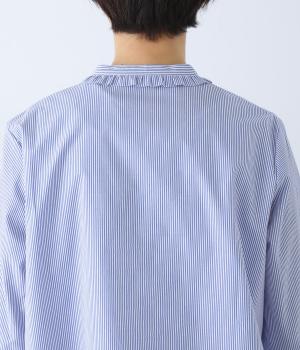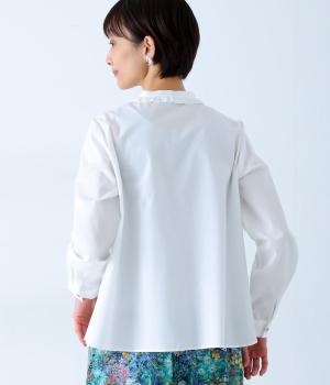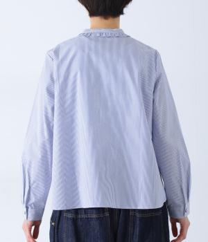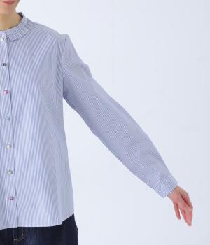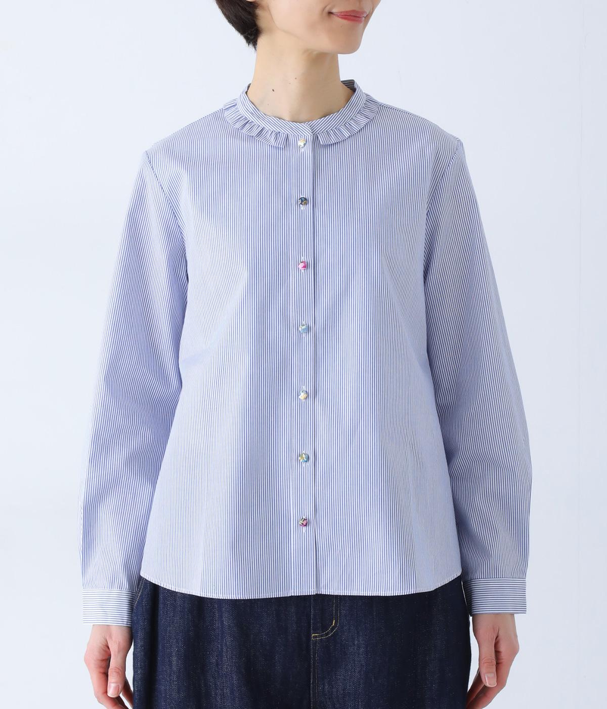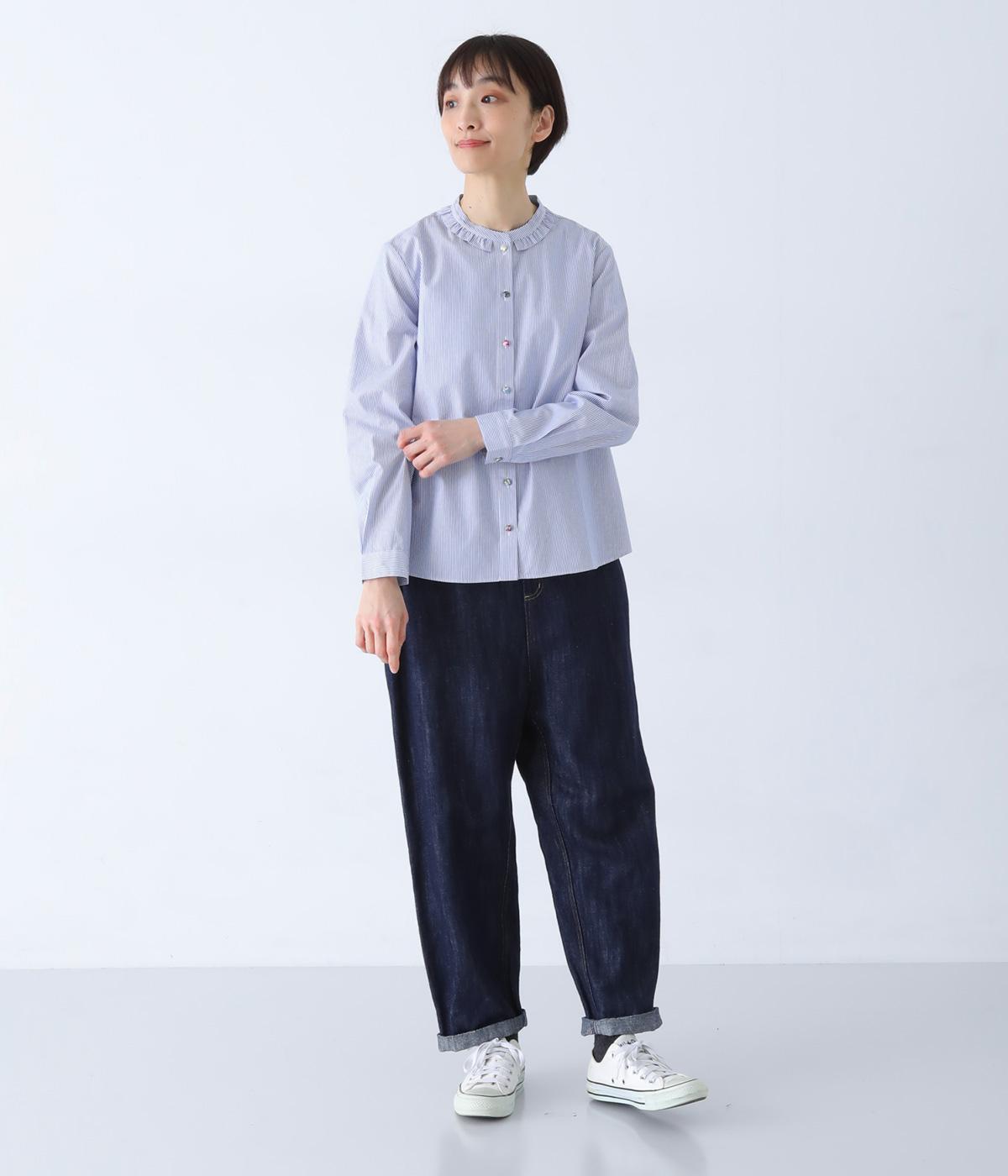Parkesでは定番のLIBERTYくるみボタンを使用した、すっきりシルエットのフリル付きブラウスです。フラットカラーのフリルで首まわりの締め付け感なく、華やかな印象だけ添えてくれます。