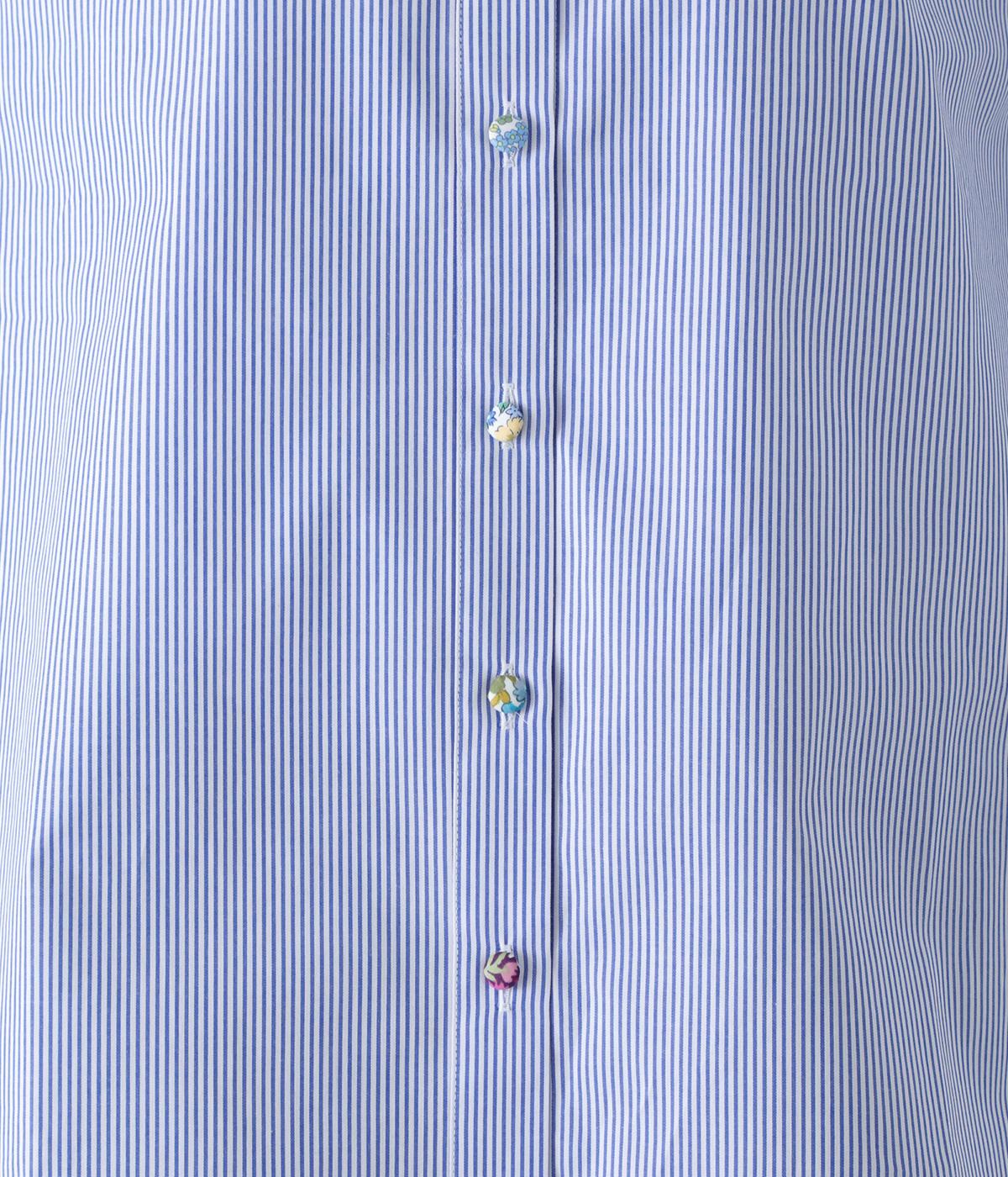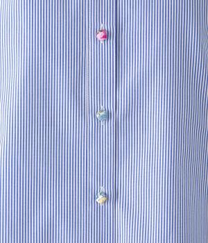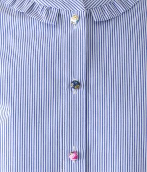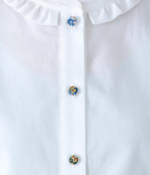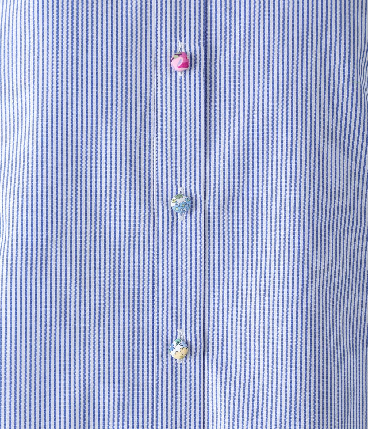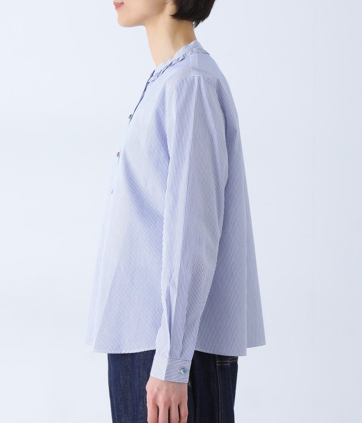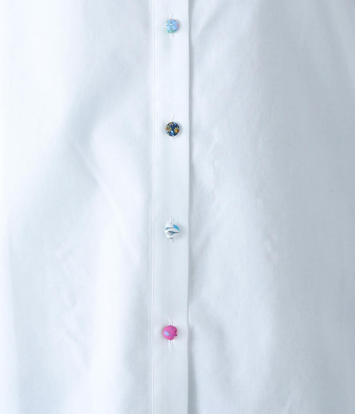 Parkesでは定番のLIBERTYくるみボタンを使用した、すっきりシルエットのフリル付きブラウスです。フラットカラーのフリルで首まわりの締め付け感なく、華やかな印象だけ添えてくれます。