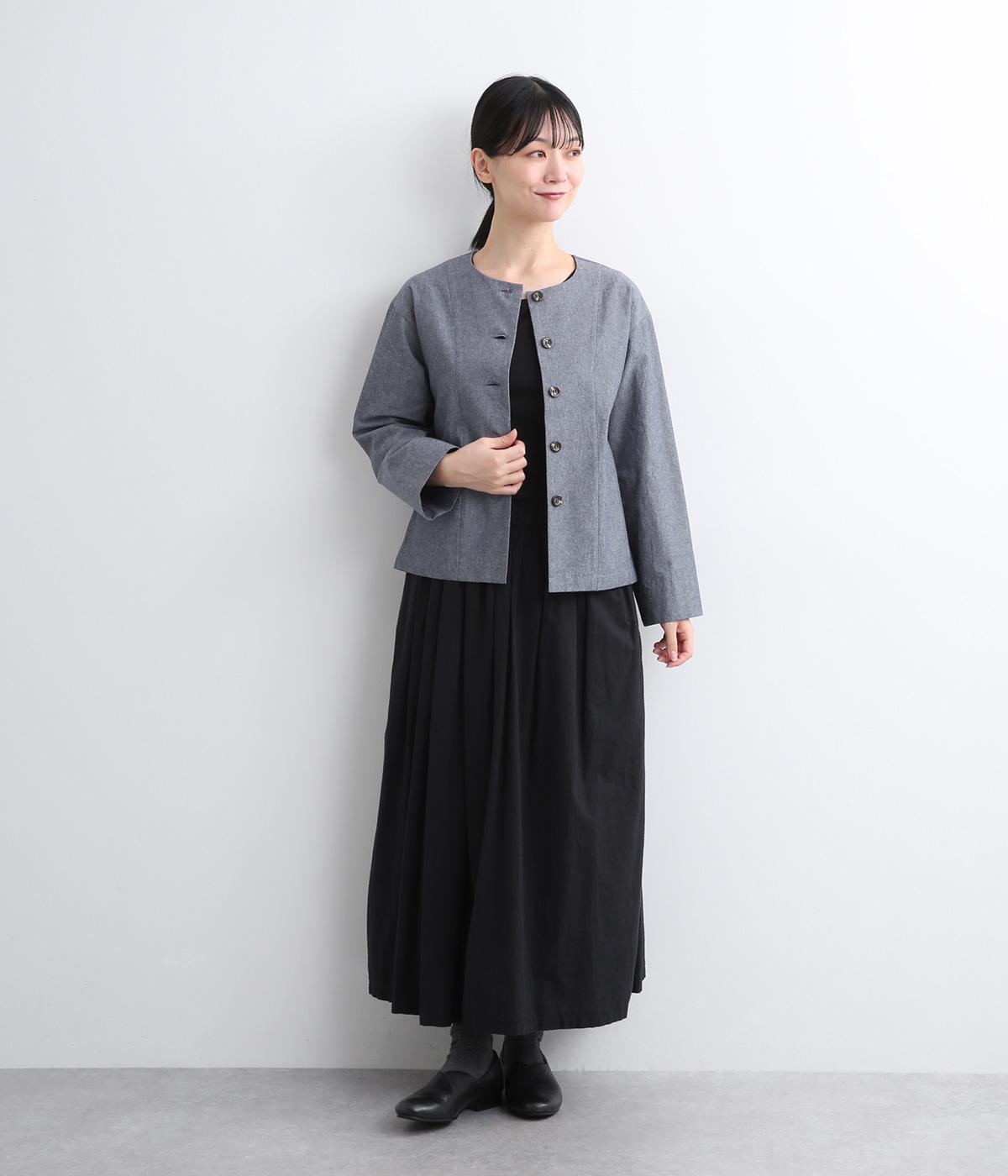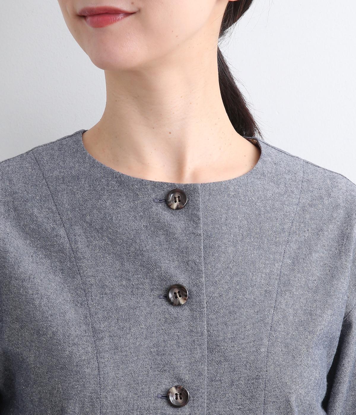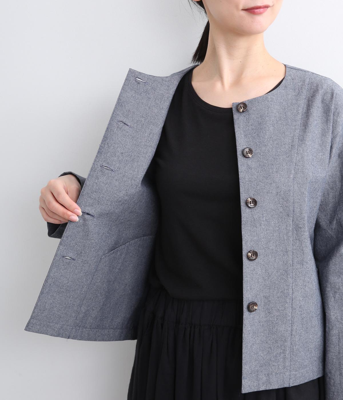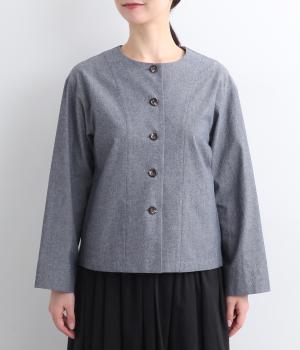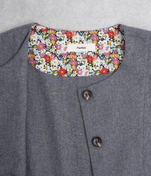 品のいいラウンドネックのノーカラージャケットを、ナチュラル素材でデイリー使いしやすく仕立てました。スタイリングしやすいすっきりとしたボックス型も◎。後ろ見返し部分にあてたリバティプリントが脱ぎ着したときにちらりとのぞいてワンポイントに。