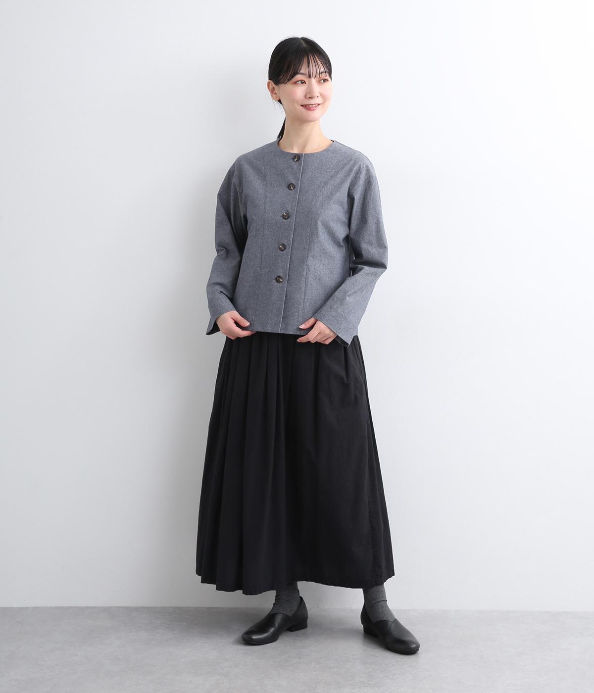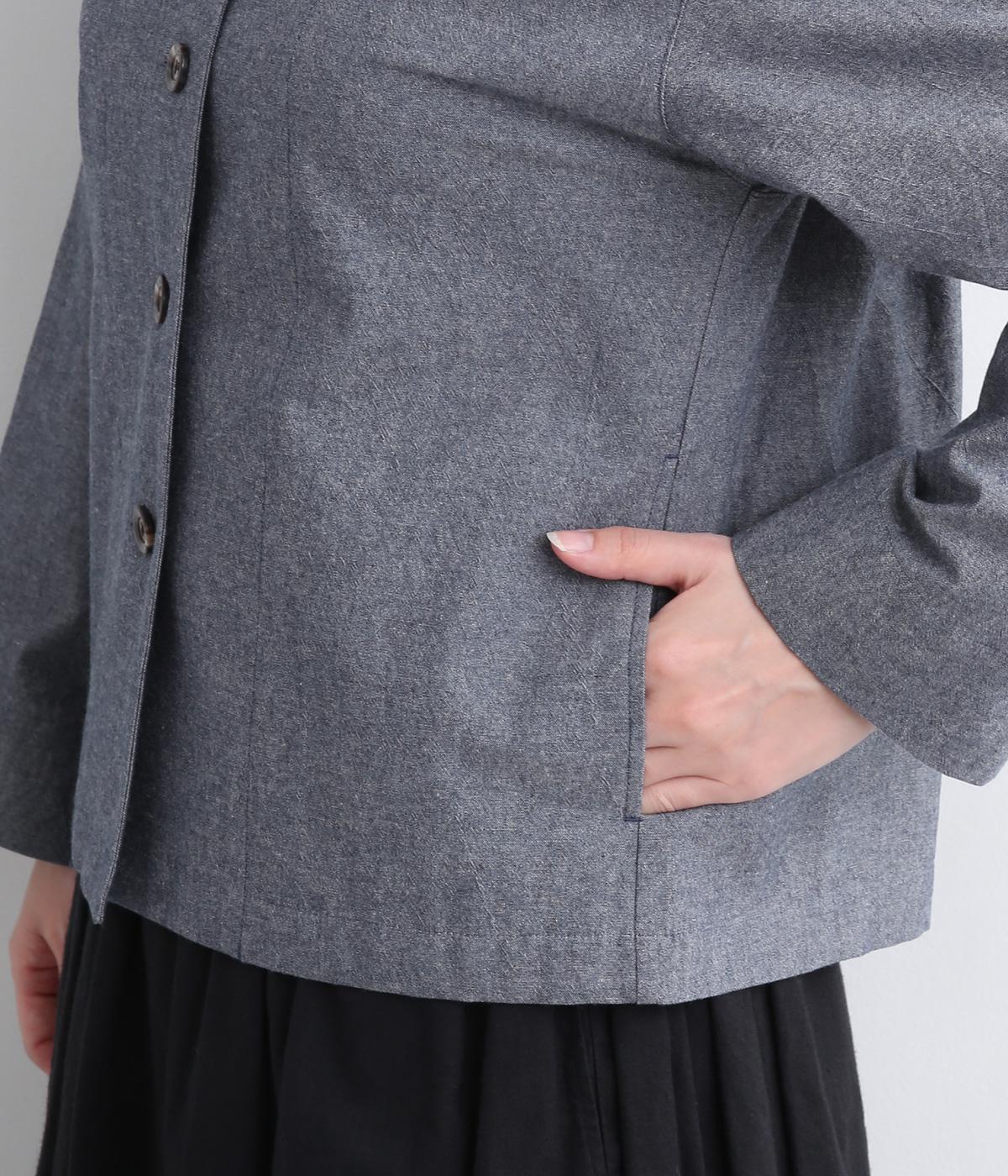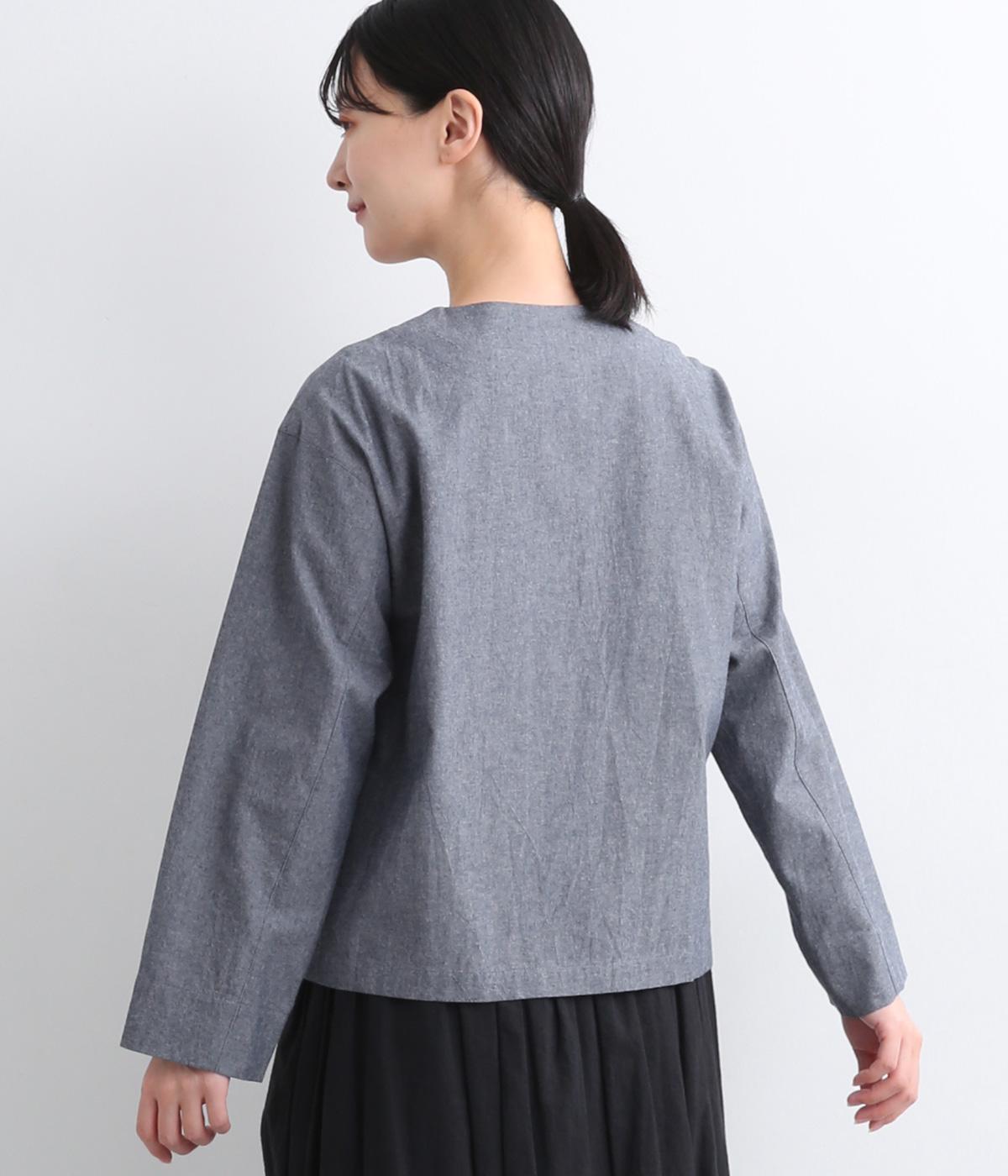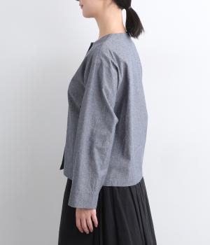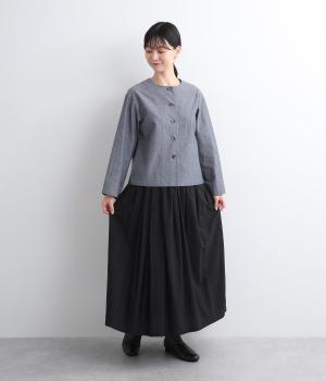 品のいいラウンドネックのノーカラージャケットを、ナチュラル素材でデイリー使いしやすく仕立てました。スタイリングしやすいすっきりとしたボックス型も◎。後ろ見返し部分にあてたリバティプリントが脱ぎ着したときにちらりとのぞいてワンポイントに。
