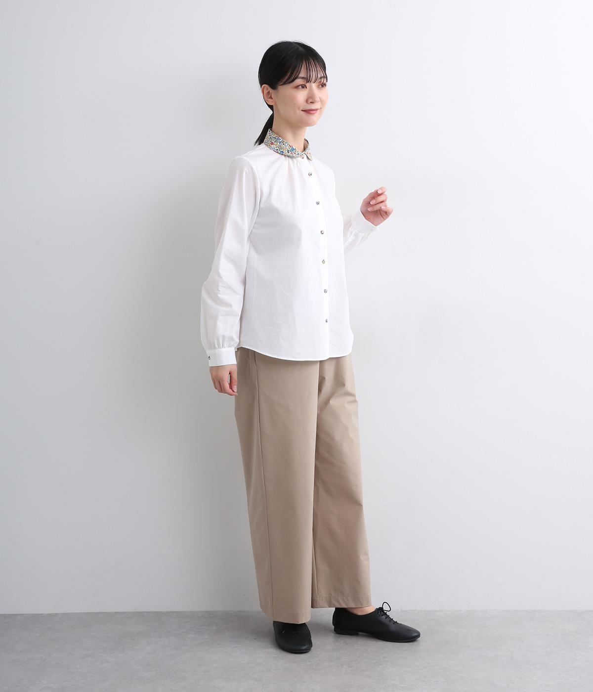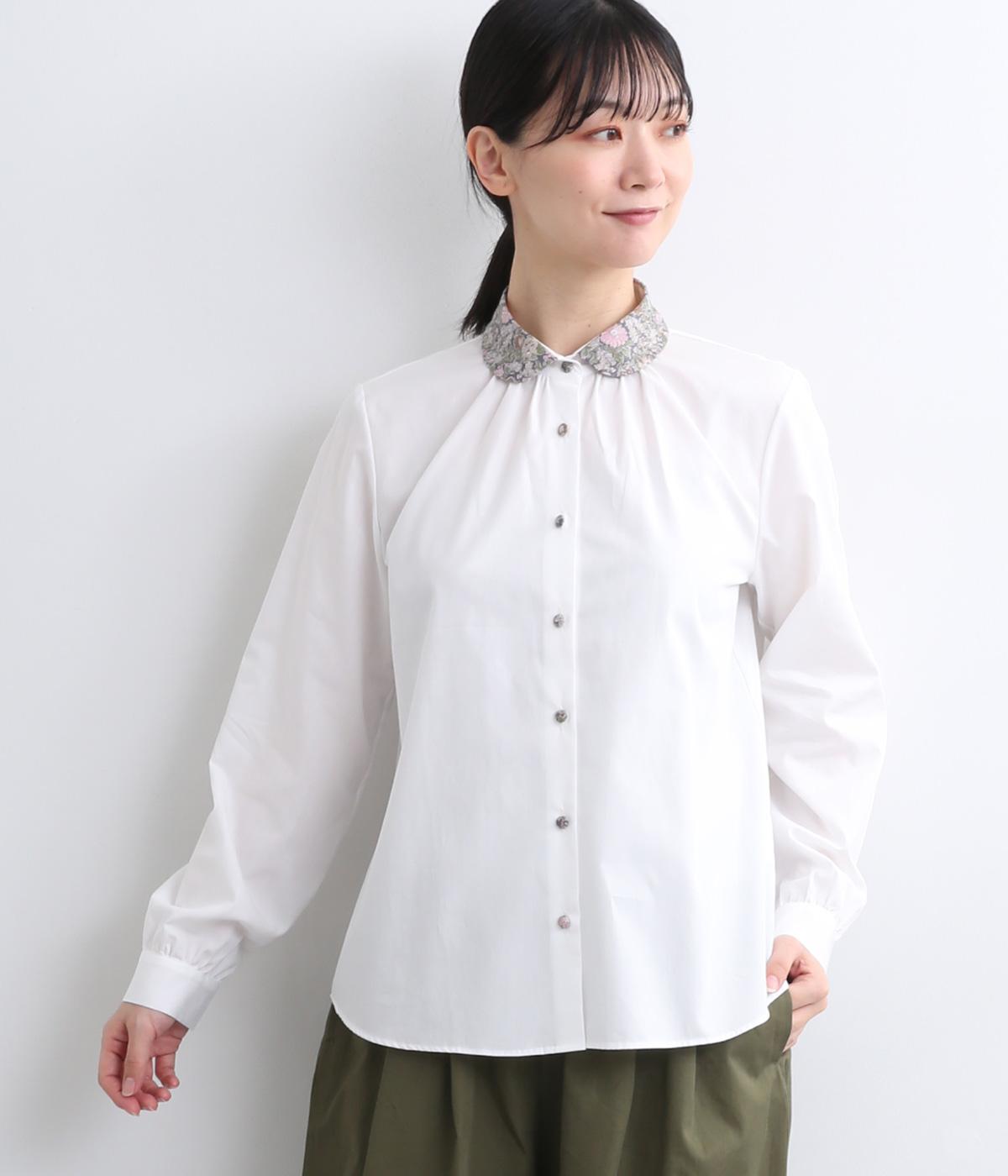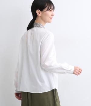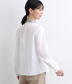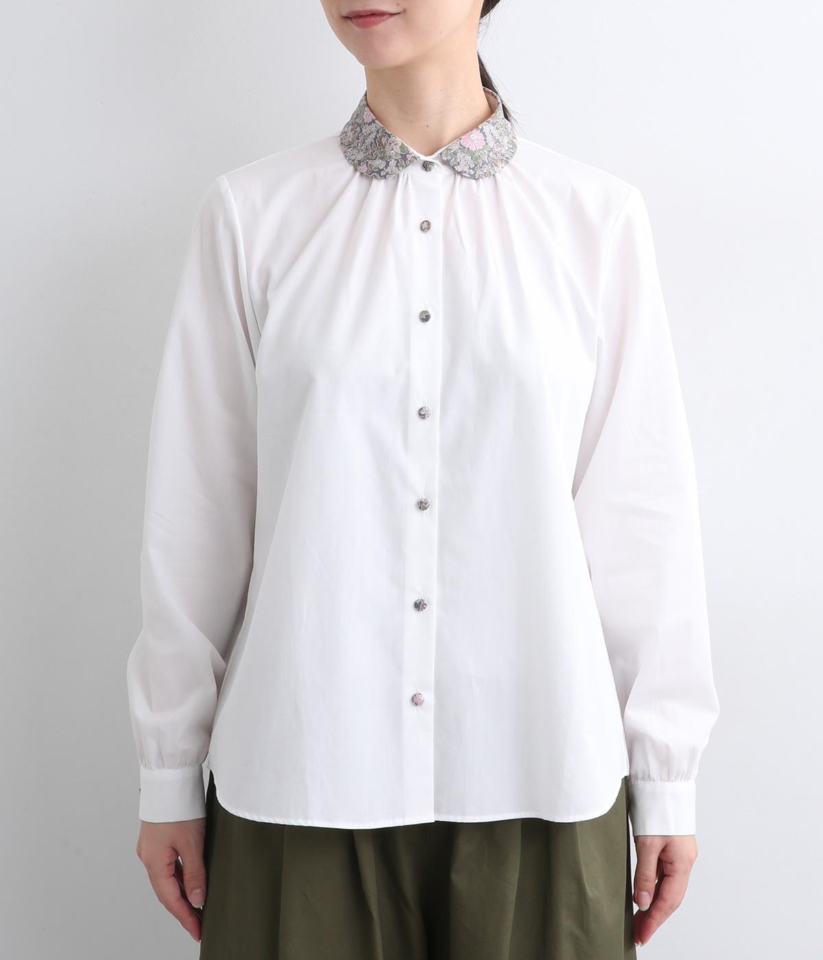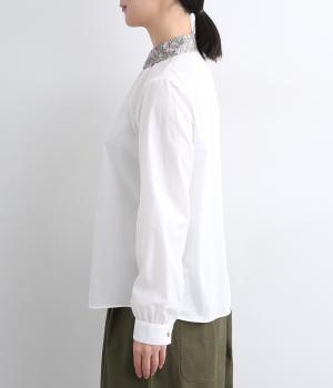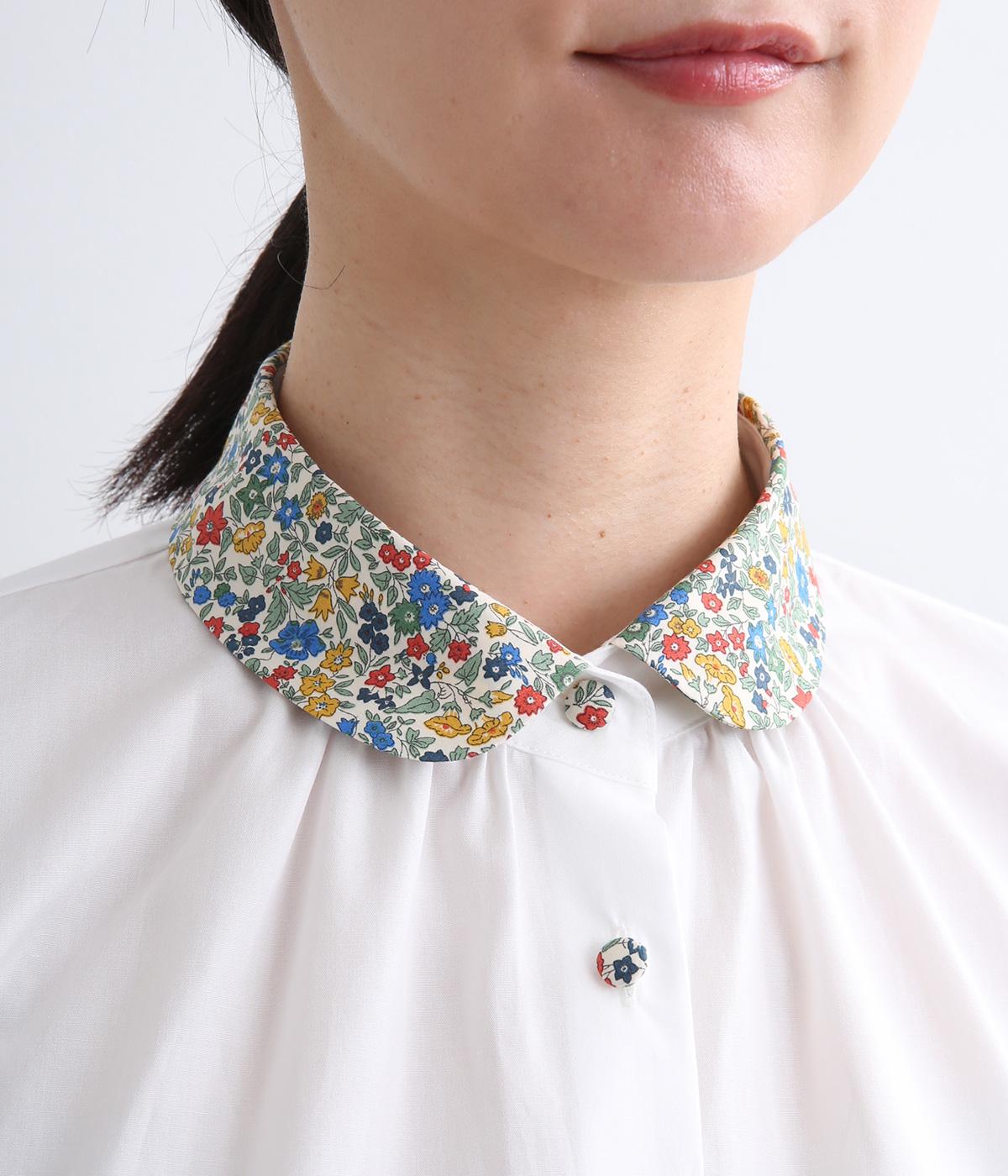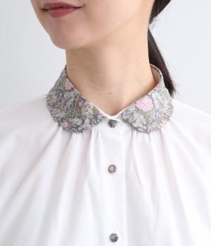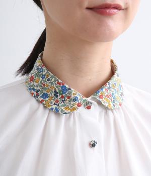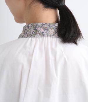 丸襟とくるびボタンにリバティプリント生地を配してデザインポイントにしています。襟ぐりにギャザーを寄せたベーシックなデザインでボトム合わせも困りません。袖カフスなどきちんと感のあるディテールも◎。