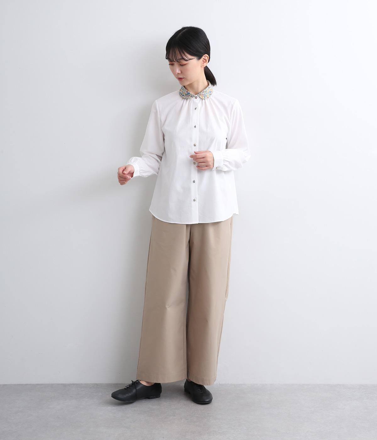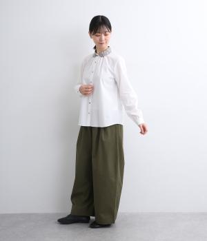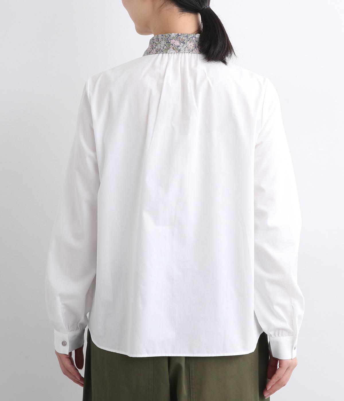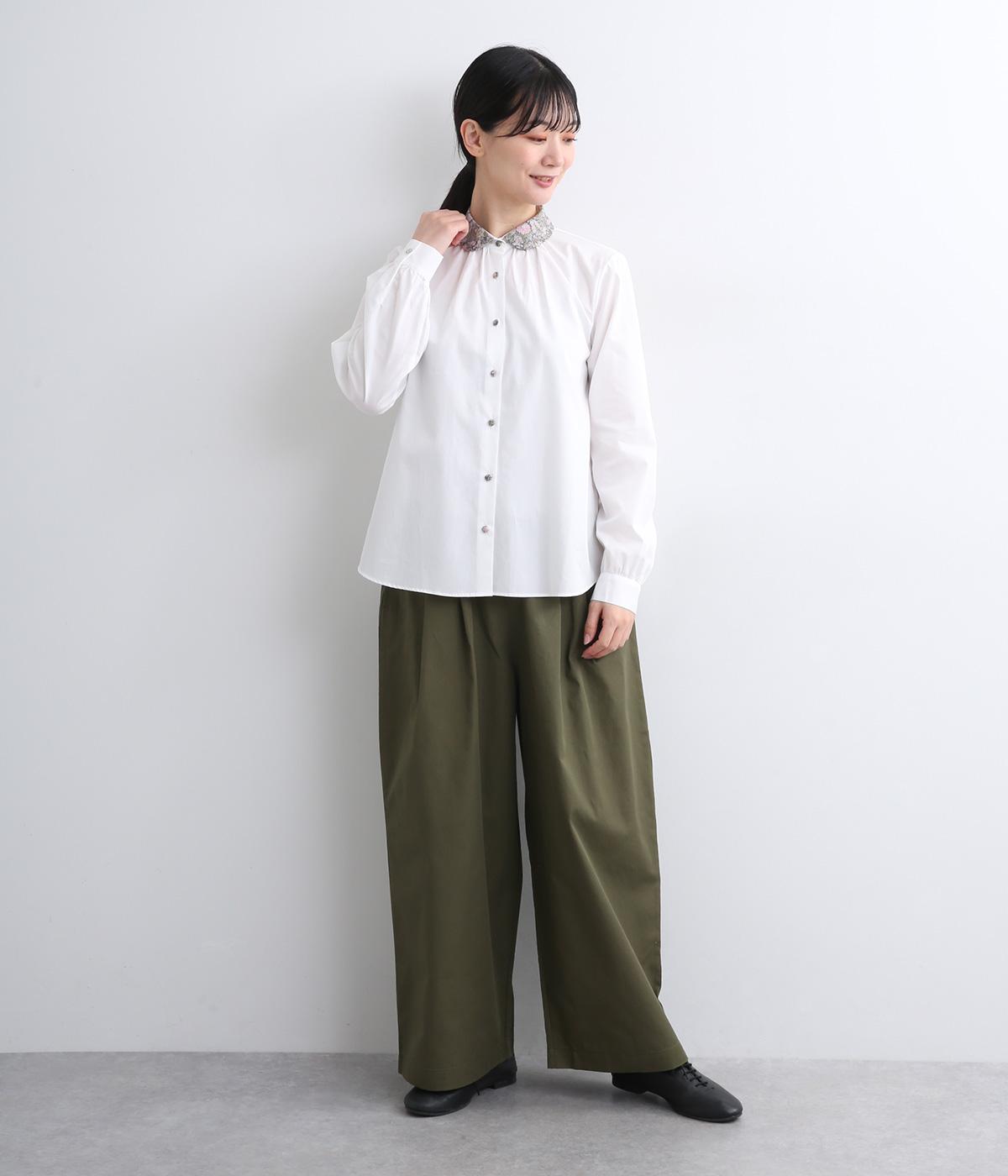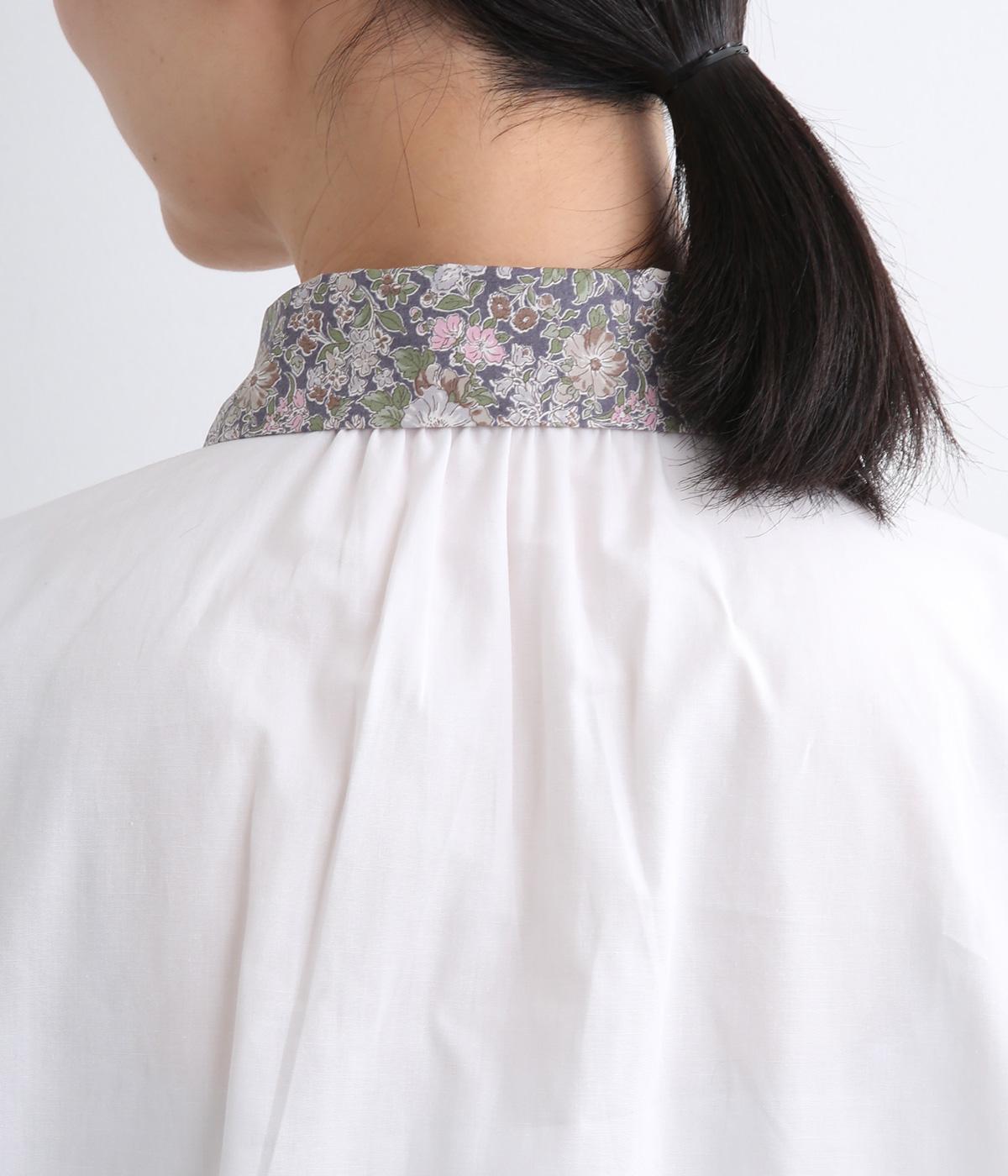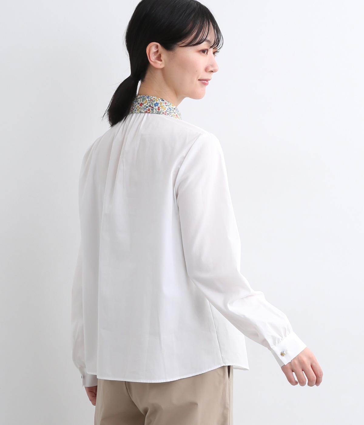 丸襟とくるびボタンにリバティプリント生地を配してデザインポイントにしています。襟ぐりにギャザーを寄せたベーシックなデザインでボトム合わせも困りません。袖カフスなどきちんと感のあるディテールも◎。