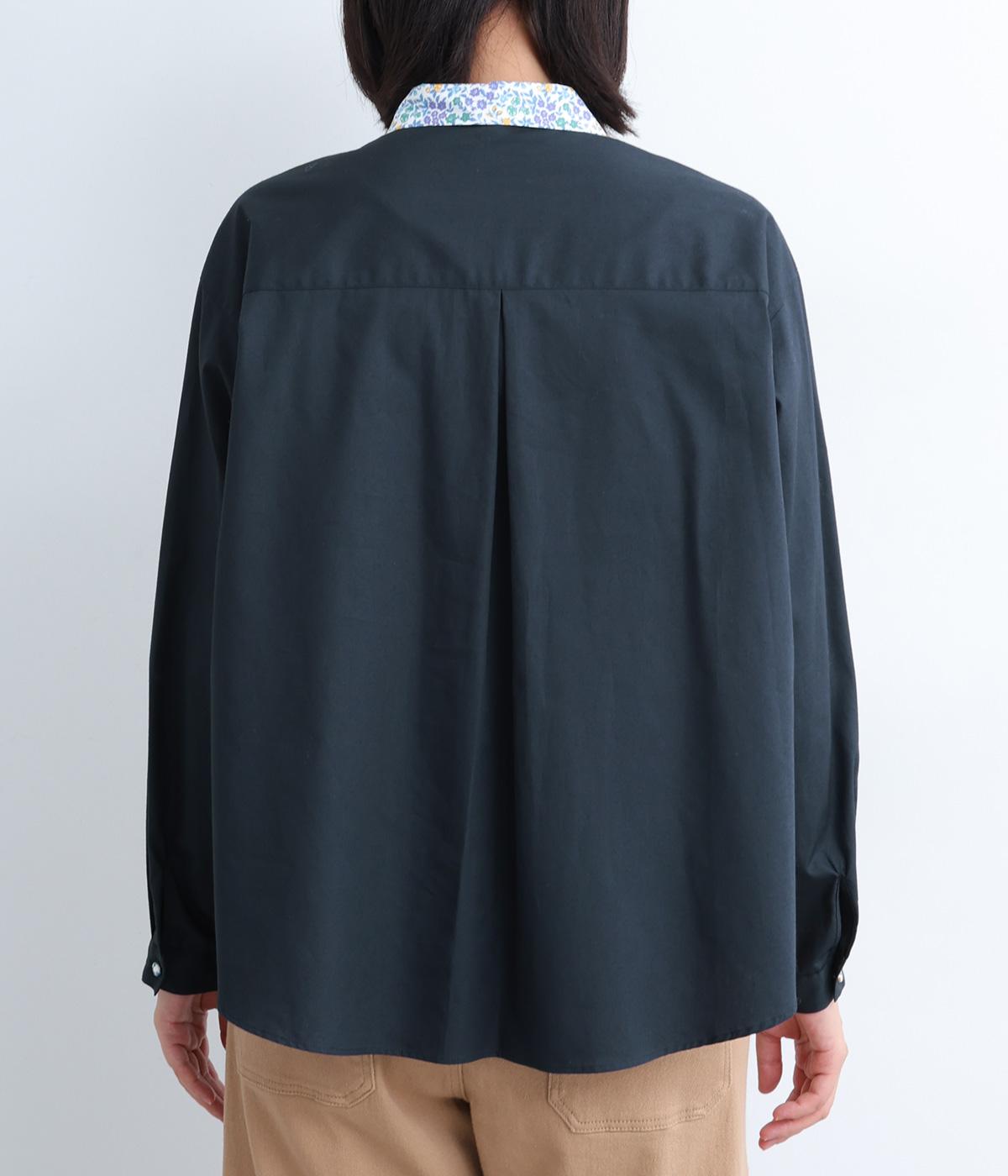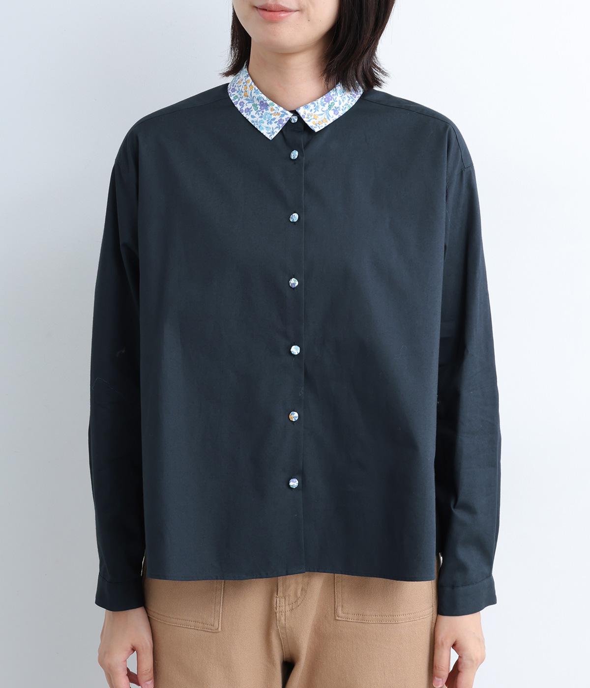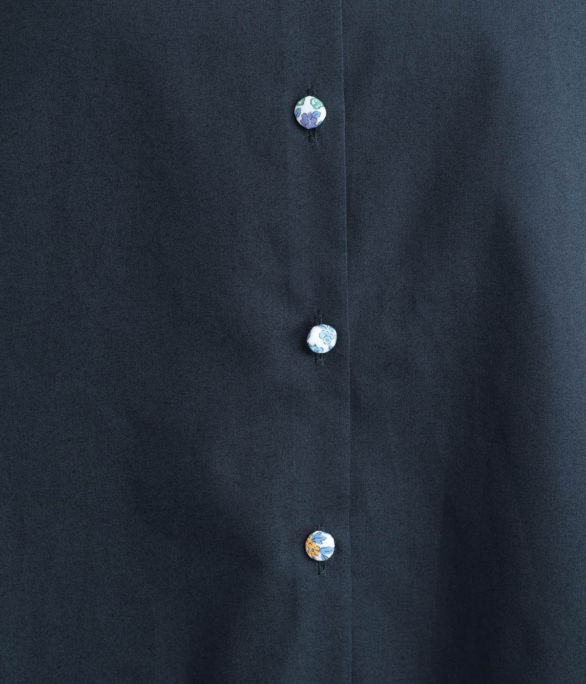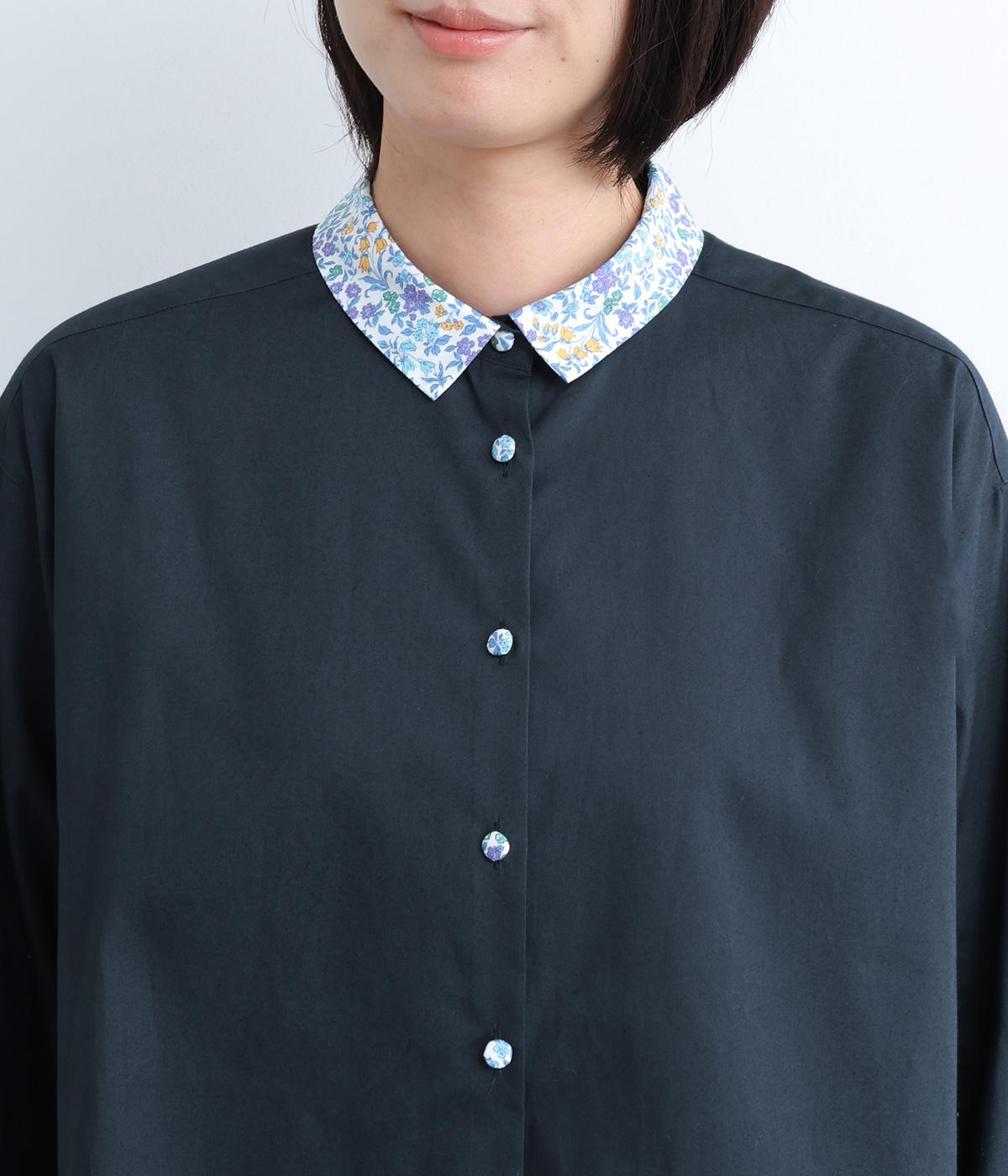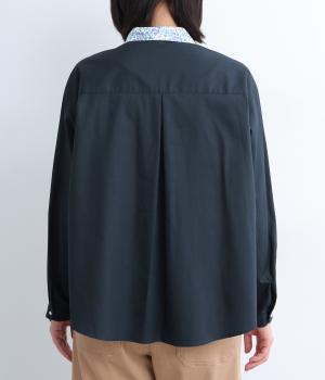 襟とくるみボタンにリバティ模様をほどこした、さりげない遊び心が光るシャツです。ゆったりとした身頃でリラックス感がありつつ、前後差を持たせた裾ですっきりと見せます。きちんと感にさりげなく個性を添える一枚です。