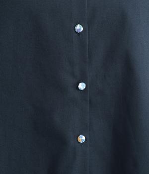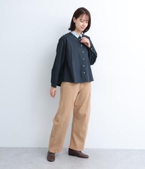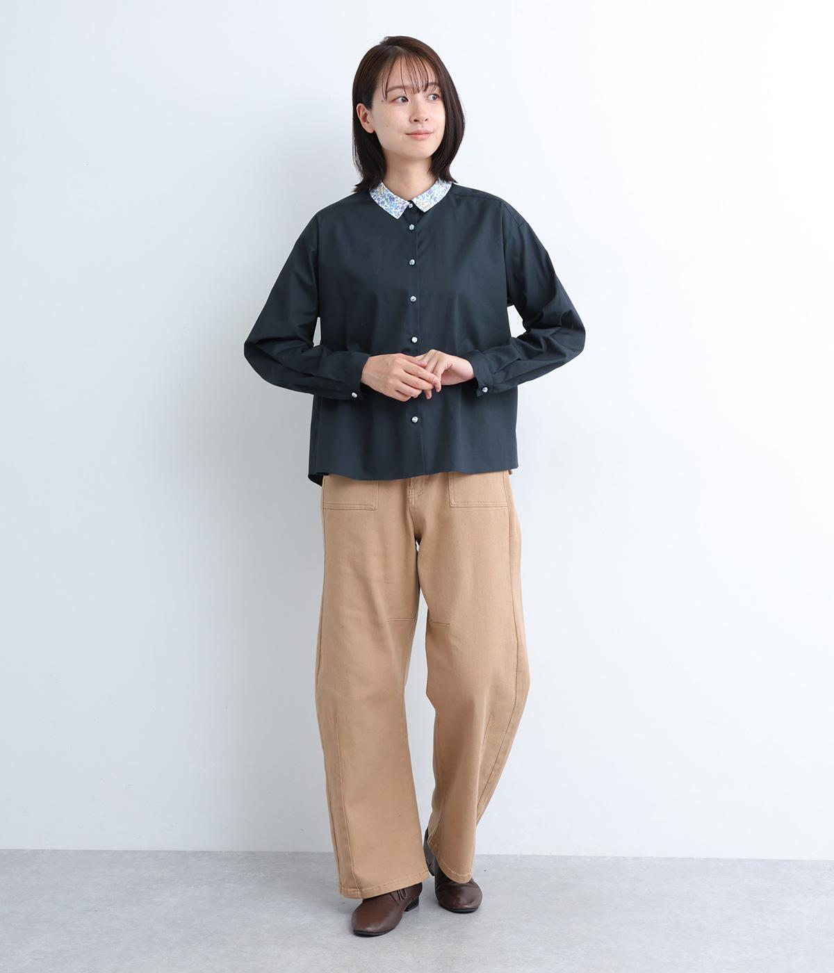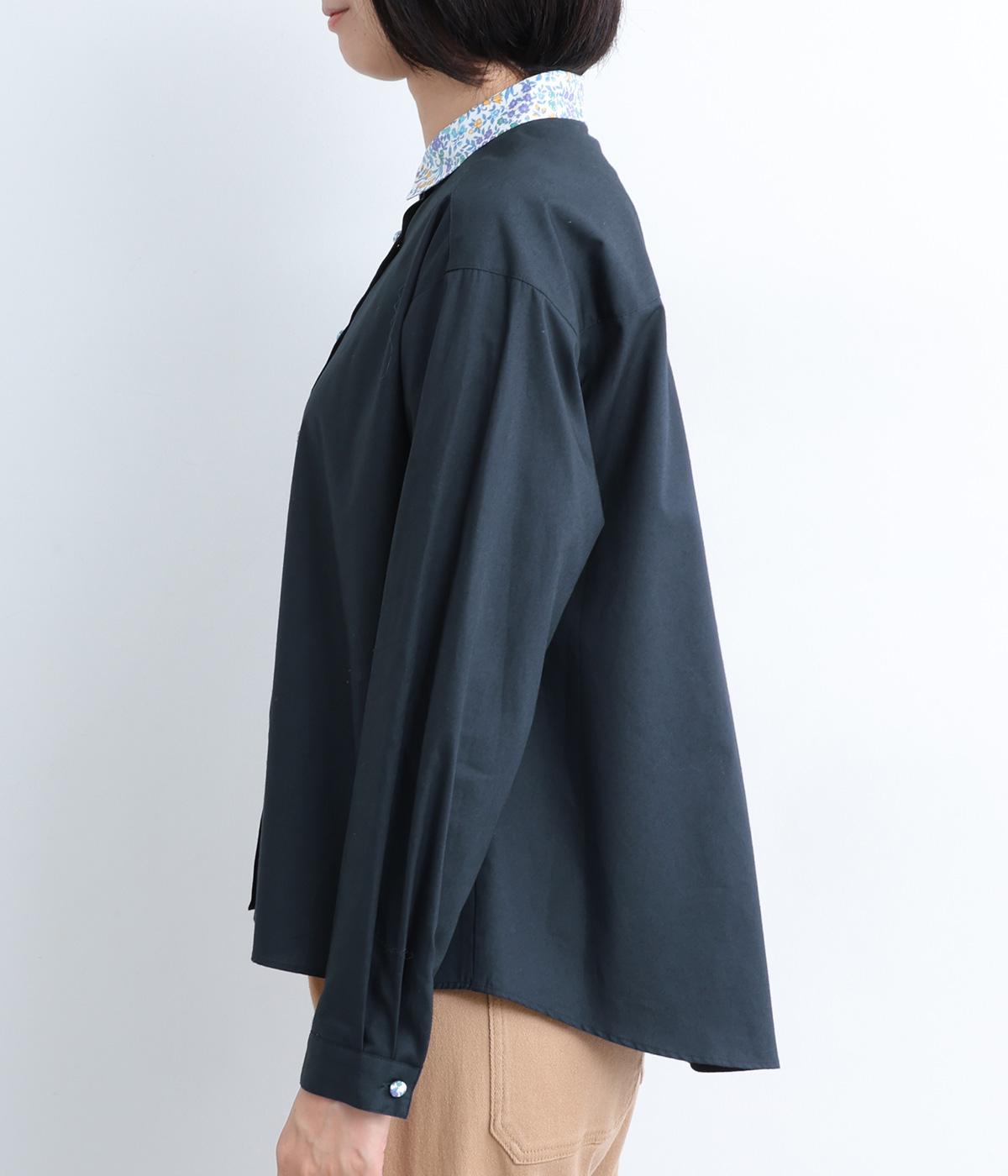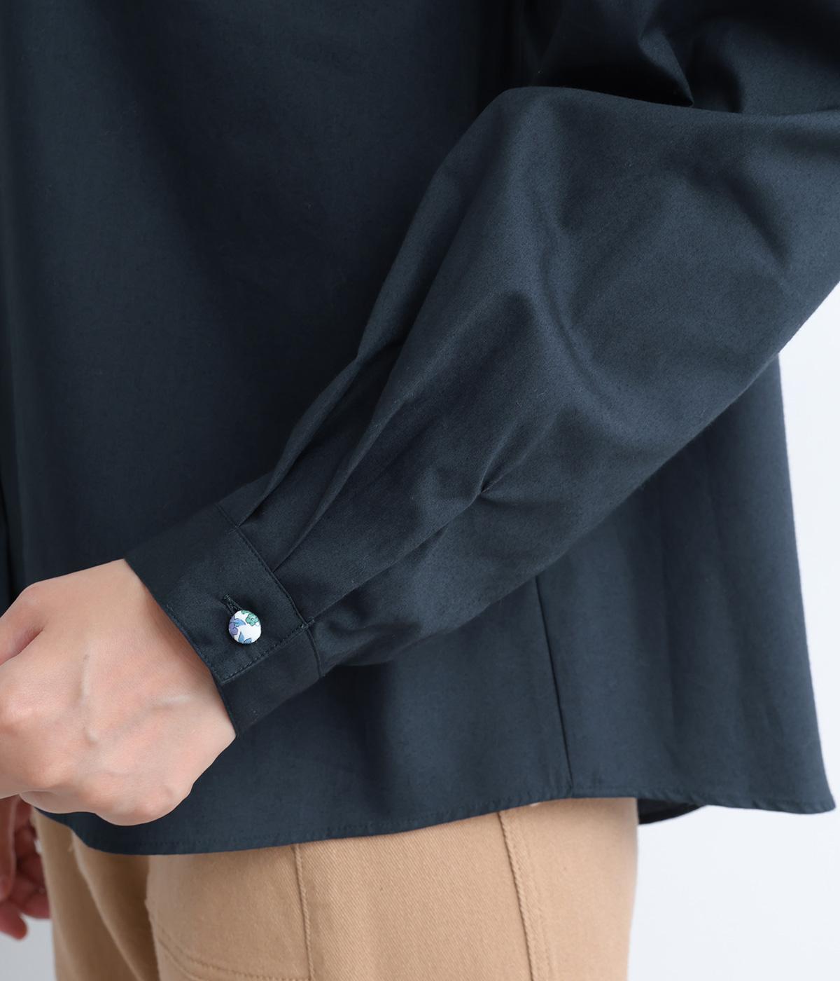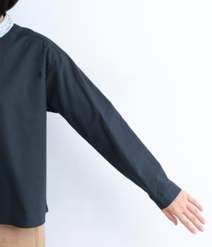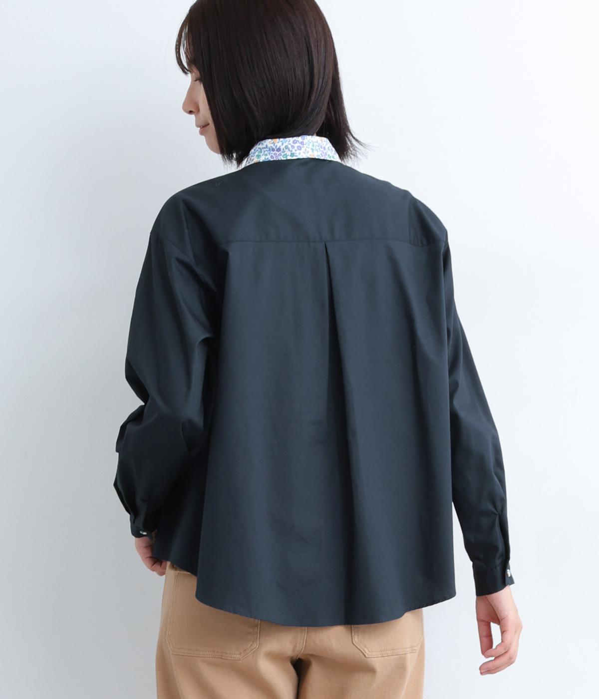 襟とくるみボタンにリバティ模様をほどこした、さりげない遊び心が光るシャツです。ゆったりとした身頃でリラックス感がありつつ、前後差を持たせた裾ですっきりと見せます。きちんと感にさりげなく個性を添える一枚です。