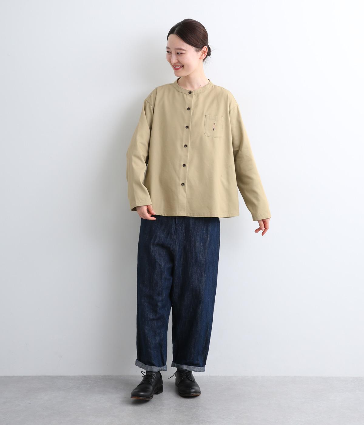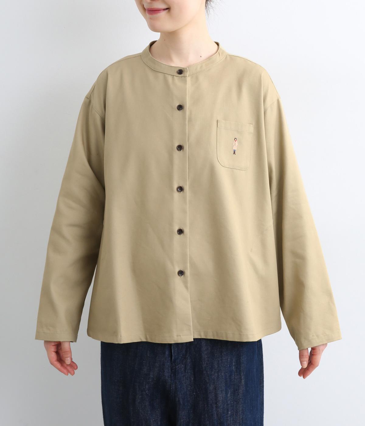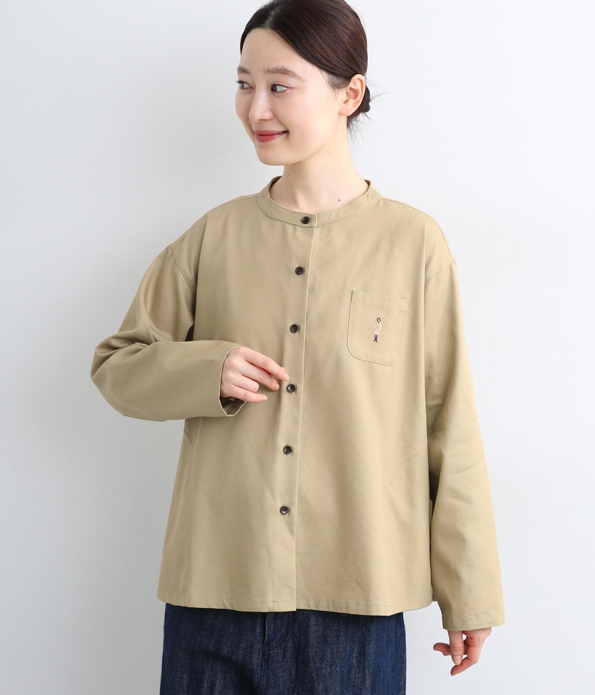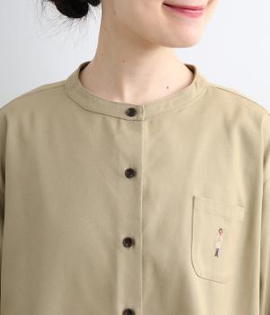 左胸元のポケットにほどこされた「コートを着た女の子」の刺しゅうが目を惹くシャツです。ややフレアなシルエットにバンドカラーがバランスよく、羽織りとしても重宝します。シルエットをきれいに描く生地で、きちんと感も◎。