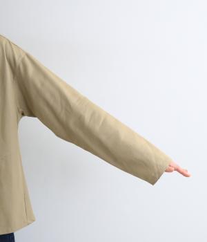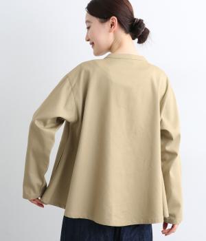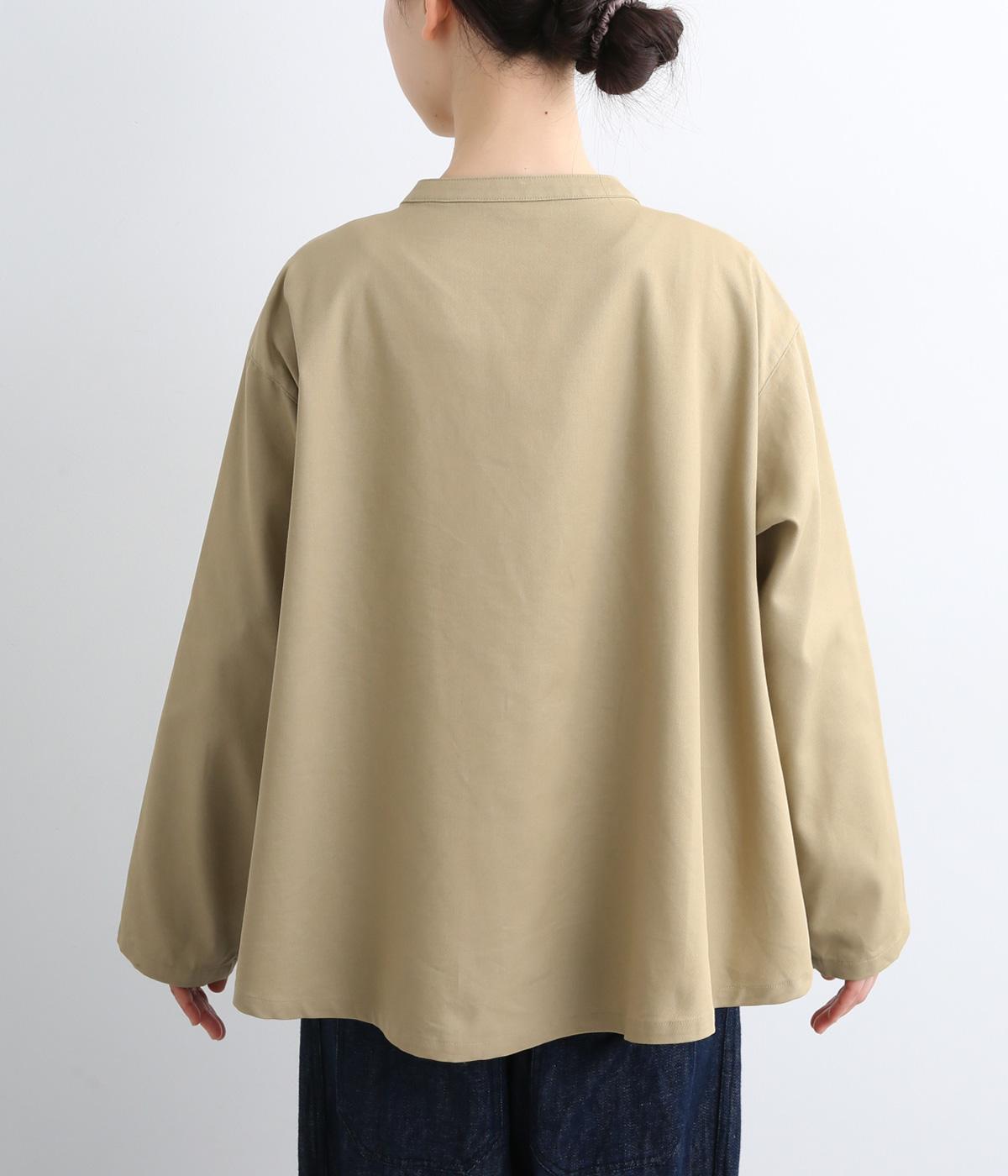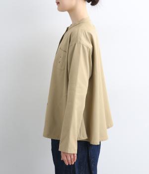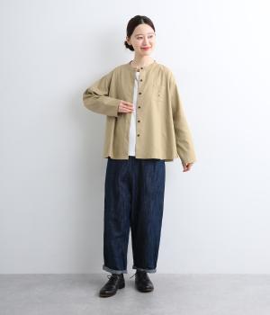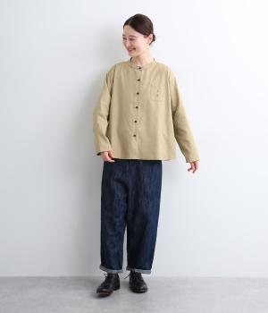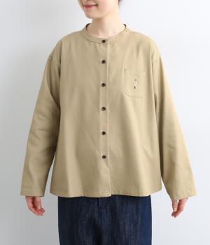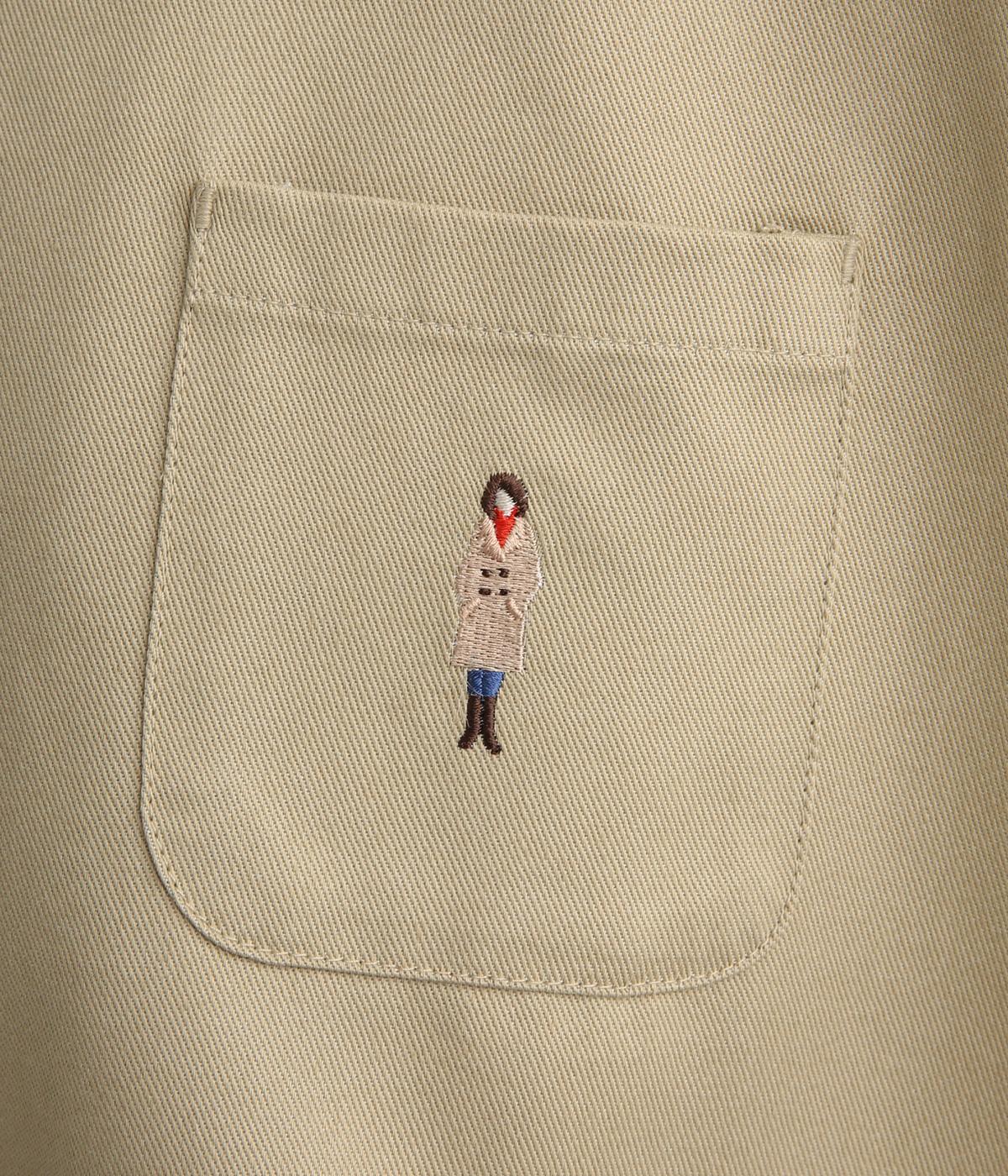 左胸元のポケットにほどこされた「コートを着た女の子」の刺しゅうが目を惹くシャツです。ややフレアなシルエットにバンドカラーがバランスよく、羽織りとしても重宝します。シルエットをきれいに描く生地で、きちんと感も◎。