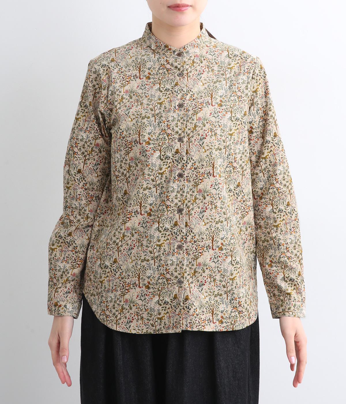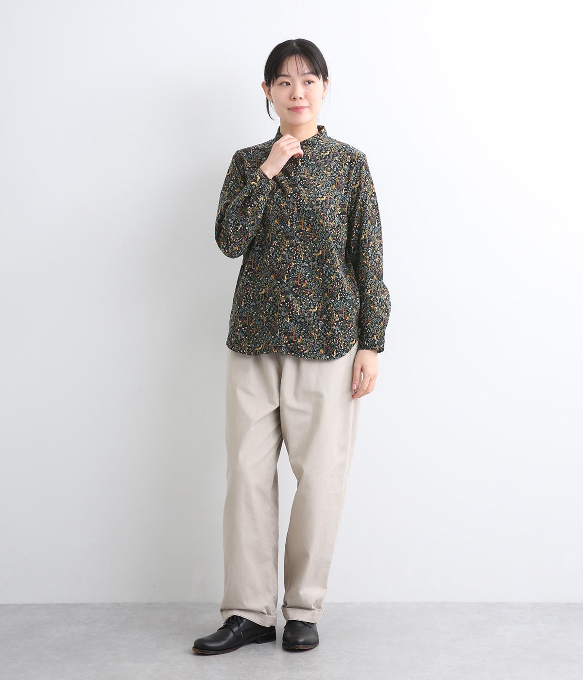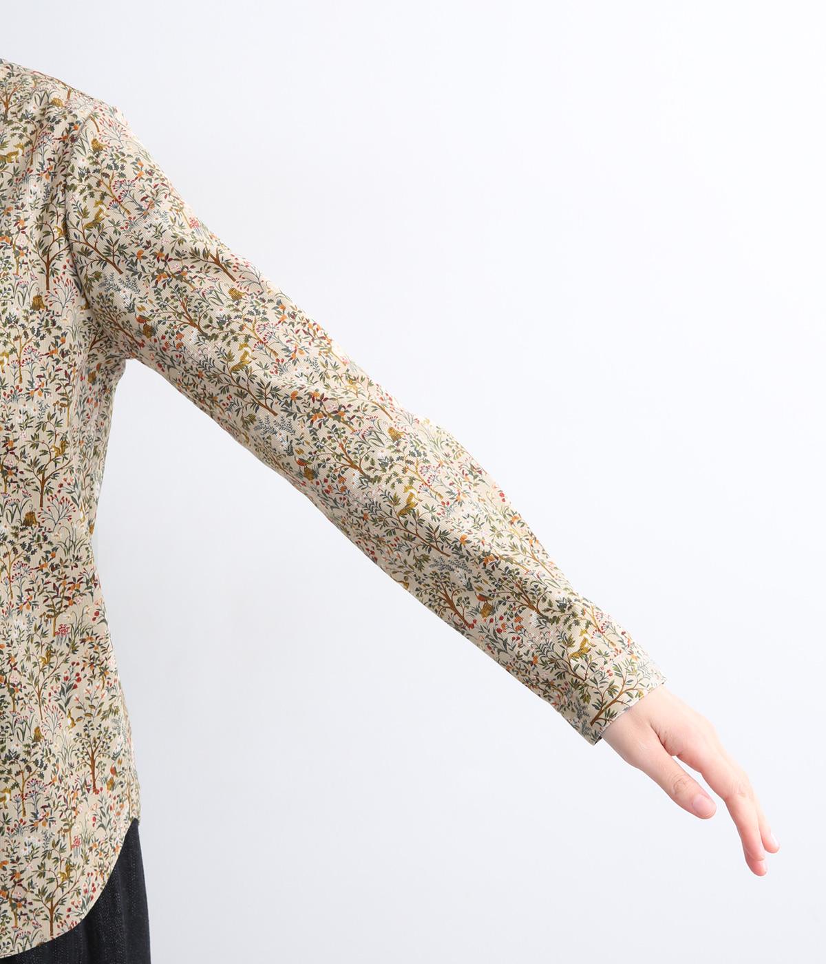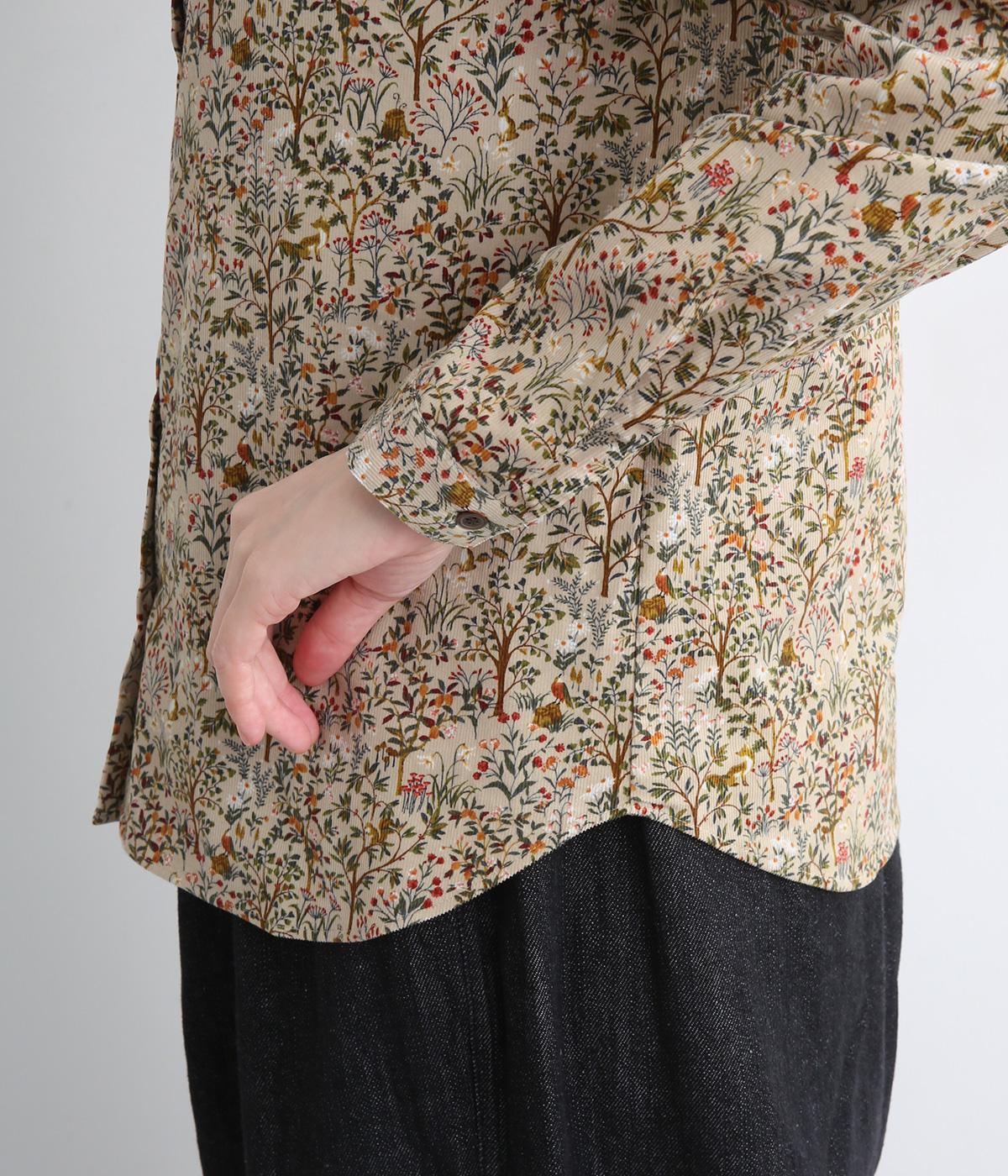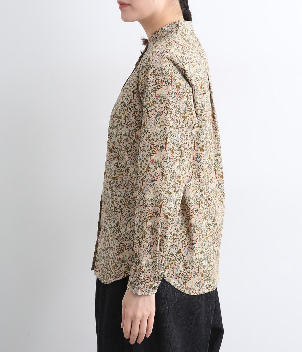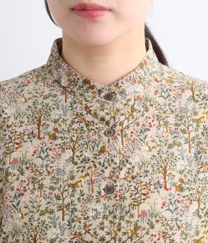 森と動物たちの細やかな柄は、ほっこりムードで癒し効果抜群。シルエットはシンプルに、小さめのスタンドカラーですっきりと仕上げました。着丈が少し長めなので、トップスインしたときにもたつきにくくなっています。