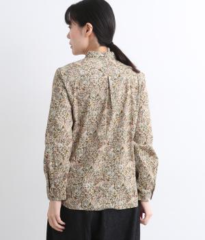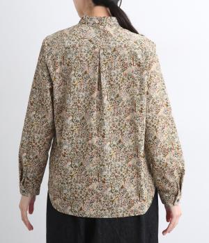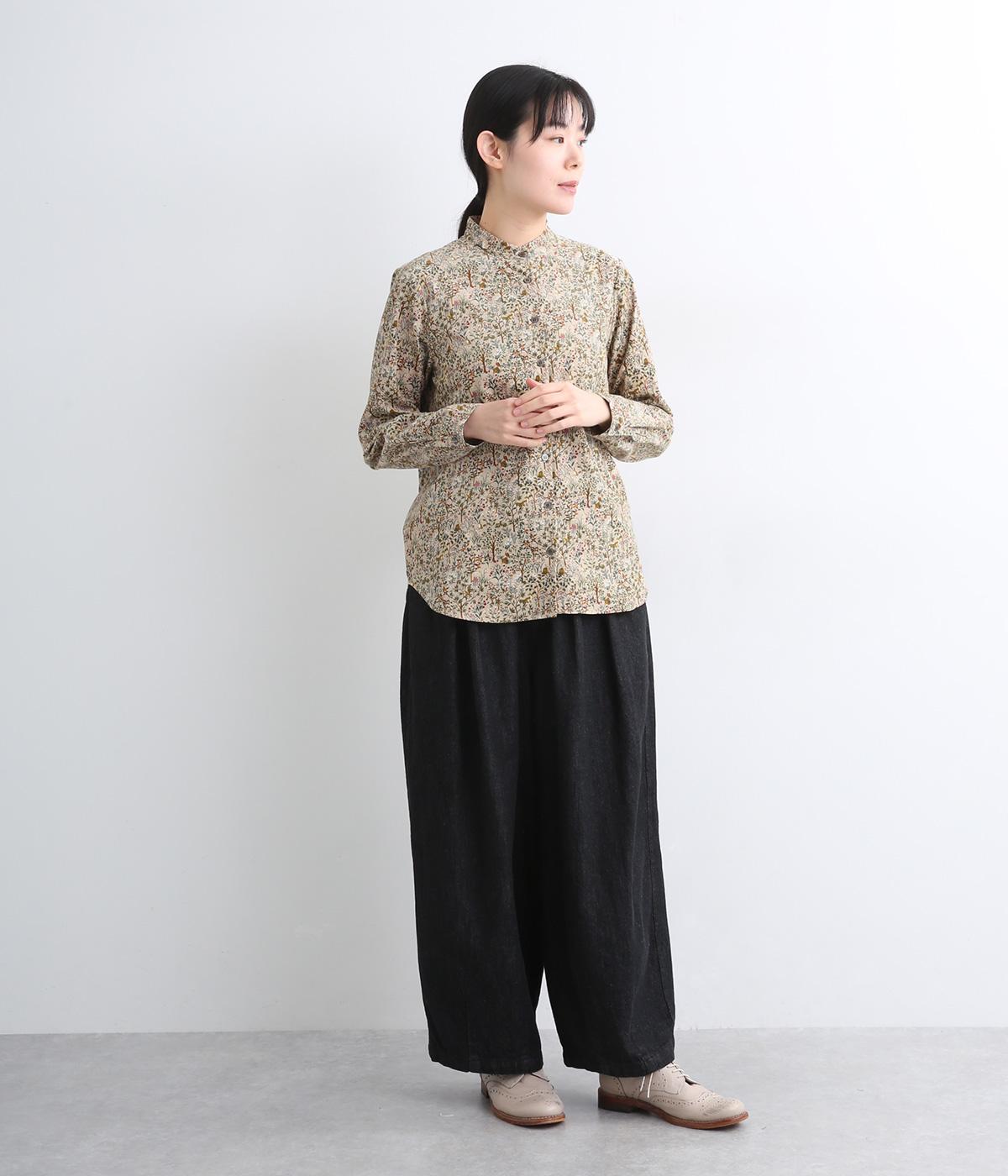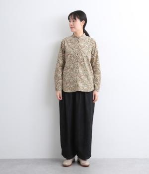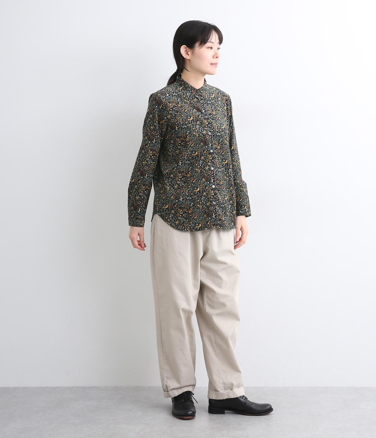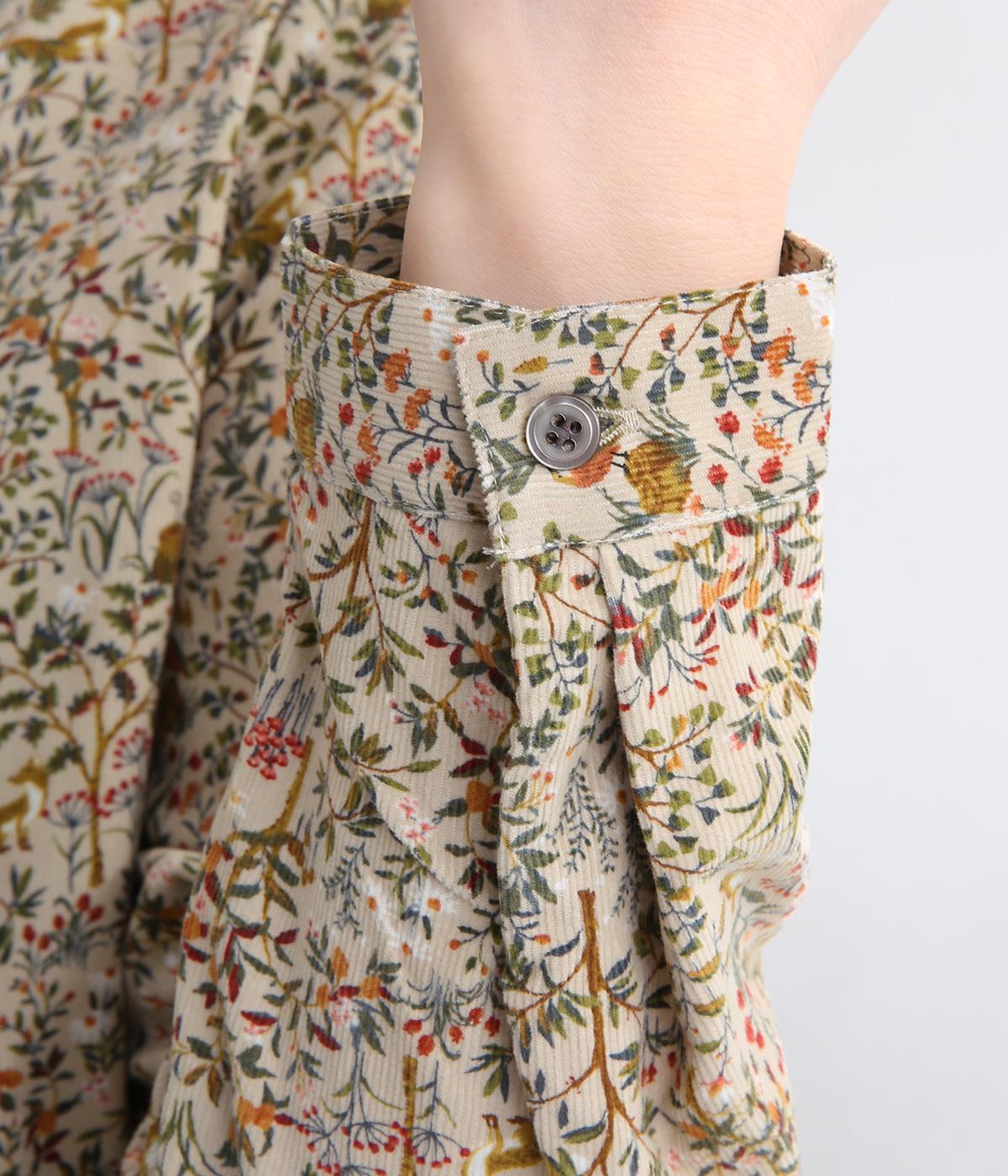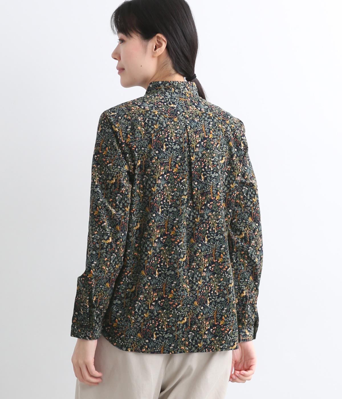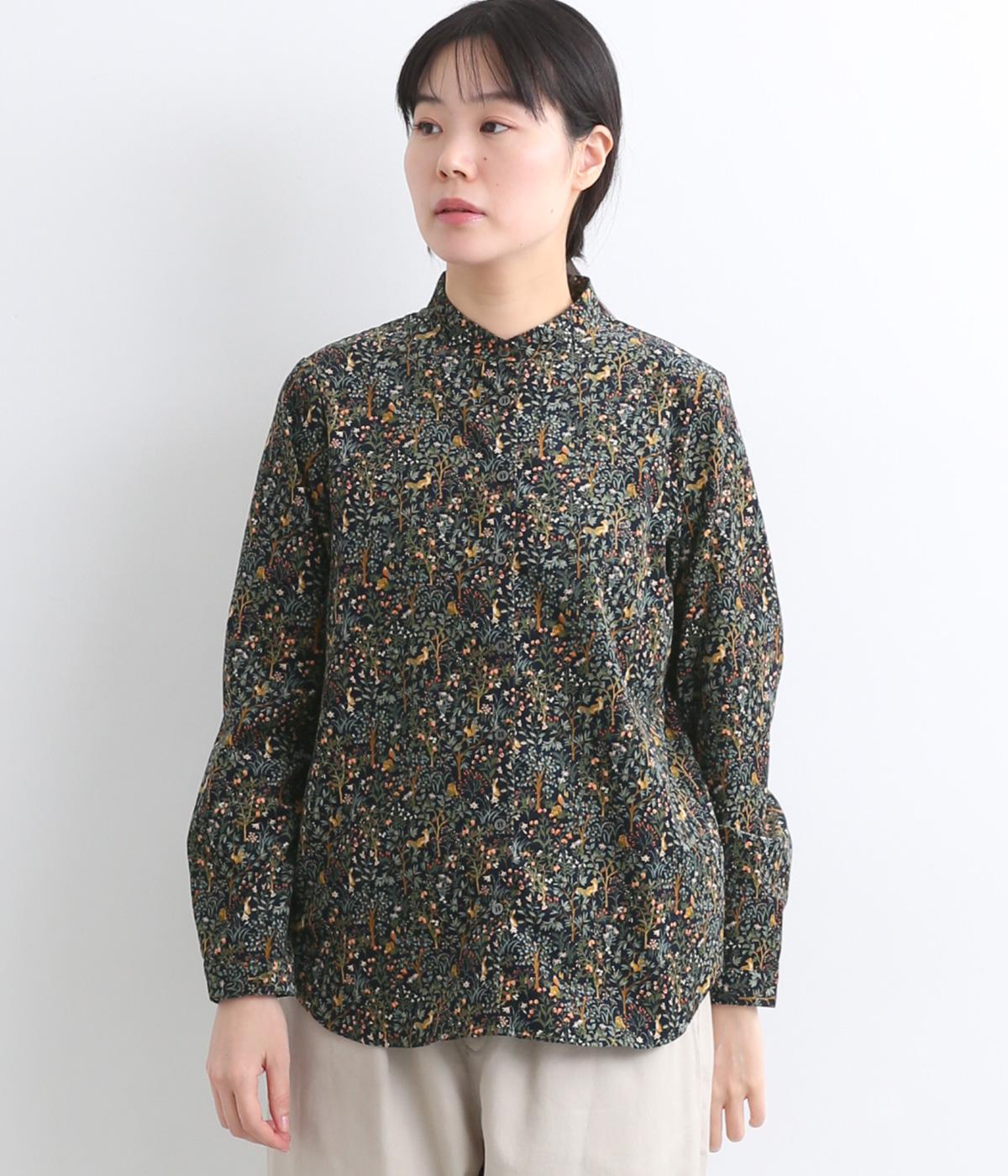 森と動物たちの細やかな柄は、ほっこりムードで癒し効果抜群。シルエットはシンプルに、小さめのスタンドカラーですっきりと仕上げました。着丈が少し長めなので、トップスインしたときにもたつきにくくなっています。
