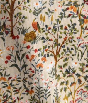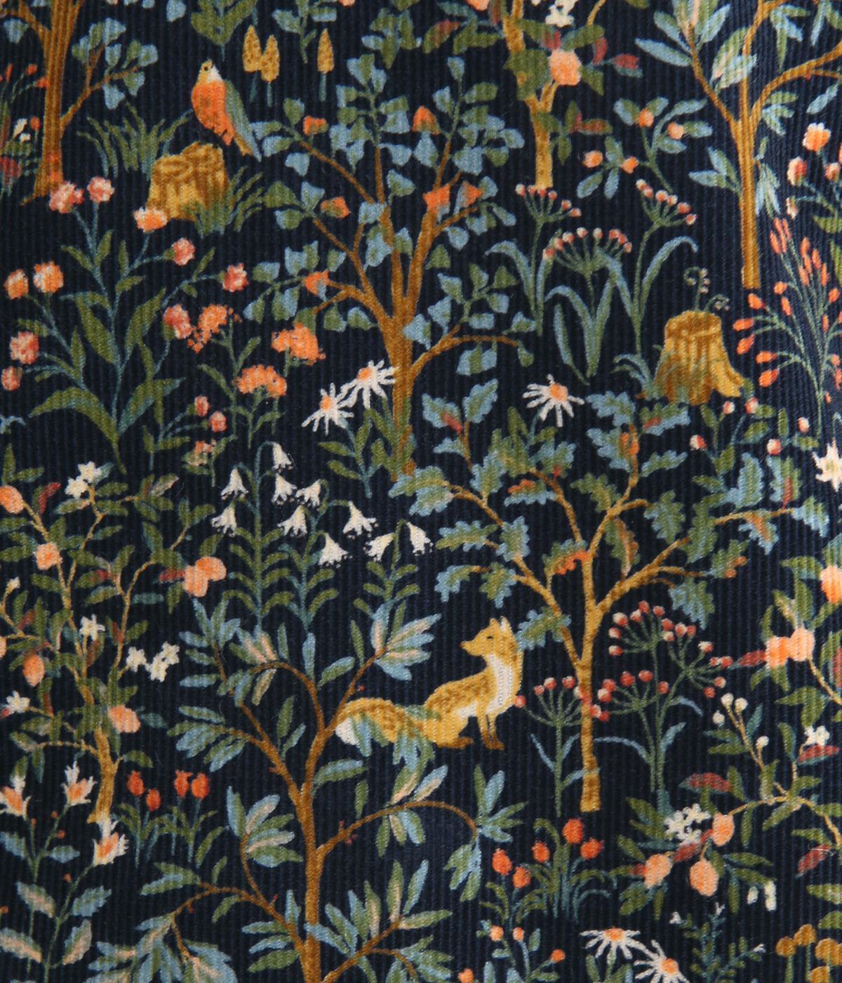 コットン100%のコーデュロイ生地に、森と動物の柄をプリントしました。細畝なのでやわらかく、なめらかな肌ざわりで着心地がいいです。