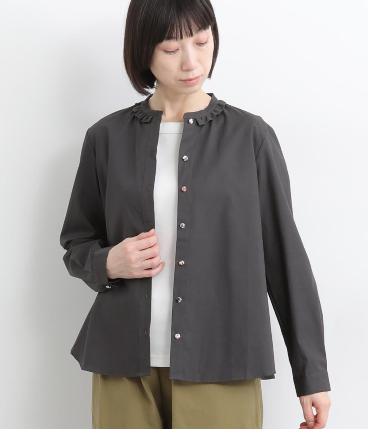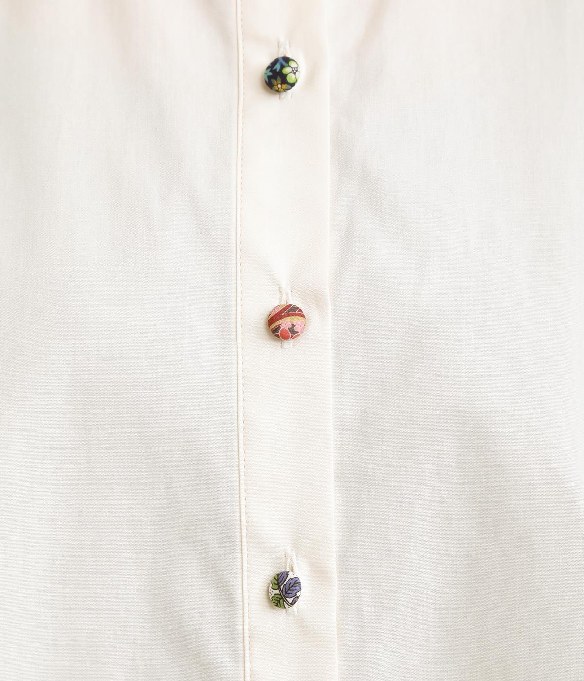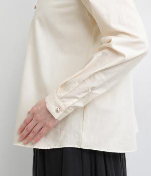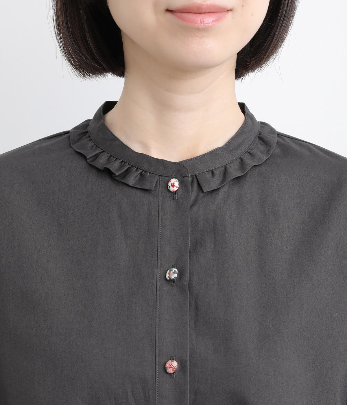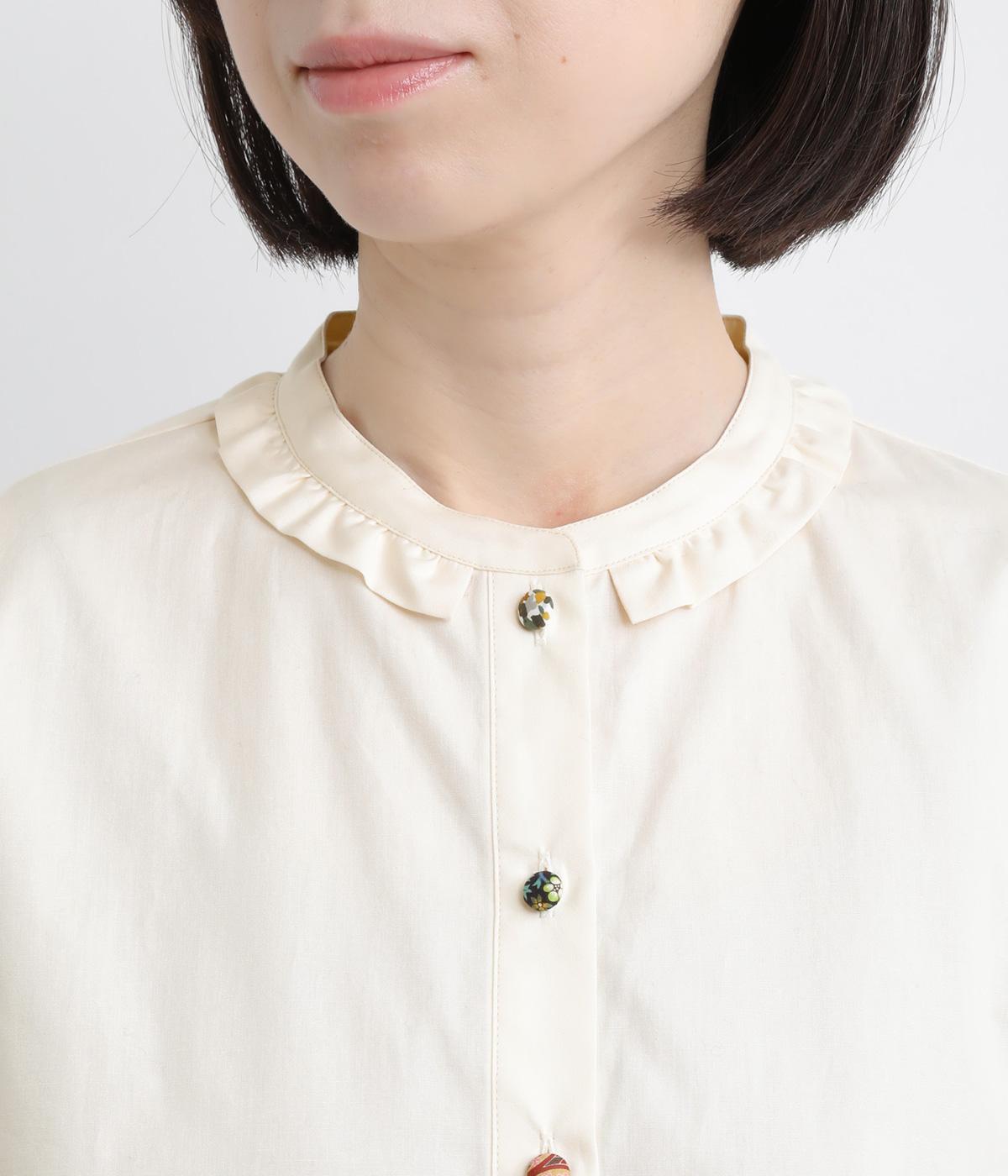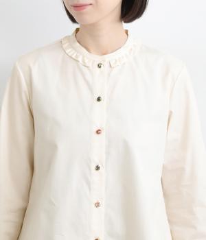 女性らしいノーカラーに細幅のフリルを添え、ほどよい甘さと上品さのある印象に仕上げました。リバティプリントのくるみボタンがアクセントとなり、シンプルなデザインに可憐な彩りをプラス。タックを寄せた袖口が自然なボリュームを生み、ゆったりとした着心地ながら美しいシルエットを叶えます。